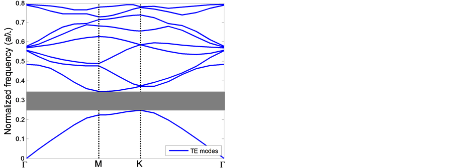Figure 2. TE (blue lines) band structure for (a) a triangular lattice of Si (eb = 11.7) rods in KCl (ea = 1.804) and (b) a triangular lattice of Si (eb = 11.7) rods in KCl (ea = 1.873)