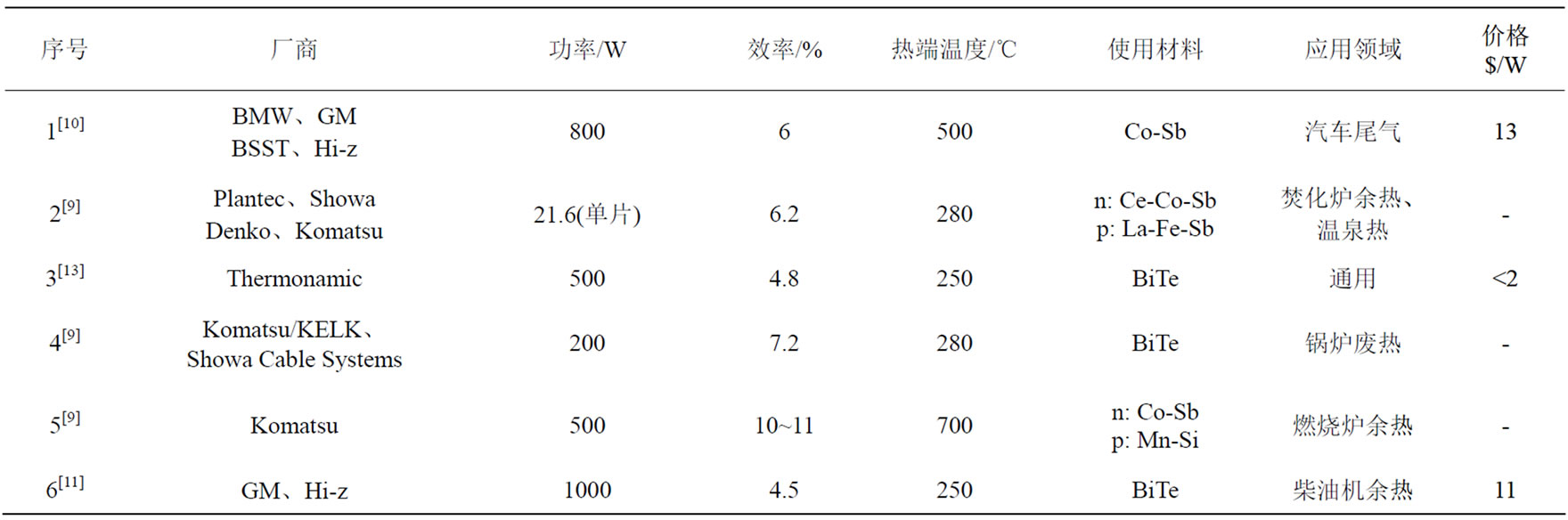 目前大功率温差发电技术最主要的应用是余热回收,其中最具代表性的是汽车尾气温差发电,此外还包括工业中高温余热的回收利用。美国能源部、日本宇宙航天局等发达国家的相关部门都将热电技术列入中长期能源开发计划。为了开发温差发电技术,促使其成熟并进行量产,日本政府推出了“固体废物燃烧能源回收研究计划”[10]。从2003年起美国就开始支持多个实验室开展高性能热电材料和应用技术的研究,尤其是工业余热的利用。美国的通用、福特,德国的宝马等多家大型汽车公司,均设立了汽车尾气废热回收的项目并取得了一定的成绩[11]。图1列举了一些国际上比较具有代表性的集中利用温差发电