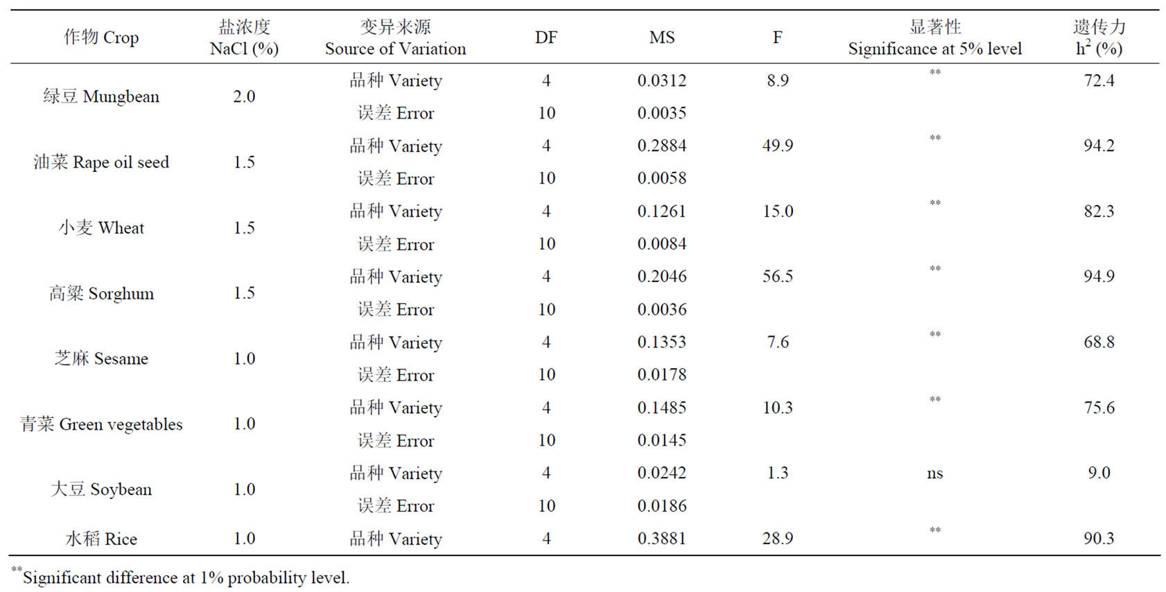 同一作物不同品种耐盐性差异结果分析表明,大多数作物在半致死盐浓度下品种之间耐盐性差异极显著(表4),而且耐盐性遗传力较高,表明作物耐盐性主要受品种自身遗传控制。说明可以通过遗传改良进一步提高作物的耐盐性。水稻两个亚种之间耐盐性表现出差异,籼稻较粳稻耐盐,与陈志德等的研究结果相似[14]。因此,拟在本研究的基础上,进一步开展大规模种质耐盐性鉴定,筛选出耐盐作物中的耐盐种质,为耐盐基因资源的发掘与作物耐盐性的遗传改良提供基础材料。