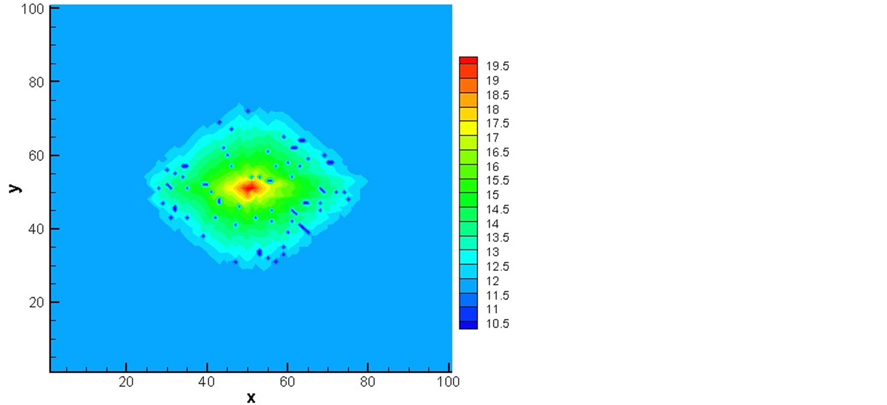图1和图2分别为液体流动图和压力分布变化图。图1表示液体从注入点渗入多孔介质后的情形,图2表示液体在流动过程中的压力响应,可以看出在注入点附近压力梯度较大,而离注入点越远的区域,压力梯度越小。我们还可以看到液体渗透的过程中,气体逐渐被压缩,压力逐渐增大,当气体压力与水头压力相等时,渗透过程达到稳态。