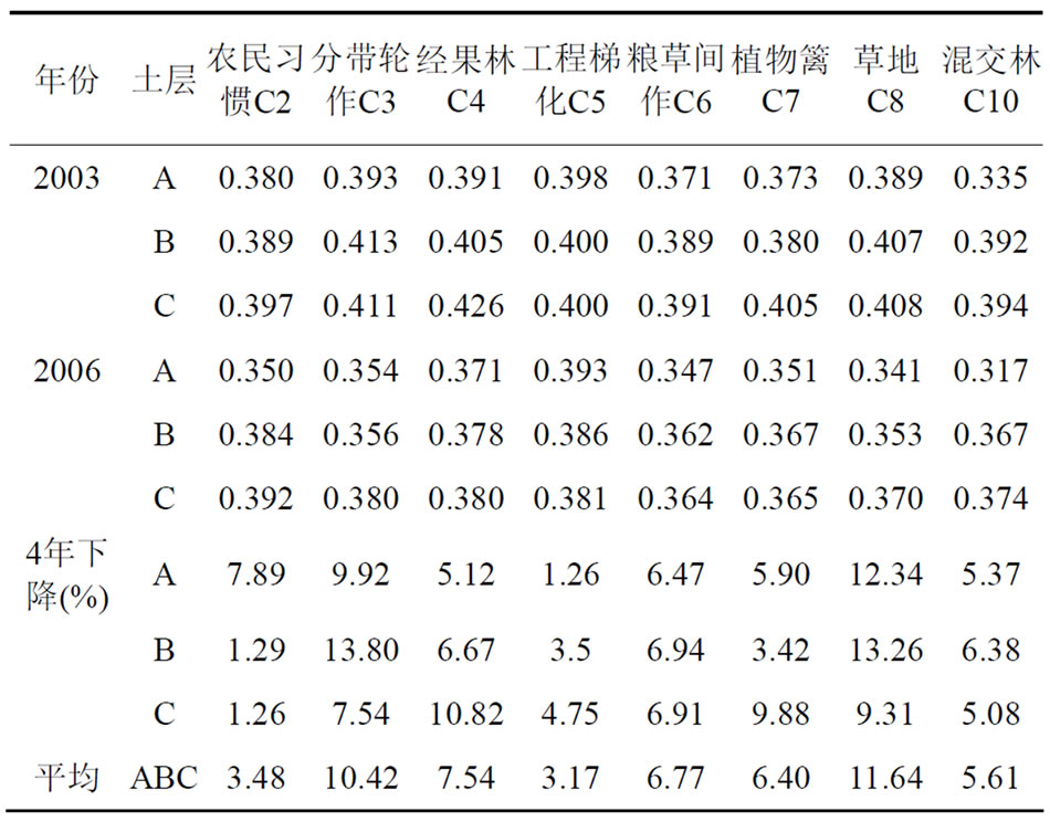 3) 通过4年不同种植制度和利用类型的影响,坡耕地不同土层的K值都下降,A、B、C三层平均下降3.17%~11.64%。不同种植制度和利用类型坡耕地K值下降幅度不一样,除工程梯化处理外,草地、分带轮作、经果林、粮草间作、植物篱、混交林处理的K值下降幅度都高于农民习惯,下降幅度从高到低的排列顺序是草地 > 分带轮作 > 经果林 > 粮草间作 > 植物篱 > 混交林。