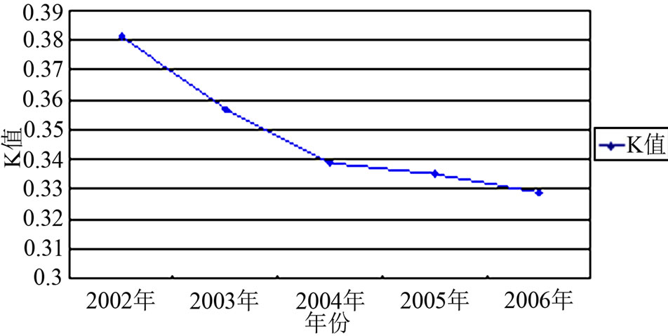 土壤的A层是整个土体最为活跃的土层,最受各种因素影响,又是最受关注的层次,因此对该土壤A层的K值进行动态监测。用公式(2)(Sharply A.与Williams J. R.在EPIC模型中提出的计算公式)计算2002年~2006年裸地A层土壤K值,用Excel 2003作图(见图1),结果显示,红黄壤坡耕地A层的K值随着年份的增长,呈下降的趋势。经过4年,红黄壤坡耕地A层的K值下降13.65%,平均每年下降3.41%。