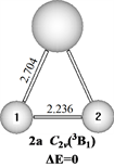 对CeSi2来说,可能的结构有直线形、弯曲形和三角形。但弯曲形的结构经优化最后成为三角形或直线形,所以在报导的CeSi2八种结构中没有弯曲结构。CeSi2的基态结构(2a)是具有C2v对称性的等腰三角形,电子态为3B1。异构体2b、2c和2d也是具有C2v对称性的等腰三角形,电子态分别为5B1、5A1和1A1,能量上它们分别比基态结构高0.90、1.02和1.12 eV。异构体2e和2f是具有C∞v对称性的线性结构,2g和2h是具有D∞h对称性的线性结构,它们的电子态分别为5Π、3Σ、5Σu和1Π,能量上它们分别比基态结构高1.92、2.76、2.85和3.44 eV。基态结构的Ce-Si键长为2.704 Å,比CeSi基态结构中的Ce-Si键长长了0.152 Å。