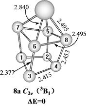 在图8中给出五个CeSi8的结构。具有C2v对称性和3B1基态的8a结构即可以看作是一个Ce原子取代Si9扭曲的双顶五角双锥基态结构[10] 的一个Si原子而获得,也可以看作是一个Ce原子吸附在Si8双顶四角双锥基态结构[10] 的一个面上而获得。异构体8c和8d属于取代结构,它们具有Cs对称性,电子态分别为3A′和3A″,能量上它们比8a分别高0.58和1.07 eV。具有C1对称性和三重态的8b异构体属于第三种类型,能量上它比基态的8a结构稍稍高0.11 eV。我们只给出了一个单重态的异构体8e,它具有C2v对称性,电子态为1A1,能量上比基态8a约高1.00 eV。另外,单重态和五重态的异构体能量比较高,稳定性较差。由于Si原子较少所以不能形成囊形结构,当用“囊形结构”作为初始结构优化时,Ce原子最后析出到团簇表面。