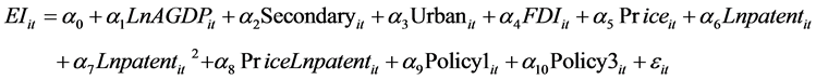 作为又一变量以继续验证科技创新(进步)水平对能源消费强度的影响以及其他变量的影响作用。则模型(3)转化为: