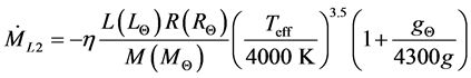 太阳在红巨星的演化由太阳风和光子辐射造成的质量损失决定的。因为太阳到达红巨星阶段它的温度是很低的,所以,我们必须利用冷星的质量损失率,本文作者(2000)曾利用由Mullar (1978)给出的由于太阳风造成的冷星的质量损失率[7] 。
