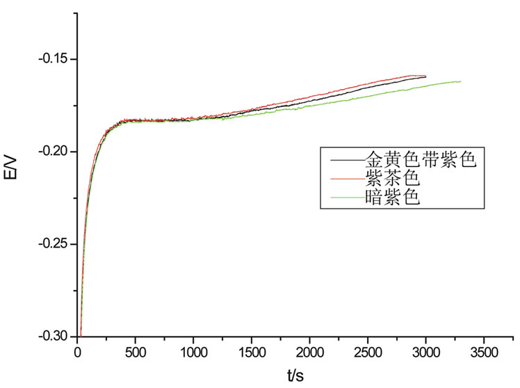 从图中可以得出,当着色电位达到终点电位并持续一定时间后,可以得到颜色基本相同的绿色氧化膜,说明按这种方法来控制不锈钢的着色得到的彩色不锈钢颜色重现性好。