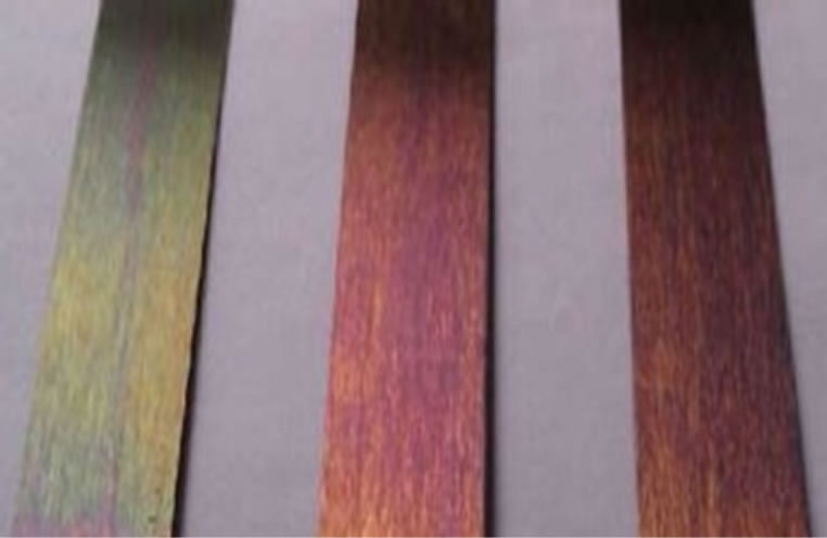 从下图中可以看出,控制着色电位差(ΔV)为24 mv时,彩色不锈钢从左到右依次为金黄色带紫色、紫茶色和暗茶色,彩色不锈钢颜色重现性差,说明控制电位差一致也很难保证彩色不锈钢颜色的良好重现性。