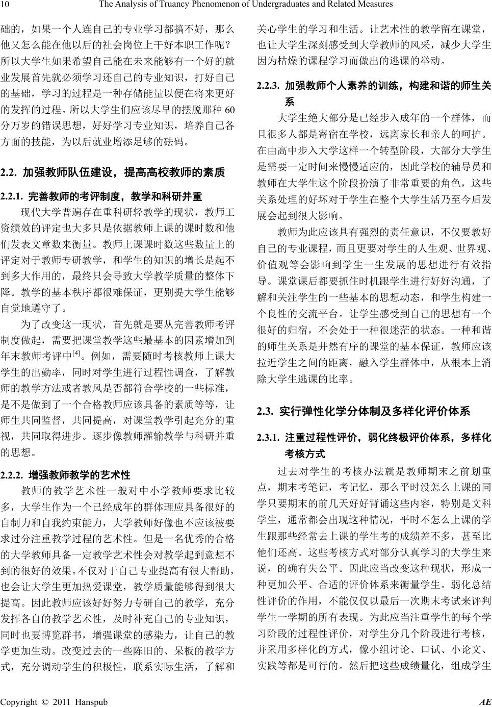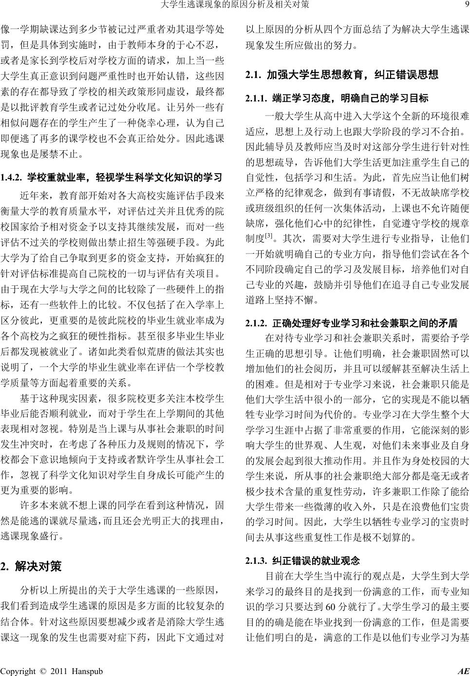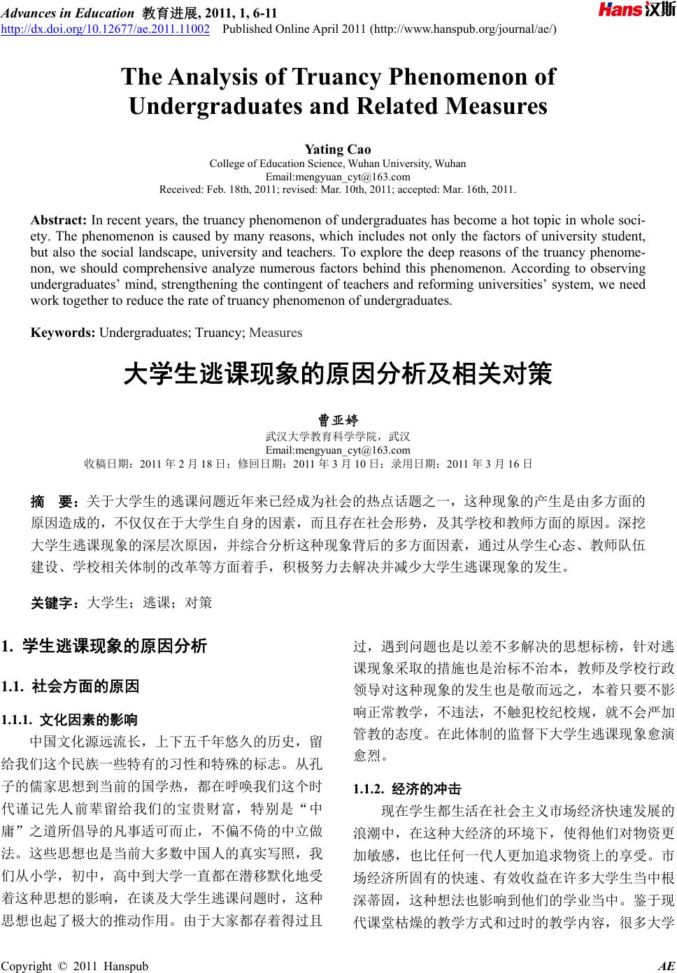 ![]() Advances in Education 教育进展, 2011, 1, 6-11 http://dx.doi.org/10.12677/ae.2011.11002 Published Online April 2011 (http://www.hanspub.org/journal/ae/) Copyright © 2011 Hanspub AE The Analysis of Truancy Phenomenon of Undergraduates and Related Measures Yating Cao College of Education Science, Wuhan University, Wuhan Email:mengyuan_cyt@163.com Received: Feb. 18th, 2011; revised: Mar. 10th, 2011; accepted: Mar. 16th, 2011. Abstract: In recent years, the truancy phenomenon of undergraduates has become a hot topic in whole soci- ety. The phenomenon is caused by many reasons, which includes not only the factors of university student, but also the social landscape, university and teachers. To explore the deep reasons of the truancy phenome- non, we should comprehensive analyze numerous factors behind this phenomenon. According to observing undergraduates’ mind, strengthening the contingent of teachers and reforming universities’ system, we need work together to reduce the rate of truancy phenomenon of undergraduates. Keywords: Undergraduates; Truancy; Measures 大学生逃课现象的原因分析及相关对策 曹亚婷 武汉大学教育科学学院,武汉 Email:mengyuan_cyt@163.com 收稿日期:2011 年2月18日;修回日期:2011 年3月10 日;录用日期:2011 年3月16 日 摘 要:关于大学生的逃课问题近年来已经成为社会的热点话题之一,这种现象的产生是由多方面的 原因造成的,不仅仅在于大学生自身的因素,而且存在社会形势,及其学校和教师方面的原因。深挖 大学生逃课现象的深层次原因,并综合分析这种现象背后的多方面因素,通过从学生心态、教师队伍 建设、学校相关体制的改革等方面着手,积极努力去解决并减少大学生逃课现象的发生。 关键字:大学生;逃课;对策 1. 学生逃课现象的原因分析 1.1. 社会方面的原因 1.1.1. 文化因素的影响 中国文化源远流长,上下五千年悠久的历史,留 给我们这个民族一些特有的习性和特殊的标志。从孔 子的儒家思想到当前的国学热,都在呼唤我们这个时 代谨记先人前辈留给我们的宝贵财富,特别是“中 庸”之道所倡导的凡事适可而止,不偏不倚的中立做 法。这些思想也是当前大多数中国人的真实写照,我 们从小学,初中,高中到大学一直都在潜移默化地受 着这种思想的影响,在谈及大学生逃课问题时,这种 思想也起了极大的推动作用。由于大家都存着得过且 过,遇到问题也是以差不多解决的思想标榜,针对逃 课现象采取的措施也是治标不治本,教师及学校行政 领导对这种现象的发生也是敬而远之,本着只要不影 响正常教学,不违法,不触犯校纪校规,就不会严加 管教的态度。在此体制的监督下大学生逃课现象愈演 愈烈。 1.1.2. 经济的冲击 现在学生都生活在社会主义市场经济快速发展的 浪潮中,在这种大经济的环境下,使得他们对物资更 加敏感,也比任何一代人更加追求物资上的享受。市 场经济所固有的快速、有效收益在许多大学生当中根 深蒂固,这种想法也影响到他们的学业当中。鉴于现 代课堂枯燥的教学方式和过时的教学内容,很多大学 ![]() 大学生逃课现象的原因分析及相关对策 7 生宁愿多花时间在跟自己未来实际发展密切相关的课 程当中,而对一些基础理论抱着一种能逃就逃的心态。 其中还有很多人相对专业课而言更加热衷于考取各种 各样的证件。认为专业理论知识的学习纯属浪费时间。 在他们心中读书就是为了将来更好的就业,所以他们 希望在大学期间及早掌握一些社会技能以便更好的适 应社会,为自己的将来发展打下良好的基础,而忽视 了自己本应该好好掌握的基础知识。所以对于学校开 设的选修课及公共课大都采取逃避的方式对待[1]。 1.1.3. 科技的飞速发展 随着科学技术的飞速发展,网络的流行,各种信 息媒体的交流与泛滥,现代社会已经变成了一个完全 开放的信息传播体。学校教师也不再是信息的唯一载 体,处处都可以学到知识,人人也可以成为老师。尤 其是大学生,作为与现代技术接触的最多的一代人, 加上网络世界的丰富多彩及多变化性,他们不再把目 光集中在课堂中老师的讲授,而是把更多精力投入到 生活中,网络等这些信息传播的途径。 另一方面,由于现代教学设备的提高,很多大学 甚至中学都采用多媒体形式教学,很多教师的讲义都 是通过多媒体电脑呈现并讲授的。因此这容易让学生 产生一种错觉,认为上课可以不好好听讲,只要课后 把老师的课件复制下来,等自己有时间或者期末考试 之前突击一下就可以取得好的成绩了。这样很多学生 就不会安心坐在教室里听老师讲一些枯燥的理论知 识,他们就选择逃课去干一些在他们看来更能提高自 己社会技能的实效性本领。 1.1.4. 就业形势的影响 近年来由于大学普遍施行的扩招政策,及其大学 本身专业设置与市场需求的脱节,再加上大学生自身 对待职业的期望值过高与现实存在的种种冲突等等因 素的影响,大学毕业生普遍存在就业难问题已经成为 一个社会关注的热点话题。在这种情况下,由于很多 大学生未能看到就业难背后的深层原因,而片面的认 为大学里多读书也没多大用处,只要能混张文凭就可 以了。 因此很多大学生忙于报考各种辅导班,考取各种 证件,急于在社会上去锻炼自己,认为只有在社会实 践中才能学到知识,而对学校针对各自专业特点设置 的基础专业课程置之不理。逃课现象也变得十分普遍, 甚至还有加大的趋势。 1.2. 学生自身方面的原因 1.2.1. 自我约束能力差 大学对于经