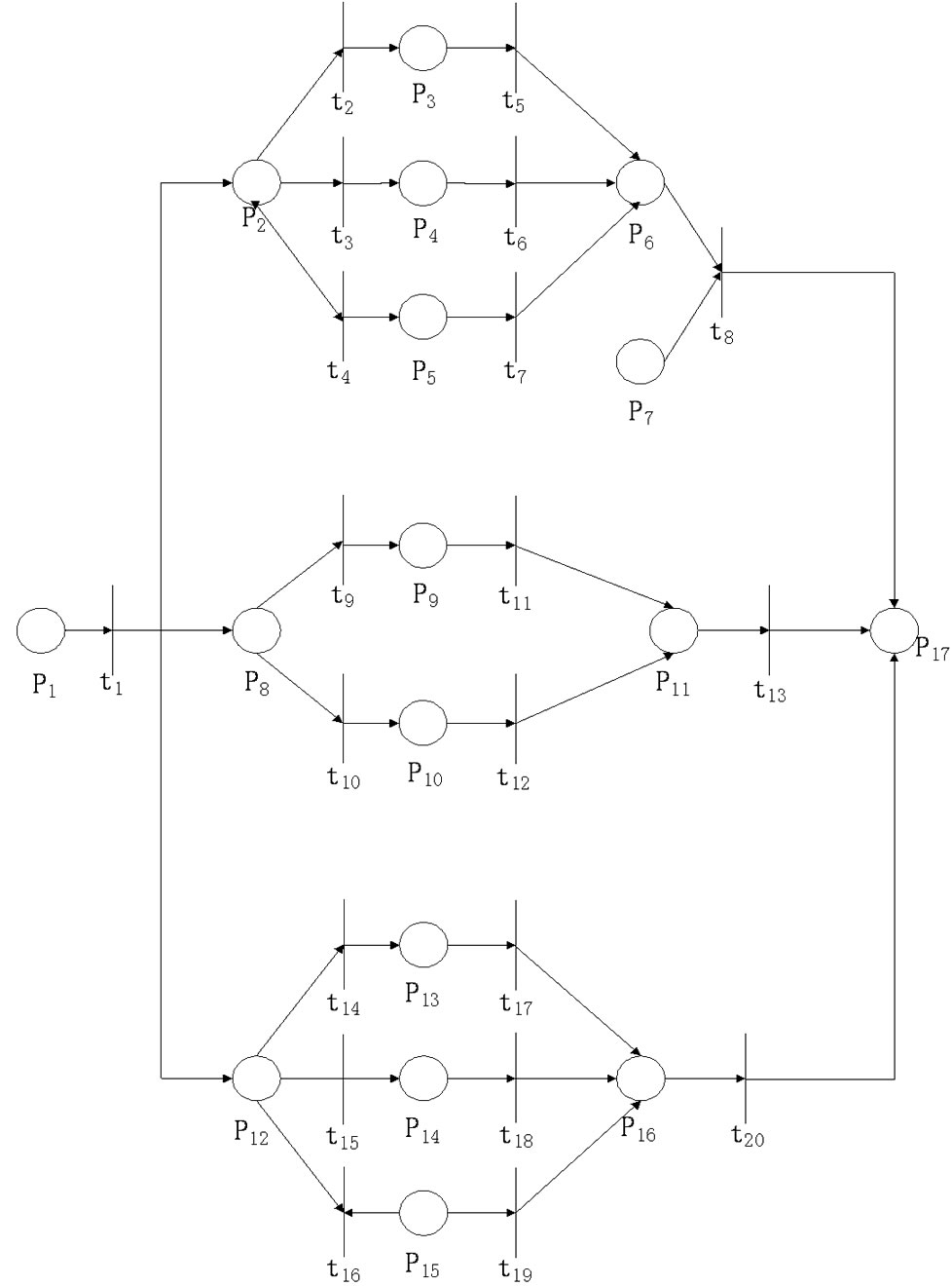 由图2可知,Petri网模型结构中含有并发,条件,或,与等连接关系,定性分析可知: