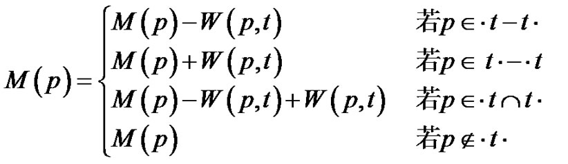 3) 变迁发生后果:若t在M授权下发生,则标识M改变为M的后继
