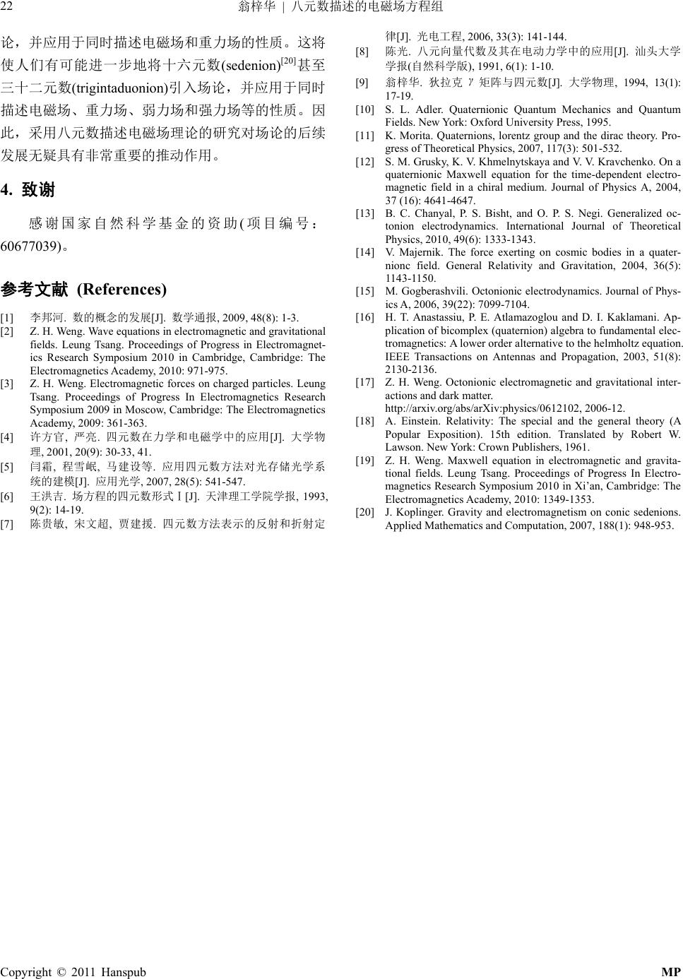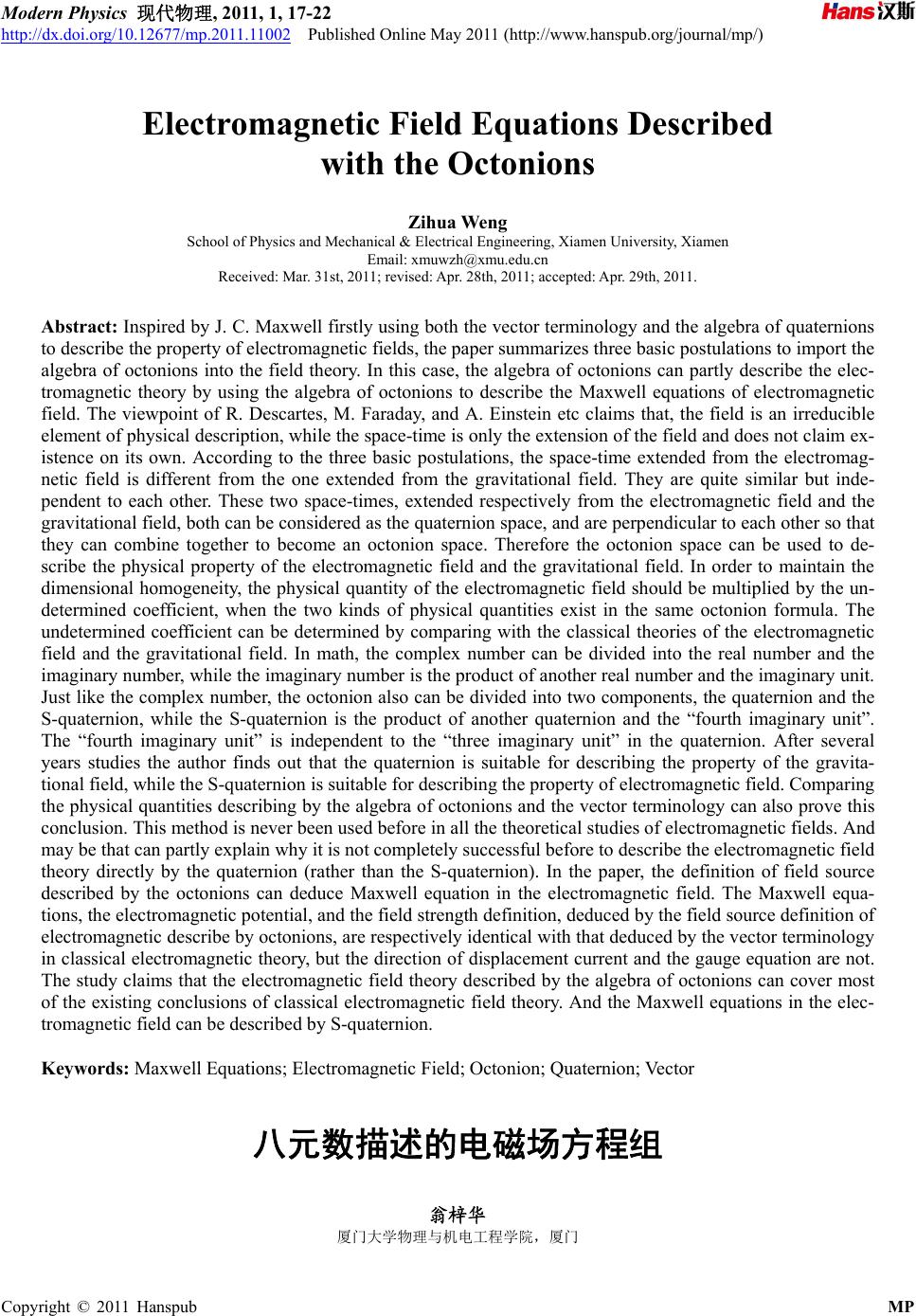 ![]() Modern Physics 现代物理, 2011, 1, 17-22 http://dx.doi.org/10.12677/mp.2011.11002 Published Online May 2011 (http://www.hanspub.org/journal/mp/) Copyright © 2011 Hanspub MP Electromagnetic Field Equations Described with the Octonions Zihua We ng School of Physics and Mechanical & Electrical Engineering, Xiamen University, Xiamen Email: xmuwzh@xmu.edu.cn Received: Mar. 31st, 2011; revised: Apr. 28th, 2011; accepted: Apr. 29th, 2011. Abstract: Inspired by J. C. Maxwell firstly using both the vector terminology and the algebra of quaternions to describe the property of electromagnetic fields, the paper summarizes three basic postulations to import the algebra of octonions into the field theory. In this case, the algebra of octonions can partly describe the elec- tromagnetic theory by using the algebra of octonions to describe the Maxwell equations of electromagnetic field. The viewpoint of R. Descartes, M. Faraday, and A. Einstein etc claims that, the field is an irreducible element of physical description, while the space-time is only the extension of the field and does not claim ex- istence on its own. According to the three basic postulations, the space-time extended from the electromag- netic field is different from the one extended from the gravitational field. They are quite similar but inde- pendent to each other. These two space-times, extended respectively from the electromagnetic field and the gravitational field, both can be considered as the quaternion space, and are perpendicular to each other so that they can combine together to become an octonion space. Therefore the octonion space can be used to de- scribe the physical property of the electromagnetic field and the gravitational field. In order to maintain the dimensional homogeneity, the physical quantity of the electromagnetic field should be multiplied by the un- determined coefficient, when the two kinds of physical quantities exist in the same octonion formula. The undetermined coefficient can be determined by comparing with the classical theories of the electromagnetic field and the gravitational field. In math, the complex number can be divided into the real number and the imaginary number, while the imaginary number is the product of another real number and the imaginary unit. Just like the complex number, the octonion also can be divided into two components, the quaternion and the S-quaternion, while the S-quaternion is the product of another quaternion and the “fourth imaginary unit”. The “fourth imaginary unit” is independent to the “three imaginary unit” in the quaternion. After several years studies the author finds out that the quaternion is suitable for describing the property of the gravita- tional field, while the S-quaternion is suitable for describing the property of electromagnetic field. Comparing the physical quantities describing by the algebra of octonions and the vector terminology can also prove this conclusion. This method is never been used before in all the theoretical studies of electromagnetic fields. And may be that can partly explain why it is not completely successful before to describe the electromagnetic field theory directly by the quaternion (rather than the S-quaternion). In the paper, the definition of field source described by the octonions can deduce Maxwell equation in the electromagnetic field. The Maxwell equa- tions, the electromagnetic potential, and the field strength definition, deduced by the field source definition of electromagnetic describe by octonions, are respectively identical with that deduced by the vector terminology in classical electromagnetic theory, but the direction of displacement current and the gauge equation are not. The study claims that the electromagnetic field theory described by the algebra of octonions can cover most of the existing conclusions of classical electromagnetic field theory. And the Maxwell equations in the elec- tromagnetic field can be described by S-quaternion. Keywords: Maxwell Equations; Electromagnetic Field; Octonion; Quaternion; Vector 八元数描述的电磁场方程组 翁梓华 厦门大学物理与机电工程学院,厦门 ![]() 翁梓华 | 八元数描述的电磁场方程组 Copyright © 2011 Hanspub MP 18 Email: xmuwzh@xmu.edu.cn 收稿日期:2011年3月31 日;修回日期:2011年4月28 日;录用日期:2011年4月29 日 摘 要:麦克斯韦首先同时采用矢量和四元数两种方法描述电磁场性质。这启发本文总结出三条基本假 设,试图解决将八元数引进场论的问题。应用八元数可以描述电磁场的麦克斯韦方程组,从而部分程度 实现采用八元数代数描述电磁场理论的努力目标。如果将八元数分解成为四元数和 S–四元数两个部分, 可以发现 S–四元数适合于描述电磁场性质。这种方法在电磁场理论的以往研究中是不曾遇到过的。由 八元数描述的电磁场的场源定义式可以分解出麦克斯韦方程组。同时电磁场势、场强定义式和麦克斯韦 方程组均分别等同于采用矢量方法得到的结果,但位移电流方向和规范条件方程有所不同。研究结果揭 示,应用八元数描述的电磁场理论可以涵盖经典电磁场理论中的大部分已有结论。采用 S–四元数可以 描述电磁场中的麦克斯韦方程组。 关键词:麦克斯韦方程组;电磁场;八元数;四元数;矢量 1. 引言 同时采用四元数(quaternion)和矢量两种方法研究 电磁场性质是麦克斯韦(J. C. Maxwell)的研究特点之 一。四元数[1]由哈密顿(W. R. Hamilton)于1843 年发明。 八元数(octonion)作为四元数的有序对分别由格拉夫(J. T. Graves)于1843 年和凯莱(A. Cayley)于1845 年先后 独立发现。随后二十多年四元数被拆为标量和矢量。 麦克斯韦在 1850 年左右开始电磁场研究并自然地混 用两种方法描述电磁场性质。目前,采用矢量描述的 电磁场理论较为成