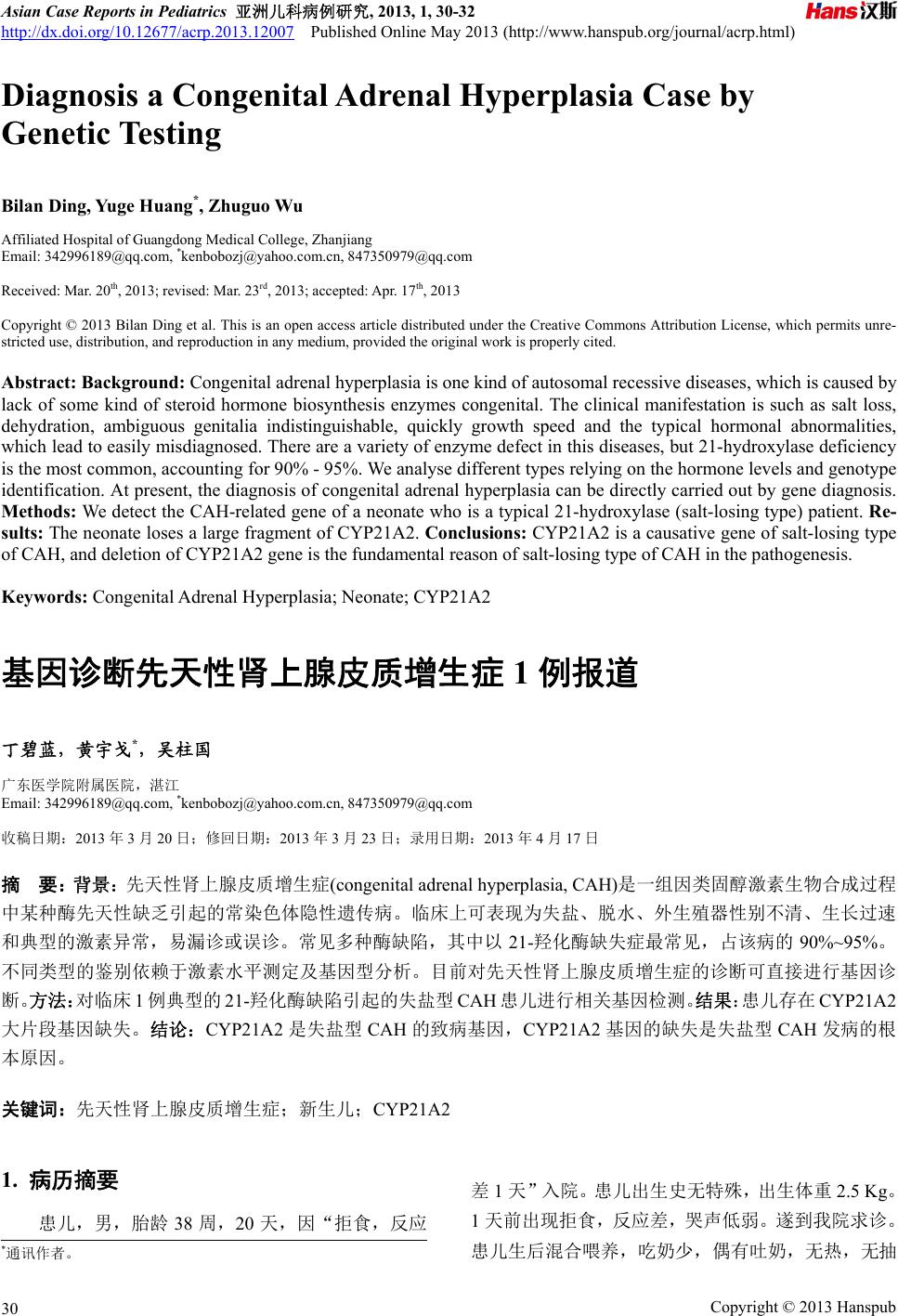 ![]() Asian Case Reports in Pediatrics 亚洲儿科病例研究, 2013, 1, 30-32 http://dx.doi.org/10.12677/acrp.2013.12007 Published Online May 2013 (http://www.hanspub.org/journal/acrp.html) Diagnosis a Congenital Adrenal Hyperplasia Case by Genet ic Testin g Bilan Ding, Yuge Huang*, Zhuguo Wu Affiliated Hospital of Guangdong Medical College, Zhanjiang Email: 342996189@qq.com, *kenbobozj@yahoo.com.cn, 847350979@qq.com Received: Mar. 20th, 2013; revised: Mar. 23rd, 2013; accepted: Apr. 17th, 2013 Copyright © 2013 Bilan Ding et al. This is an open access article distributed under the Creative Commons Attribution License, which permits unre- stricted use, distribution, and reproduction in any medium, provided the original work is properly cited. Abstract: Background: Congenital adrenal hyperplasia is one kind of autosomal recessive diseases, which is caused by lack of some kind of steroid hormone biosynthesis enzymes congenital. The clinical manifestation is such as salt loss, dehydration, ambiguous genitalia indistinguishable, quickly growth speed and the typical hormonal abnormalities, which lead to easily misdiagnosed. There are a variety of enzyme defect in this diseases, but 21-hydroxylase deficiency is the most common, accounting for 90% - 95%. We analyse different types relying on the hormone levels and genotype identification. At present, the diagnosis of congenital adrenal hyperplasia can be directly carried out by gene diagnosis. Methods: We detect the CAH-related gene of a neonate who is a typical 21-hydroxylase (salt-losing type) patient. Re- sults: The neonate loses a large fragment of CYP21A2. Conclusions: CYP21A2 is a causative gene of salt-losing type of CAH, and deletion of CYP21A2 gene is the fundamental reason of salt-losing type of CAH in the pathogenesis. Keywords: Congenital Adrenal Hyperplasia; Neonate; CYP21A2 基因诊断先天性肾上腺皮质增生症 1例报道 丁碧蓝,黄宇戈*,吴柱国 广东医学院附属医院,湛江 Email: 342996189@qq.com, *kenbobozj@yahoo.com.cn, 847350979@qq.com 收稿日期:2013 年3月20 日;修回日期:2013年3月23 日;录用日期:2013年4月17日 摘 要:背景:先天性肾上腺皮质增生症(congenital adrenal hyperplasia, CAH)是一组因类固醇激素生物合成过程 中某种酶先天性缺乏引起的常染色体隐性遗传病。临床上可表现为失盐、脱水、外生殖器性别不清、生长过速 和典型的激素异常,易漏诊或误诊。常见多种酶缺陷,其中以 21-羟化酶缺失症最常见,占该病的 90%~95%。 不同类型的鉴别依赖于激素水平测定及基因型分析。目前对先天性肾上腺皮质增生症的诊断可直接进行基因诊 断。方法:对临床 1例典型的 21-羟化酶缺陷引起的失盐型CAH 患儿进行相关基因检测。结果:患儿存在 CYP21A2 大片段基因缺失。结论:CYP21A2 是失盐型 CAH 的致病基因,CYP21A2 基因的缺失是失盐型 CAH发病的根 本原因。 关键词:先天性肾上腺皮质增生症;新生儿;CYP21A2 1. 病历摘要 患儿,男,胎龄38 周,20 天,因“拒食,反应 差1天”入院。患儿出生史无特殊,出生体重 2.5 Kg。 1天前出现拒食,反应差,哭声低弱。遂到我院求诊。 患儿生后混合喂养,吃奶少,偶有吐奶,无热,无抽 *通讯作者。 Copyright © 2013 Hanspub 30 ![]() 基因诊断先天性肾上腺皮质增生症 1例报道 搐,大便正常,小便偏少。入院体查:体温36.6℃脉搏 148 次/分,呼吸 60 次/分,体重2.02 Kg,身长 47 cm 头围 34 cm。老人貌,神志清,反应差,哭声低弱。 皮肤黝黑,毛发浓密,眼眶凹陷,嘴唇干燥,皮肤干 燥松弛,弹性差,皮下脂肪缺乏。头颅无畸形,骨缝 未闭,前囟增宽,4 cm × 4 cm,稍凹陷。乳晕色素沉 着,心肺听诊正常,腹部平坦,按之柔软,可见胃肠 型,肝脾无肿大。阴囊色素沉着,四肢肌张力正常, 原始反射减弱。入院急查血气分析示:PH 7.15,PCO2 28 mmHg,PO2 66 mmHg,Na+ 122 mmol/L,K+ 6.3 mmol/L,Ca2+ 1.05 mmol/L,GLU 0.6 mmol/L,3 HCO 9.8 mmol/L,BE −17.5 mmol/L。入院诊断为:1) 营养 不良(重度);2) 中度脱水;3) 代谢性酸中毒;4) 高 钾血症;5) 低钠血症;6) 低糖血症。入院后完善相 关检查,首先先排除消化道畸形及中枢神经系统病 变,行胃肠道 B超、全消化道造影、头颅彩超未见异 常。进一步检查:CTS 5.03 μg/dl(参考值:8.7~22.4), ACTH 71.6 pg/ml(参考值:<46),17-羟基孕酮(17-OHP) > 25 ng/ml(参考值:<2.5 ),雄烯二酮(AD) > 8.6 ng/ml (参考值:0.1~0.9)。双肾上腺彩超检查未见明显异常。 双侧腕关节X片未见骨化中心及骨骺形成。行分子遗 传学检查,检测报告回复示:对患儿外周动脉血样本 的CYP21A2 基因外显子进行标准PCR扩增,结果显 示其外显子区域多次实验均未扩增成功,采取双重 PCR 技术对外显子区域进行 PCR 扩增,结果显示患 儿样本仅扩增出内参基因相对应片段,而其父母及对 照样本均能扩增出 CYP21A2 基因及内参基因相对应 的片段。因而高度怀疑患儿的CYP21A2 基因存在大 片段缺失。最后诊断:先天性肾上腺皮质增生症(失盐 型)。入院后予补液扩容,纠正酸碱失衡及电解质紊乱, 静脉滴注3天氢化可的松后,患儿精神好转,临床症 状减轻,改醋酸可的松口服。住院期间定期复查生化 或血气分析。住院 10天患儿内环境紊乱已完全纠正, 且一般情况好,生命体征平稳,体查无特殊,准予出 院。嘱出院后继续口服醋酸可的松,并定期于我院门 诊复诊。 2. 讨论 CAH 是一组因肾上腺皮质激素合成过程中酶缺 陷引起的综合征。由于酶的缺乏,导致皮质醇合成不 足或者缺乏,负反馈抑制垂体释放促肾上腺皮质激素 的作用减弱,致促肾上腺皮质激素分泌过多,肾上腺 皮质增生和分泌过多的该酶作用前合成的激素和前 体物。从而表现出一系列的临床症状。本病