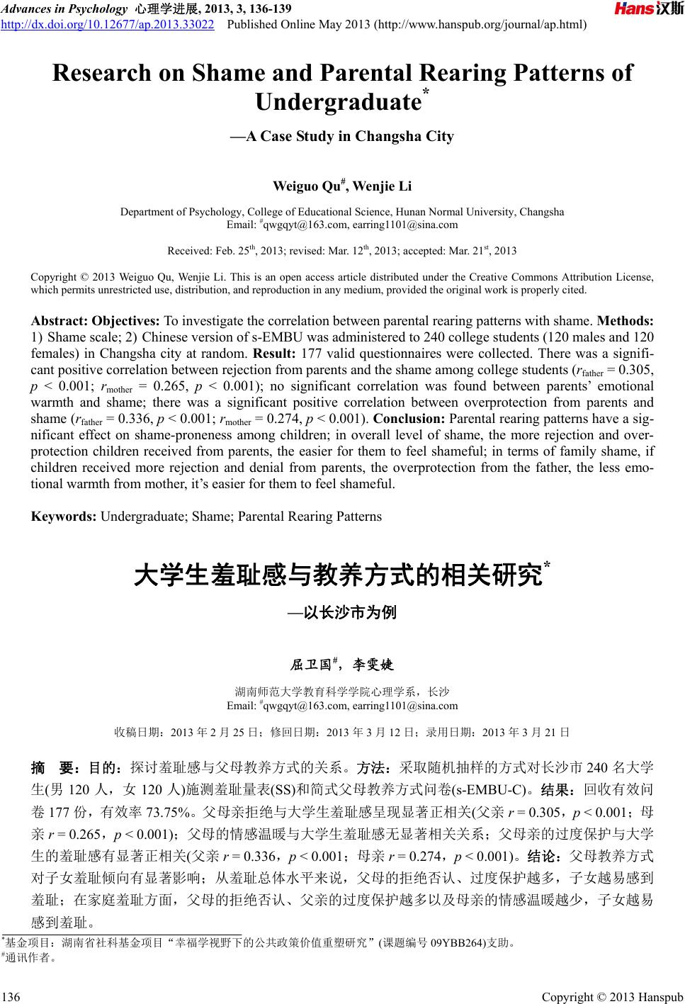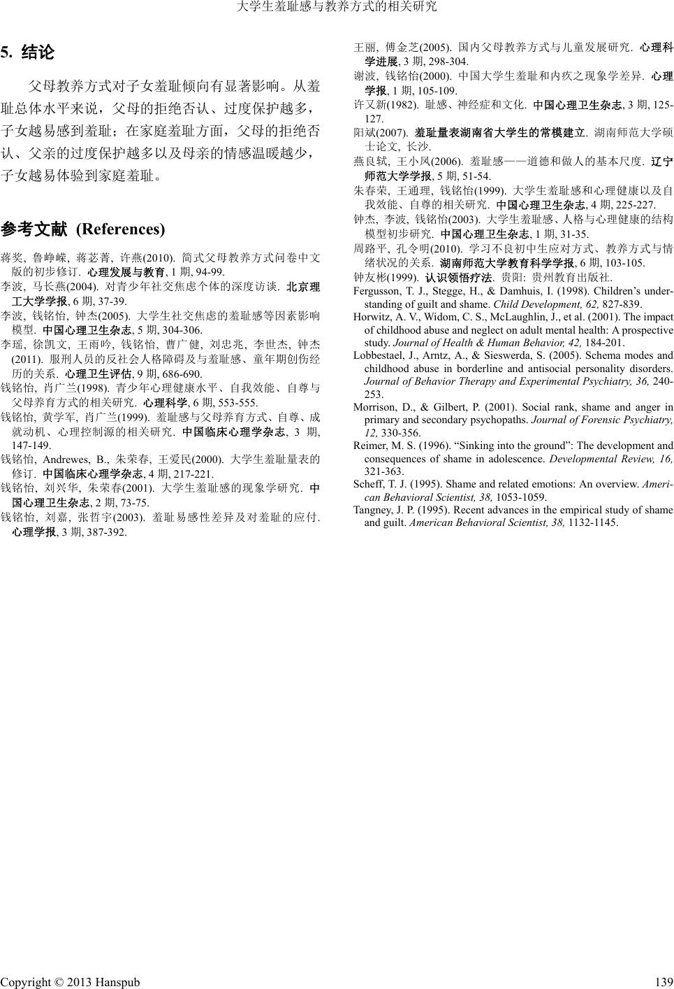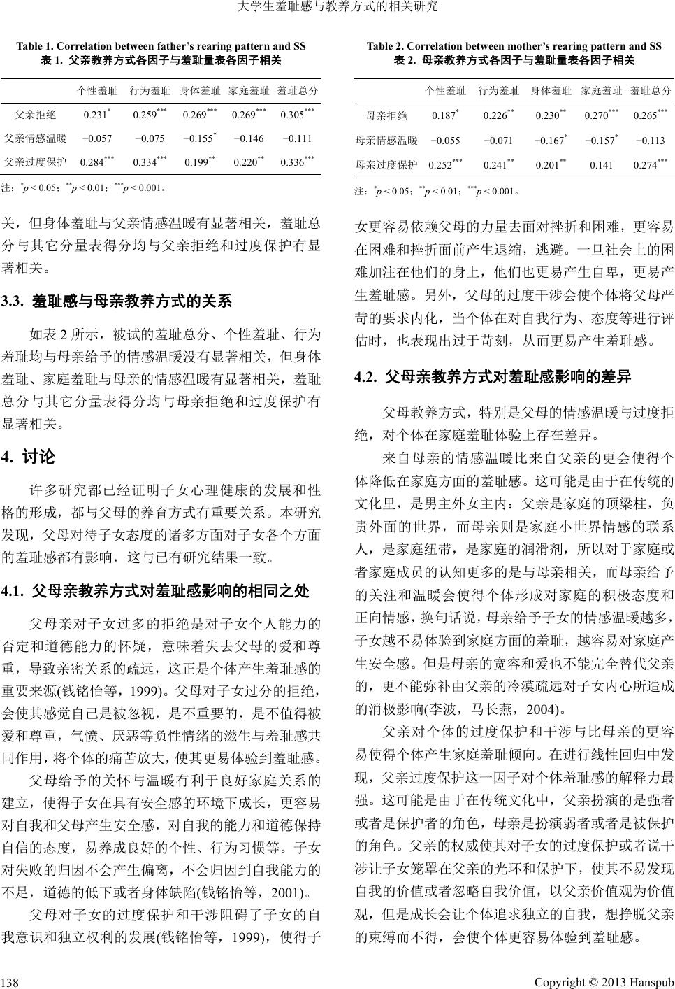 ![]() Advances in Psychology 心理学进展, 2013, 3, 136-139 http://dx.doi.org/10.12677/ap.2013.33022 Published Online May 2013 (http://www.hanspub.org/journal/ap.html) Research on Shame and Parental Rearing Patterns of Undergraduate* —A Case Study in Changsha City Weiguo Qu#, Wenjie Li Department of Psychology, College of Educational Science, Hunan Normal University, Changsha Email: #qwgqyt@163.com, earring1101@sina.com Received: Feb. 25th, 2013; revised: Mar. 12th, 2013; accepted: Mar. 21st, 2013 Copyright © 2013 Weiguo Qu, Wenjie Li. This is an open access article distributed under the Creative Commons Attribution License, which permits unrestricted use, distribution, and reproduction in any medium, provided the original work is properly cited. Abstract: Ob je cti ves: To investigate the correlation between parental rearing patterns with shame. Methods: 1) Shame scale; 2) Chinese version of s-EMBU was administered to 240 college students (120 males and 120 females) in Changsha city at random. Result: 177 valid questionnaires were collected. There was a signifi- cant positive correlation between rejection from parents and the shame among college students (rfather = 0.305, p < 0.001; rmother = 0.265, p < 0.001); no significant correlation was found between parents’ emotional warmth and shame; there was a significant positive correlation between overprotection from parents and shame (rfather = 0.336, p < 0.001; rmother = 0.274, p < 0.001). Conclusion: Parental rearing patterns have a sig- nificant effect on shame-proneness among children; in overall level of shame, the more rejection and over- protection children received from parents, the easier for them to feel shameful; in terms of family shame, if children received more rejection and denial from parents, the overprotection from the father, the less emo- tional warmth from mother, it’s easier for them to feel shameful. Keywords: Undergraduate; Shame; Parental Rearing Patterns 大学生羞耻感与教养方式的相关研究* —以长沙市为例 屈卫国#,李雯婕 湖南师范大学教育科学学院心理学系,长沙 Email: #qwgqyt@163.com, earring1101@sina.com 收稿日期:2013 年2月25日;修回日期:2013 年3月12 日;录用日期:2013 年3月21 日 摘 要:目的:探讨羞耻感与父母教养方式的关系。方法:采取随机抽样的方式对长沙市 240名大学 生(男120 人,女 120人)施测羞耻量表(SS)和简式父母教养方式问卷(s-EMBU-C)。结果:回收有效问 卷177 份,有效率73.75%。父母亲拒绝与大学生羞耻感呈现显著正相关(父亲r = 0.305,p < 0.001;母 亲r = 0.265,p < 0.001);父母的情感温暖与大学生羞耻感无显著相关关系;父母亲的过度保护与大学 生的羞耻感有显著正相关(父亲r = 0.336,p < 0.001;母亲r = 0.274,p < 0.001)。结论:父母教养方式 对子女羞耻倾向有显著影响;从羞耻总体水平来说,父母的拒绝否认、过度保护越多,子女越易感到 羞耻;在家庭羞耻方面,父母的拒绝否认、父亲的过度保护越多以及母亲的情感温暖越少,子女越易 感到羞耻。 *基金项目:湖南省社科基金项目“幸福学视野下的公共政策价值重塑研究”(课题编号 09YBB264)支助。 #通讯作者。 Copyright © 2013 Hanspub 136 ![]() 大学生羞耻感与教养方式的相关研究 Copyright © 2013 Hanspub 137 关键词:大学生;羞耻感;教养方式 1. 引言 羞耻感(Shame)是一种指向自我的负性情感体验 (Scheff,1995;Tangney,1995;Reimer,1996;Fergusson, Stegge,& Damhuis,1996;钱铭怡,黄学军,肖广兰, 1999;钱铭怡,刘兴华,朱荣春,2001;燕良轼,王 小凤,2006),它是由于个体过度依赖他人的评价以及 对自我的否定而产生的一种痛苦体验(谢波,钱铭怡, 2000)。已有研究表明,羞耻感对心理健康水平有显著 影响(朱春荣,王通理,钱铭怡,1999;许又新,1982; 钟友彬,1999;钟杰,李波,钱铭怡,2003)。易羞耻 的个体一般来说心理健康水平较低,当面对消极事件 时,他们更倾向于归因为自己能力的不足(朱春荣等, 1999),并固着于对事件后果的恐惧、后悔、焦虑中, 很难冷静下来分析事件经过,也很难考虑利用身边资 源(钱铭怡,刘嘉,张哲宇,2003)。在社会交往中, 羞耻感是产生社交焦虑的关键因素(李波,钱铭怡,钟 杰,2005) 。另有研究表明,羞耻感与一些心理疾病的 相关也是显著的,如其与反社会人格障碍存在正相关 (Lobbestael,Arntz,& Sieswerda,2005;Horwitz , Widom,McLaughlin,2001;Morrison & Gilbert,2001; 李瑶,徐凯文,王雨吟,钱铭怡, 曹广健,刘忠兆, 李世杰,钟杰,2011),则 与SCL-90 中的抑郁、焦虑、 精神病性等因子存在正相关(Tangney, 1995)。 父母教养方式(parental rearing patterns)是父母教 育观念、教养行为以及对子女情感表达的相对稳定的 综合表现(王丽,傅金芝,2005)。父母对子女采用过 分干涉、拒绝的教养方式越多,子女越可能表现出低 自尊、抑郁、焦虑、精神质等,遇到挫折更倾向采取 回避等消极应对方式;而父母的温暖和理解有利于形 成健康的情绪(周路平,孔令明,2010)。因此父母的 教养方式与个体的心理健康水平、人格特征是密不可 分的(钱铭怡,肖广兰,1998)。 那么,羞耻感作为影响心理健康的重要因素,这 很可能与父母教养方式有关。因此,本研究主要是希 望了解羞耻感中个性羞耻、行为羞耻、身体羞耻以及 家庭羞耻与父母教养方式的拒绝、情感温暖以及过度 保护是否相关,并在此基础上预测父母教养方式对个 体羞耻感的影响。 2. 研究方法 2.1. 被试 研究对象为中南大学、湖南大学和湖南师范大学 学生大一至大四学生共 240 名,施测后回收问卷 238 份,其中有效问卷177份。其中男生93 人,女生84 人,平均年龄为20.95 ± 1.50 岁。 2.2. 研究工具 2.2.1. 羞耻量表(SS) 量表采