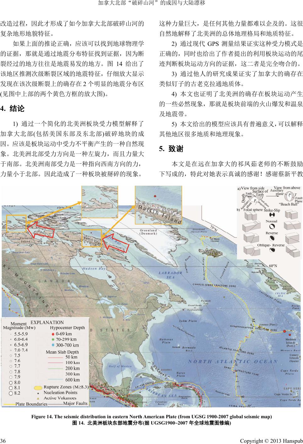 ![]() Geographical Science Research 地理科学研究, 2013, 2, 30-37 http://dx.doi.org/10.12677/gser.2013.22004 Published Online May 2013 (http://www.hanspub.org/journal/gser.html) Study on the Relationship between the Origin of Broken Plates in Northern Canada and Continental Drift Guanghe Liang1,2 1Institute of Geology and Geophysics, Chinese Academy of Sciences, Beijing 2Key Laboratory of Mineral Resources Research, Chinese Academy of Sciences, Beijing Email: lgh@mail.iggcas.ac.cn Received: Mar. 27th, 2013; revised: Apr. 20th, 2013; accepted: Apr. 28th, 2013 Copyright © 2013 Guanghe Liang. This is an open access article distributed under the Creative Commons Attribution License, which permits unrestricted use, distribution, and reproduction in any medium, provided the original work is properly cited. Abstract: Broken plates in northern Canada are unique on Earth, how they are formed? The current explana- tion about it is that it was formed by seafloor spreading and plate tectonics model, but this model cannot be explained in many cases and even has contradictory. Combined with the model “source power for continental drifting-plate self-driven mode” by the author, a new genetic model was given in this paper, that is the North America-force model which explains the causes of broken plates in northern Canada. The genetic model pro- vides us a new way to rethink the origin model of the North America geographical environment. Keywords: Continental Drift; Causes; Canada; Broken Plates 加拿大北部“破碎山河”的成因与大陆漂移 梁光河 1,2 1中国科学院地质与地球物理研究所,北京 2中国科学院矿产资源研究重点实验室,北京 Email: lgh@mail.iggcas.ac.cn 收稿日期:2013 年3月27 日;修回日期:2013 年4月20 日;录用日期:2013 年4月28 日 摘 要:加拿大北部的“破碎山河”是地球上独一无二的,它们是如何形成的?目前关于其成因的模 式一直是沿用传统的海底扩张和板块构造的模式解释的,但这种模式在其他地区存在自相矛盾的地 方。本文结合作者提出的大陆漂移的源动力——板块自驱动模式,给出了一个北美洲受力模型,说明了 加拿大北部破碎山河的成因。该成因模型为我们重新认识北美洲地理环境成因提供了一个新的思路。 关键词:大陆漂移;成因;加拿大;破碎山河 1. 引言 加拿大(Canada)是世界上领土面积第二大的国家 (图1),位于北美洲北部,东濒大西洋,西临太平洋, 西北部邻美国阿拉斯加州,东北与格陵兰(丹)隔戴维 斯海峡遥遥相望,南接美国本土,北靠北冰洋领土主 张直达北极圈,加拿大是一个具有现代化工业科技水 平且能源与资源充足的国家,经济体制主要依靠自然 资源。加拿大是经济合作与发展组织成员,同时也是 也是 G8、G20、北约、联合国、英联邦、世界贸易组 织等重要国际组织成员,亦是世界十大贸易国之一。 加拿大是世界上最大的经济体之一,国民拥有很高的 生活质量,是全球最富裕、经济最发达的国家之一[1]。 加拿大地域辽阔,森林和矿产资源丰富。矿产有 60 余种,镍、锌、铂、石棉、油砂的产量居世界首位, Copyright © 2013 Hanspub 30 ![]() 加拿大北部“破碎山河”的成因与大陆漂移 铀、金、镉、铋、石膏居世界第二位。铜、铁、铅、 钾、硫磺、钴、铬、钼及鱼类等产量相当丰富。已探 明的原油储量为 80 亿桶。森林覆盖面积达 440 万平 方公里,产材林面积 286 万平方公里,分别占全国领 土面积的 44%和29%;木材总蓄积量为172.3 亿立方 米。加领土面积中有89 万平方公里为淡水覆盖,淡 水资源占世界的9%。 从加拿大地形图(图2)上可以很清楚地看出一个 非常奇特的现象,那就是加拿大北部的破碎地块,作 者将它们称之为“破碎山河”,也算名副其实,不仅 从直观上看,北部存在众多的类似岛屿的破碎地块, 就连加拿大中部内陆地区(包括美国)也存在众多湖泊 沼泽,也是一种地块破碎现象。这种规模的破碎现象 Figure 1. Map of Canada (Baidu, 2013) 图1. 加拿大地图(据百度百科,2013) Figure 2. Canadian topographic maps (from NOAA, 2013) 图2. 加拿大地形图(据NOAA,2013) 是地球上独一无二的,是什么力量有如此威力将一个 大家熟知的古老克拉通板块揉碎?传统概念中古拉 克拉通板块是属于板块中最坚硬不易破碎的板块。作 者在互联网上试图用多种检索方式和检索关键词寻 找答案,一直没有找到对此的一个合理解释。 因此作者有理由认为,目前关于加拿大和北美洲 的构造格局的成因是用传统的海底扩张和板块构造 的模式解释的,因为这是当前大家认为的“真理”, 但这种模式在其他地区存在很多自相矛盾的地方,作 者已经在“大陆漂移与全球山脉高原的成因关系的研 究”一文中对此进行了详细描述。多方证据说明当前 的模式可能是错误的。本文将结合大陆漂移模式[3]给 出一个全新的北美洲受力模型,说明了加拿大北部破 碎山河的成因。该成因模型为我们重新认识北美洲地 理环境成因提供了一个新的思路。 图3是北美洲地形鸟瞰图,该图更清楚地显示了 不仅加拿大北部,甚至包括美国和加拿大边界的几个 大型湖泊等都属于破碎板块现象。 2. 北美洲受力模型和破碎地块成因 从图 3我们可以看出,整个北美洲两端细小,中 间膨大,很形象地比喻,就好像中间是一个宽大板子, 两头各安装了一个细把子。 因此作者把北美洲板块简化成图 4中右上角(A) 的图形,其中间的板子代表北美洲主体,两端的把子 代表北美洲南端和北端变细的部分。中间的钉子代表 加拿大克拉通地体,因为古老的克拉通是由高密度的 Figure 3. An