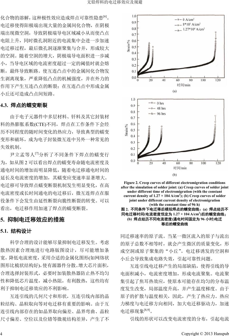 ![]() Open Journal of Nature Science自然科学, 2013, 1, 1-5 http://dx.doi.org/10.12677/ojns.2013.11001 Published Online May 2013 (http://www.hanspub.org/journal/ojns.html) Electromigration in Lead-Free Solder and Its Avoidance* Jichao Jiang1,2, Yumei Ling2, We nch ao Yang3, Yongz hong Zhan2# 1Qianan College, Hebei United University, Qianan 2College of Materials Science and Engineering, Guangxi University, Nanning 3Xingjian College of Science and Liberal Arts, Guangxi University, Nanning Email: #zyzmatres@aliyun.com Received: Apr. 7th, 2013; revised: Apr. 20th, 2013; accepted: Apr. 29th, 2013 Copyright © 2013 Jichao Jiang et al. This is an open access article distributed under the Creative Commons Attribution License, which permits unrestricted use, distribution, and reproduction in any medium, provided the original work is properly cited. Abstract: The development of miniaturization and multi-functionality of electronic products increases the current density in lead-free solder joints and promotes the failure caused by electromigration. This paper discusses the physical mechanism of lead-free solder electromigration failure and from the wiring geometry, thermal effect, grain size, dielectric film and other aspects of the electrical factors the impact of migration, introduces the electromigration damage, and then from the structure design, welding process and materials selection and other aspects of suppressing electromigration measures. Keywords: Lead-Free Solder; Electromigration; Failure of Solder Point; Brittle Intermetallics 无铅焊料的电迁移效应及规避* 蒋积超 1,2,凌玉梅 2,杨文超 3,湛永钟 2# 1河北联合大学迁安学院,迁安 2广西大学材料科学与工程学院,南宁 3广西大学行健文理学院,南宁 Email: #zyzmatres@aliyun.com 收稿日期:2013 年4月7日;修回日期:2013年4月20 日;录用日期:2013 年4月29日 摘 要:电子产品的微型化和多功能化发展显著增大了封装焊点的电流密度,也加剧了电迁移引起的焊点失效 问题。本文论述了无铅焊料的电迁移失效的物理机制及从布线几何形状、热效应、晶粒大小、介质膜等方面说 明电迁移的影响因素,介绍了电迁移的危害,进而从结构设计、焊接工艺和材料的选择等方面分析了抑制电迁 移的措施。 关键词:无铅焊料;电迁移;焊点失效;脆性金属间化合物 1. 引言 近年来,随着人们环保意识的加强、以及金属铅 固有的毒性(对人体内神经系统的损坏),禁止铅在电 子装配工业中的使用被提上议题。欧盟领导下的电子 电气设备废弃组织已要求在 2006 年前停止在电子装 配工业中使用含铅材料[1]。日本知名的电子产品制造 商松下、索尼、东芝、日本电气等从2000 年开始导 *资助信息:广西“千亿元”产业重大科技攻关项目(桂科攻 11107003-1);广西大学广西有色金属及特色材料加工重点实验室 开放基金(合同编号:GXKFJ12-01);广西大学行健文理学院科研基 金资助项目(项目编号:2013ZKLX02)。 #通讯作者。 入无铅化制程,至今已基本实施无铅化制造,在日本 及欧美市场上推出“绿色环保”家电产品。因此,对 于电子组装企业来说,无铅焊技术的应用已经是摆在 Copyright © 2013 Hanspub 1 ![]() 无铅焊料的电迁移效应及规避 企业面前必须解决的现实问题。新型无铅焊料成分的 多元合金化设计已成为趋势和发展的新特点,因为已 有无铅锡基焊料存在熔点过高或者过低,要么是固液 相线温度相差太大的问题,而通过添加多种合金元素 可提高二元共晶合金的力学性能,优化溶剂和焊料合 金化还可进一步改善可焊性。 电子器件在服役条件下,电路的周期性通断电和 环境温度的周期性变化,会使焊点经受温度循环过 程。封装材料间的热膨胀失配,将使焊点中产生应力 和应变,而应变基本上要由焊点来承担,造成焊点中 裂纹的萌生和扩展并最终导致焊点失效。失效形式主 要分为以下三类: 1) 焊接工艺引起的焊点失效 焊点可靠性问题主要来自于生产组装过程和服 役过程。焊前准备和焊接工艺中的一些不利因素、焊 接过程及焊后检测等设备条件的限制和随后不适当 的清洗工艺,以及焊接规范选择的人为误差,都有可 能造成虚焊、焊锡短路及曼哈顿现象等焊接故障,从 而导致焊点失效。使用过程中冲击、振动等不可避免 的因素也会造成焊点的机械损伤,产生焊点裂纹而影 响其长期可靠性。同时在厚、薄膜混合电路由于焊料 中的锡与镀金或镀银引脚中的金、银形成化合物,会 降低焊点的可靠性;而过度的超声波清洗也可能对焊 点的可靠性有影响。 2) 时效引起的失效 熔融焊料与基板在界面处形成的金属间化合物, 在焊点服役时,随着微观组织的粗化,金属间化合物 会不断生长,它的生长动力学影响着焊点的失效。界 面处的金属间化合物虽然是焊接良好的一个标志,但 随着服役过程中其厚度的增加,会引起焊点中微裂纹 萌生乃至断裂。当其厚度超过某一临界值时,金属间 化合物会表现出脆性[2];加上服役过程中组元的扩散 速率不同还造成 Kirkendall 空洞,这些因素均有可能 导致焊点失效。 3) 热循环引起的失效 电子器件服役时电路的周期性通断和环境温度 的周期性变化会使焊点经受温度循环的过程。封装材 料里的热膨胀失配,将在焊点中产生应力和应变。如 在SMT 中芯片载体材料 Al2O3陶瓷的热膨胀系数(CTE) 为6 × 10−6℃−1,而环氧树脂/玻璃纤维基板的CTE 则 为15 × 10−6℃−1。一般焊点所承受应变为1%~20%。 在THT 工艺中,器件的柔性引脚会吸收由于热失配 而引起的大部分应变,焊点真正承受的应变是很小 