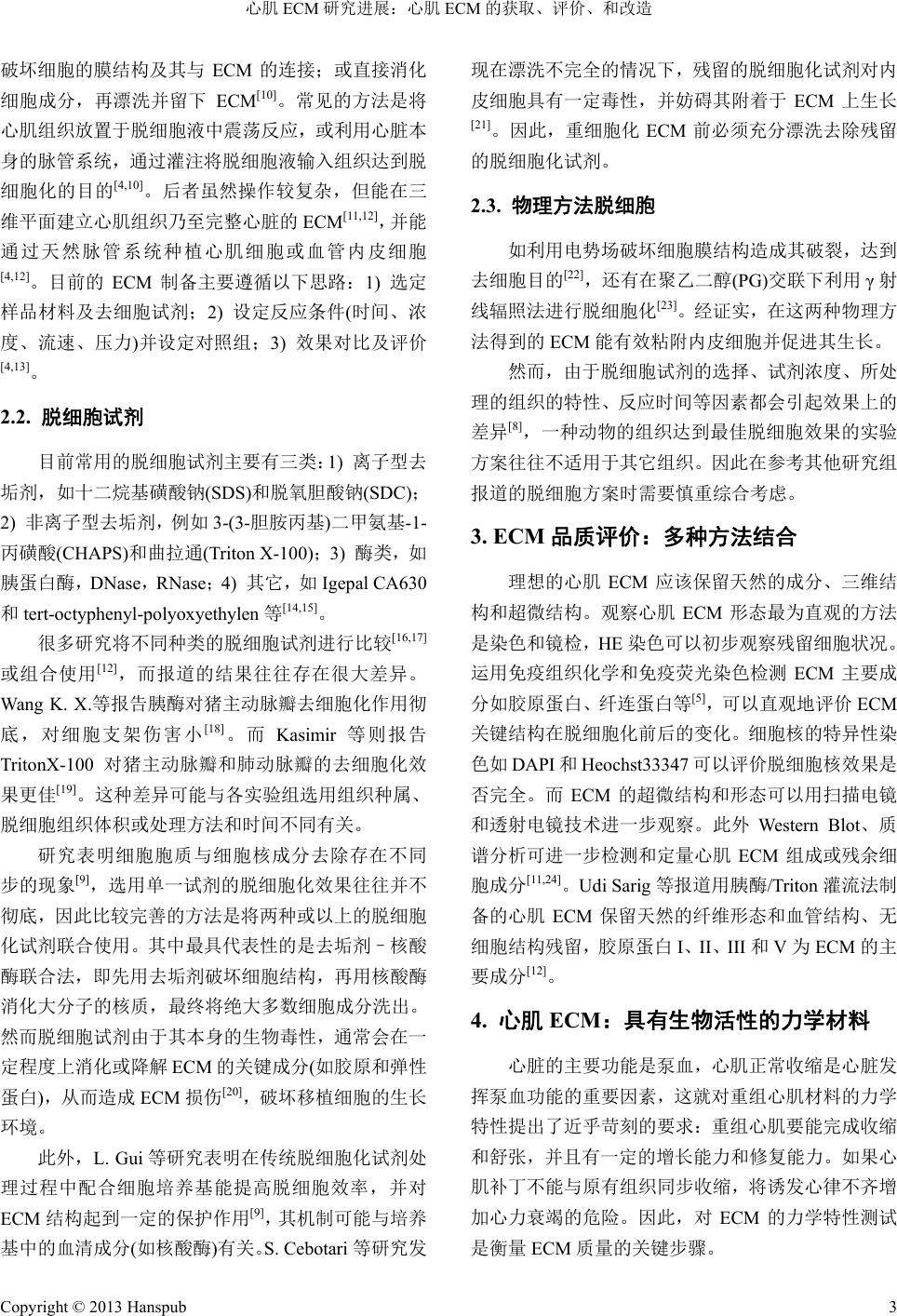 ![]() Journal of Physiology Studies 生理学研究, 2013, 1, 1-6 http://dx.doi.org/10.12677/jps.2013.11001 Published Online May 2013 (http://www.hanspub.org/journal/jps.html) Progress on Cardiac Extracellular Matrix (ECM): Acquirement, Evaluation and Modification of Cardiac ECM* Yudong Jiang, Wensi Li, Mengmeng Yin, Chong Yu, Xinwu Hu, Jiaoya Xi# Department of Physiology and Chinese-German Stem Cell Center, Tongji Medical College, Huazhong University of Science and Technology, The Key Laboratory for Drug Target Researches and Pharmacodynamic Evaluation of Hubei Province, Wuhan Email: #zhengyall@hotmail.com Received: Apr. 17th, 2013; revised: Apr. 20th, 2013; accepted: May 19th, 2013 Copyright © 2013 Yudong Jiang et al. This is an open access article distributed under the Creative Commons Attribution License, which permits unrestricted use, distribution, and reproduction in any medium, provided the original work is properly cited. Abstract: Both acute and chronic myocardial infraction can lead to necrosis of functional myocardial cells as well as impaired cardiac-pump function. The cardiac patches generated from cardiomyocytes and extracellular matrix scaffold by tissue engineering can be used to repair the impaired function. Cardiac extracellular matrix (ECM) has been widely considered as an ideal source of biological scaffolds, and the application of ECM in myocardial reconstruction is one of the main research fields in myocardial tissue engineering. ECM, generated from the process of decellularization, has relatively low immunogenecity, strong self-renewal ability and good biocompatibility. Currently, the methodology of cardiac ECM is greatly diversified. Although thorough decellularization is the essential process of eliminating immu- nogenecity, it will damage the ultrastructure of ECM, having a negative effect on recellularization and myocardial re- construction afterwards. Researchers are trying various methods to detect and evaluate the effect of decellularization, and continuously optimize the protocol of decellularization. Moreover, they promote the biocompatibility and me- chanical properties of cardiac ECM by modifying and transforming it. Our review focuses on the acquisition, evaluation and modification of cardiac ECM, and summarizes the recent research progress on it. Keywords: Decellularization; Tissue Engineering; Myocardium; Extracellular Matrix 心肌 ECM 研究进展:心肌 ECM 的获取、评价、和改造* 姜煜东,李文思,尹盟盟,余 翀,胡新武,席姣娅# 华中科技大学同济医学院基础医学院生理学系,中德干细胞中心,药物靶点研究与药效学评价湖北省重点实验室,武汉 Email: #zhengyall@hotmail.com 收稿日期:2013 年5月31 日;修回日期:2013年6月15日;录用日期:2013 年6月29 日 摘 要:急、慢性心肌梗死导致功能性心肌细胞坏死,心泵功能受损,可利用组织工程技术将心肌细胞与细胞 外支架制备成心肌补丁进行心功能修复。心肌细胞外基质(extracellular matrix, ECM)被认为是构建细胞外支架的 理想材料。使用 ECM 构建重组心肌是心肌组织工程研究的重要方向。脱细胞处理制得的 ECM 具备较低的免疫 原性、强大的自我更新能力以及良好的生物相容性。目前心肌 ECM 的制备方法多种多样,相对彻底的脱细胞化 处理是消除免疫原性的必要步骤,但同时会造成 ECM超微结构的破坏,不利于ECM 重细胞化和心肌重建。研 究者尝试通过各种手段检测并评价脱细胞方法的效果,不断改良脱细胞化技术,并通过修饰和改造心肌 ECM, 提升其生物相容性和机械性能。本综述围绕心肌 ECM 的获取、评价、和改造,对目前组织工程的心肌ECM 相 关研究新进展进行总结。 *资助信息:本文受中国国家自然科学基金项目(No.31100828)、湖北省自然科学基金项目(2011CDB363)、教育部留学回国人员科研启动基金 资助项目(第42 批,席姣娅)、华中科技大学自主创新基金(HUST:2011QN211)、中央高校基本科研业务费专项资金(HUST:2011QN211 和 2013TS145)、华中科技大学大学生自主创新基金(HUST:2011B142和2012B366)和国家级创新创业训练计划项目(HUST:2012175)资助。 #通讯作者。 Copyright © 2013 Hanspub 1 ![]() 心肌 ECM 研究进展:心肌 ECM 的获取、评价、和改造 Copyright © 2013 Hanspub 2 关键词:脱细胞化;组织工程;心肌;细胞外基质 1. 背景 急、慢性心肌梗死是临床常见的心脏疾病,主要 导致功能心肌细胞凋亡、坏死,造成心脏泵血功能下 降,代偿性增生肥大乃至最后的心力衰竭。治疗心脏 衰竭的有效办法之一是通过细胞移植替换原有受损 细胞,以弥补原有心肌组织收缩功能的缺陷,这一技 术被称作“替代疗法”或“再生医学”。胚胎干细胞 (embryonic stem cells, ESCs)和iPS 细胞(induced pluri- potent stem cells, iPSCs)等多潜能干细胞均被视为细 胞替代疗法中理想的细胞来源。然而,近二十年来的 研究表明,无论选用何种细胞作为供体细胞进行细胞 移植,都面临着移植后生存寿命过短、移植后细胞大 量死亡、潜在排斥反应、以及和宿主组织功能整合效 果低下等缺点[1],严重制约了其对心泵功能的修复效 果。 最新研究表明,利用组织工程技术构建心肌片 (cardiac patch)和心肌细胞片(cardiomyocyte sheet)等具 有收缩性的人工心肌组织,再将其植入体内,可以很 好的弥补细胞移植的局限性,明显提高心泵功能的修 复效果,因而成为新兴的研究方向[2]。细胞外基质 (extracelluar matrix, ECM)包含各个组织或器官组成细 胞所分泌的产物,受微环境调控与邻细胞相互作用处 于动态平衡,影响细胞迁移、增殖和分化[3,4]。通过脱 细胞处理(decellularization)后获得的 ECM,保留天然 成分、超微结构和三维结构,在诱导接种