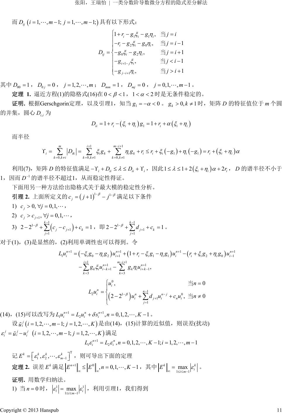![]() Operations Research and Fuzziolgy 运筹与模糊学, 2013, 3, 7-14 http://dx.doi.org/10.12677/orf.2013.32002 Published Online May 2013 (http://www.hanspub.org/journal/orf.html) An Implicit Finite Difference Scheme for Space-Time Fractional Partial Differential Equation* Yang Zhang1, Ruiyi Wang2 1School of Mathematical Science, Nankai University, Tianjin 2School of Science, Hebei University of Technology, Tianjin Email: zhangyang@nankai.edu.cn Received: Apr. 6th, 2013; revised: Apr. 10th, 2013; a cc e p te d : M ay 1 0th, 2013 Copyright © 2013 Yang Zhang, Ruiyi Wang. This is an open access article distributed under the Creative Commons Attribution License, which permits unrestricted use, distribution, and reproduction in any medium, provided the original work is properly cited. Abstract: Fractional order differential equations are generalizations of classical differential equations. They are widely used in the fields of diffusive transport, finance, nonlinear dynamics, signal processing and others. In this paper, an implicit finite difference method for a class of initial-boundary value space-time fractional two-sided space partial differential equatio ns with variable coefficients on a finite domain is established. The stability and convergence order are analyzed for the resulted implicit scheme. With mathematical induction skills, the scheme is proved to be unconditionally stable and convergent. Keywords: Fractional Derivative; Implicit Methods; Stability; Convergence; Error Estimate 一类分数阶导数微分方程的隐式差分解法* 张 阳1,王瑞怡 2 1南开大学数学科学学院,天津 2河北工业大学理学院,天津 Email: zhangyang@nankai.edu.cn 收稿日期:2013 年4月6日;修回日期:2013 年4月10 日;录用日期:2013 年5月10 日 摘 要:分数阶导数微分方程作为通常微分方程的推广,被广泛地应用于工程,物理,信息处理,金 融,水文等领域。本文给出了数值求解一类时间空间分数阶导数的双边空间微分方程的一种隐式差分 格式,并对其稳定性和收敛性进行了理论分析,证明了格式的无条件稳定性并给出了收敛阶估计。 关键词:分数阶导数;隐格式;稳定性;收敛性;误差估计 1. 引言 分数阶导数方程是指方程中含有非整数阶的导数,在反常扩散,粘弹性本构建模,信号处理,控制,流体 力学,图像处理,软物质研究、金融、水文等领域中利用它们来建立数学模型,可以精确地描述这些现象。近 年来,越来越多的学者关注分数阶导数。分数阶导数微分方程,是传统的整数阶微分方程的推广[1-8]。分数阶导 数微积分的研究与兴起,伴随着数字计算机计算技术的提高而迅速发展。双边空间分数阶对流–扩散方程是一 种反常扩散,在地下水溶质运移方面,它可描述含水层中溶质运移过程中的反常扩散现象。关于这类问题的数 值解法 Meerschaert 等人分别对单边对流–扩散方程和双边扩散方程,进行差分求解,如文献[9]针对变系数反应 扩散方程 *资助信息:该工作由中国国家自然科学基金资助(11171168,11071132)。 Copyright © 2013 Hanspub 7 ![]() 张阳,王瑞怡 一类分数阶导数微分方程的隐式差分解法 ,,, , crtcrt crt vrdrf rt tr r 建立显式和隐式两种差分解法,文献[10,11]建立了双边空间分数阶导数微分方程 ,,, ,, uxtuxtuxt cxt csxt txx 数值解法并进行了稳定性分析,文献[12]针对二维分数阶扩散方程 ,,,, ,, ,, uxytuxyt uxyt dxyexyqxyt txy ,, 建立了交替方向隐式差分解法;文献[13]对一维时间分数阶对流–弥散方程 2 2 ,,cxt cxt cxt vD x tx , 给出了差分算法;文献[14,15]用另一种方法对这个问题进行离散计算。文献[16]中针对二维分数阶对流–弥散方程 22 22 ,,,, ,,,,,,c xytc xytc xytc xytc xyt vD xy tx y 建立了数值解法。文献[17]则对时间空间分数阶导数微分方程 ,,,, ,, uxtuxtuxt uxt b xtcxtcs xt txxx , 的显式差分解法进行了研究。目前,关于带时间分数阶导数的双边空间分数阶导数微分方程的隐式解法尚未见 到,本文针对文献[17]中的问题(1 情形)建立了相应的隐式数值解法并进行理论分析,得到了很好的理论结果。 采用隐式差分解法可以有效地增加稳定性能,本文得到的计算格式是无条件稳定的,并且给出了收敛阶的估计, 这些结论拓广了该领域的研究成果。 本文结构如下:第二节针对研究的对象进行了描述,并给出了两个常见的引理;第三节建立了所描述方程 的隐式差分解法并进行了方法的稳定性分析;第四节给出了方法的收敛性分析和收敛阶的估计;第五节总结了 结论与展望。 2. 问题描述 本文针对带分数阶时间空间导数的双边空间微分方程建立隐式差分解法并进行理论分析,研究如下方程: uxtuxtuxt uxt bxtc xtcsxt x tx x (1) 这里,0。其中LxR tT 01 ,12 , ,bxt, ,cxt , ,cxt 均为非负有界函数,并且假定 初始条件: ,以及边界条件 ,0t f xuxL x R ,,Rt 0ux Ltux 。 方程(1)右端的左边(+)以及右边(–)的分数阶导数为 Riemann-Liouville 分数阶导数。按如下方式定义[10]: 1 d1d d dd nx n L fx f n xx xn (2) 和 1 d1 dd dd nnR n x fx f n xx x n (3) Copyright © 2013 Hanspub 8 ![]() 张阳,王瑞怡 一类分数阶导数微分方程的隐式差分解法 这里 是正整数,并且满足 n1nn 。 方程(1)左端的 ,uxt t 由Caputo 分数阶导数给出定义[18]: 0 ,, 1d 1 t uxt ux t t (4) 这里是 Gamma 函数。 根据 Grünwald 估计,为了得到稳定的数值方法[9],定义左右两边分数阶导数分别按如下形式近似(Shifted Grünwald): 0 d1 lim 1 d M k Mk fx g fx kh xh (5) 和 0 d() 1 lim 1 d M k Mk fx g fx kh xh (6) 这里 M , M 均为正整数, x L hM ,Rx hM , 0 11 1,1, 1,2, ! k k k gg k k 。 引理 1. 上式定义的 k g 满足如下条件: 1) ,2) 01g10g ,3) 11 10 ! k k k gk