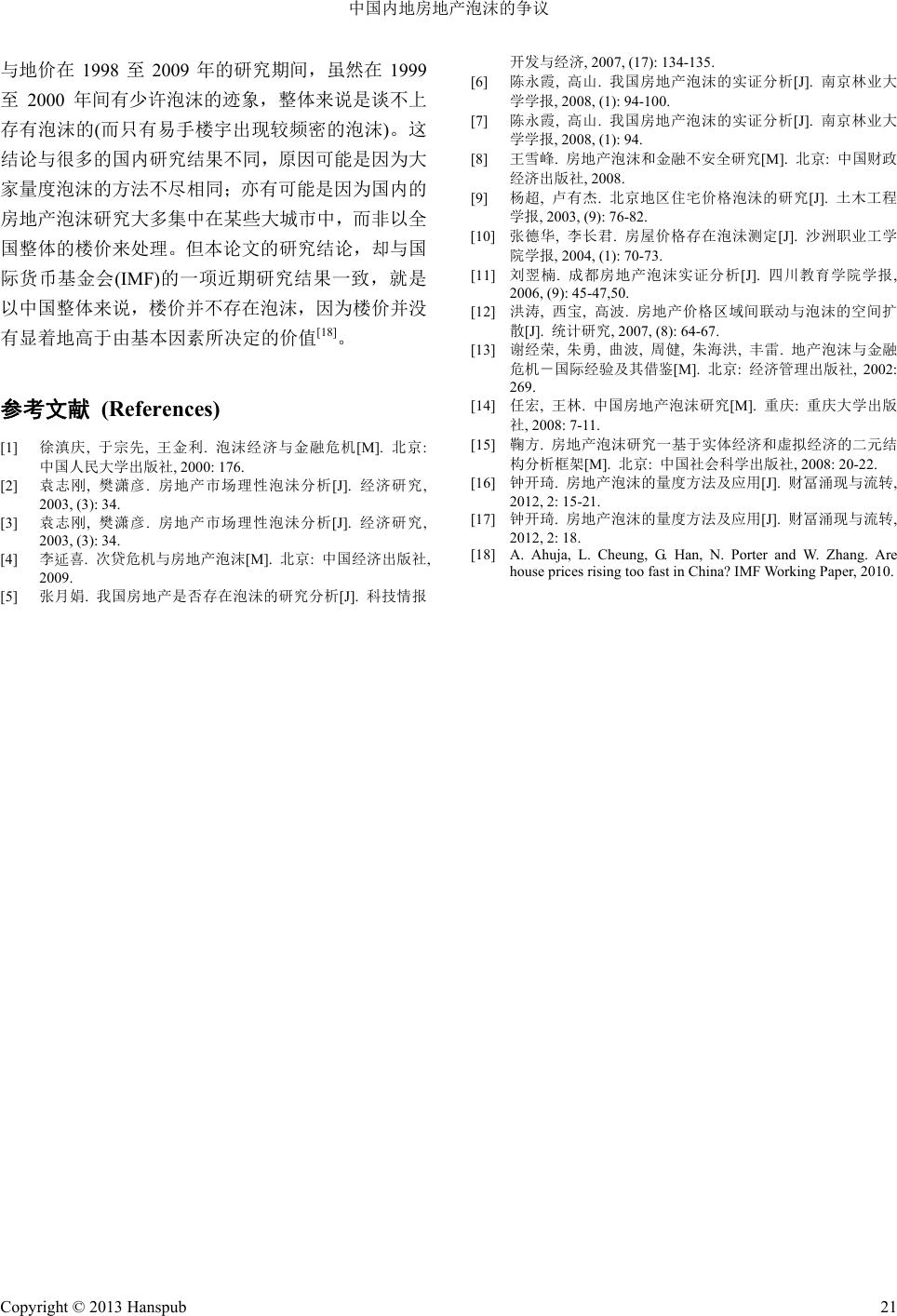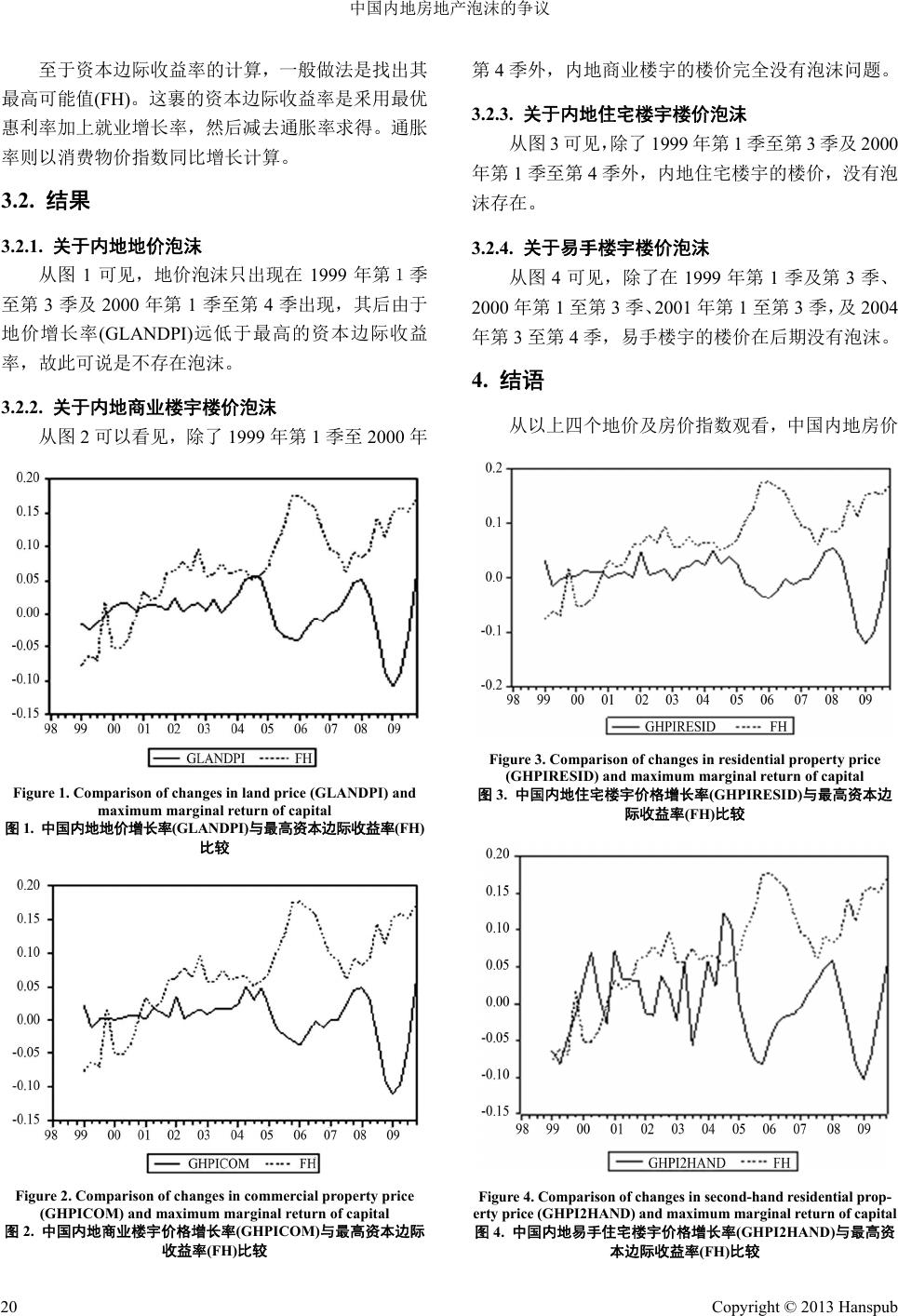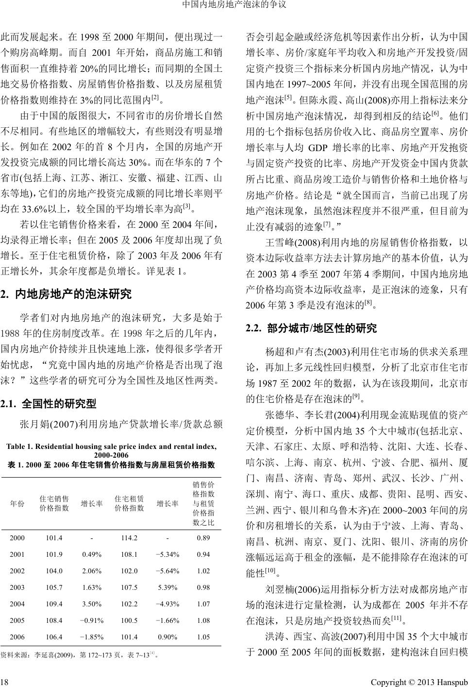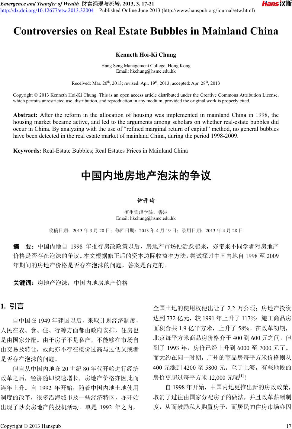![]() Emergence and Transfer of Wealth 财富涌现与流转, 2013, 3, 17-21 http://dx.doi.org/10.12677/etw.2013.32004 Published Online June 2013 (http://www.hanspub.org/journal/etw.html) Controversies on Real Estate Bubbles in Mainland China Kenneth Hoi-Ki Chung Hang Seng Management College, Hong Kong Email: hkchung@hsmc.edu.hk Received: Mar. 20th, 2013; revised: Apr. 19th, 2013; accepted: Apr. 28th, 2013 Copyright © 2013 Kenneth Hoi-Ki Chung. This is an open access article distributed under the Creative Commons Attribution License, which permits unrestricted use, distribution, and reproduction in any medium, provided the original work is properly cited. Abstract: After the reform in the allocation of housing was implemented in mainland China in 1998, the housing market became active, and led to the arguments among scholars on whether real-estate bubbles did occur in China. By analyzing with the use of “refined marginal return of capital” method, no general bubbles have been detected in the real estate market of mainland China, during the period 1998-2009. Keywords: Real-Estate Bubbles; Real Estates Prices in Mainland China 中国内地房地产泡沫的争议 钟开琦 恒生管理学院,香港 Email: hkchung@hsmc.edu.hk 收稿日期:2013 年3月20 日;修回日期:2013 年4月19 日;录用日期:2013 年4月28 日 摘 要:中国内地自 1998 年推行房改政策以后,房地产市场便活跃起来,亦带来不同学者对房地产 价格是否存在泡沫的争议。本文根据修正后的资本边际收益率方法,尝试探讨中国内地自 1998 至2009 年期间的房地产价格是否存在泡沫的问题,答案是否定的。 关键词:房地产泡沫;中国内地房地产价格 1. 引言 自中国在1949 年建国以后,釆取计划经济制度, 人民在衣、食、住、行等方面都由政府安排,住房也 是由国家分配。由于房子不是私产,不能够在市场自 由交易及转让,故此亦不存在楼价过高与过低又或者 是否存在泡沫的问题。 但自从中国内地在20世纪80年代开始进行经济 改革之后,经济随即快速增长,房地产价格亦因此而 连年上升。自 1992年开始,随着中国内地土地使用 制度的改革,很多沿海城市及一些经济特区,亦开始 出现了炒卖房地产的投机活动。单是1992年之内, 全国土地的使用权便出让了 2.2 万公顷;房地产投资 达到 732 亿元,较1991 年上升了 117%;施工商品房 面积合共 1.9亿平方米,上升了 58%。在改革初期, 北京每平方米商品房价格介于400 到600 元之间,但 到了 1993年,房价已经上升到 6000 至7000元了。 而大约在同一时期,广州的商品房每平方米价格则从 400 元涨到4200 至5800 元。至于上海,有些地段的 房价更超过每平方米 12,000 元呢[1]! 自1998 年开始,中国内地更推出新的房改政策, 取消了过往由国家分配房子的做法,并且改革薪酬制 度,从而鼓励私人购置房子,而居民的住房市场亦因 Copyright © 2013 Hanspub 17 ![]() 中国内地房地产泡沫的争议 此而发展起来。在 1998 至2000 年期间,便出现过一 个购房高峰期。而自 2001 年开始,商品房施工和销 售面积一直维持着 20%的同比增长;而同期的全国土 地交易价格指数、房屋销售价格指数、以及房屋租赁 价格指数则维持在 3%的同比范围内[2]。 由于中国的版图很大,不同省市的房价增长自然 不尽相同。有些地区的增幅较大,有些则没有明显增 长。例如在 2002 年的首 8个月内,全国的房地产开 发投资完成额的同比增长高达30%。而在华东的 7个 省市(包括上海、江苏、淅江、安徽、福建、江西、山 东等地),它们的房地产投资完成额的同比增长率则平 均在 33.6%以上,较全国的平均增长率为高[3]。 若以住宅销售价格来看,在2000 至2004 年间, 均录得正增长率;但在 2005 及2006 年度却出现了负 增长。至于住宅租赁价格,除了 2003 年及 2006 年有 正增长外,其余年度都是负增长。详见表 1。 2. 内地房地产的泡沫研究 学者们对内地房地产的泡沫研究,大多是始于 1988 年的住房制度改革。在 1998 年之后的几年内, 国内房地产价持续并且快速地上涨,使得很多学者开 始忧虑,“究竟中国内地的房地产价格是否出现了泡 沫?”这些学者的研究可分为全国性及地区性两类。 2.1. 全国性的研究型 张月娟(2007)利用房地产贷款增长率/货款总额 Table 1. Residential housing sale price index and rental index, 2000-2006 表1. 2000至2006年住宅销售价格指数与房屋租赁价格指数 年份 住宅销售 价格指数 增长率 住宅租赁 价格指数 增长率 销售价 格指数 与租赁 价格指 数之比 2000 101.4 - 114.2 - 0.89 2001 101.9 0.49% 108.1 −5.34% 0.94 2002 104.0 2.06% 102.0 −5.64% 1.02 2003 105.7 1.63% 107.5 5.39% 0.98 2004 109.4 3.50% 102.2 −4.93% 1.07 2005 108.4 −0.91% 100.5 −1.66% 1.08 2006 106.4 −1.85% 101.4 0.90% 1.05 资料来源:李延喜(2009),第 172~173 页,表 7~13[4]。 否会引起金融或经济危机等因素作出分析,认为中国 增长率、房价/家庭年平均收入和房 地产开发投资/固 定资产投资三个指标来分析国内房地产情况,认为中 国内地在1997~2005 年间,并没有出现全国范围的房 地产泡沫[5]。但陈永霞、高山(2008)亦用上指标法来分 析中国房地产泡沫情况,却得到相反的结论[6]。他们 用的七个指标包括房价收入比、商品房空置率、房价 增长率与人均 GDP增长率的比率、房地产开发抱资 与固定资产投资的比率、房地产开发资金中国内货款 所占比重、商品房竣工造价与销售价格和土地价格与 房地产价格。结论是“就全国而言,当前已出现了房 地产泡沫现象,虽然泡沫程度并不很严重,但目前为 止没有减弱的迹象[7]。” 