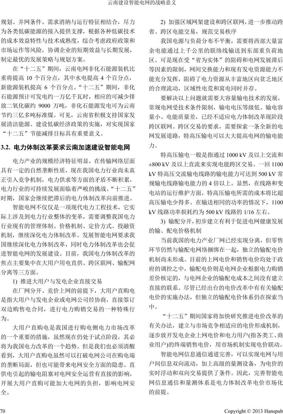 ![]() Smart Grid 智能电网, 2013, 3, 68-73 http://dx.doi.org/10.12677/sg.2013.33012 Published Online June 2013 (http://www.hanspub.org/journal/sg.html) Strategic Significance of Smart Grid Construction in Yunnan* Xuefeng Hu1,2#, Xiangyu Ta n3, Dada Wang3, Xianpi ng Zhao 3, Yajing Gao2, Shengping Zhao1,2, Lei Tian4 1Workstation of North China Electric Power University and Yunnan Power Grid Company, Kunming 2North China Electric Power University, Baoding 3Power Research Institute of Yunnan Power Grid Company, Kunming 4Workstation of Kunming University of Science and Technology in Yunnan Power Grid Company, Kunmin Email: #tohuf.angle@163.com Receiv ed: Apr. 15th, 2013; revised: May 8th, 2013 ; ac ce pted: May 16th, 2013 Copyright © 2013 Xuefeng Hu et al. This is an open access article distributed under the Creative Commons Attribution License, which permits unre- stricted use, distribution, and reproduction in any medium, provided the original work is properly cited. Abstract: Smart grid is safer and more reliable than traditional grid, and it’s more compatible for renewable energy generation, and smart grid is being in plan and construction all over the world. The development trend of power grid at home and abroad and many security problems that Yunnan Power Grid faces require Yunnan Power Grid to speed up the construction of smart grid. This article discusses the strategic significance of smart grid construction in Yunnan Power Grid in the five aspects, i.e. the energy development demand, the national macro policy and reform of the electricity management system requirements, optimization of power grid operation and manag emen t mode, th e pow er grid secur ity requirements and making Yunnan Power Grid achieve the leading position among all the po wer grids of China. Keywords: Smart Grid; Yunnan Power Grid; Strategic Significance 云南建设智能电网的战略意义* 胡雪峰 1,2#,谭向宇 3,王达达 3,赵现平 3,高亚静 2,赵盛萍 1,2,田 雷4 1华北电力大学云南电网公司研究生工作站,昆明 2华北电力大学,保定 3云南电网电力研究院,昆明 4昆明理工大学云南电网公司研究生工作站,昆明 Email: #tohuf.angle@163.com 收稿日期:2013 年4月15 日;修回日期:2013 年5月8日;录用日期:2013 年5月16 日 摘 要:智能电网比常规电网更加安全可靠,可以更好地兼容可再生能源发电并网,世界各地都在规划建设智 能电网。国内外电网发展趋势及云南电网面临的众多安全问题都要求云南电网加快智能电网建设。本文从能源 开发需求、国家宏观政策及电力体制改革要求、优化电网运行和管理模式、电网安全需要和实现在国内省网公 司中的领先地位等五方面探讨了云南电网公司建设智能电网的战略意义。 关键词:智能电网;云南电网;战略意义 1. 引言 自进入信息时代,全球资源、环境压力不断增大, 能源需求不断增加,电力市场化的进程不断深入,用 户对电能可靠性和质量的要求也在不断提升。电力行 业正面临前所未有的挑战和机遇,建设更加安全、可 靠、环保、经济的电力系统已经成为全球电力行业的 共同目标。智能电网具有自愈性、互动性、优化性、 *基金项目:云南电网公司科技项目:云南 智能电 网建设战 略规划 研究(K-YN2012-169)。 #通讯作者。 Copyright © 2013 Hanspub 68 ![]() 云南建设智能电网的战略意义 兼容性以及集成性等优点,可以实现电网安全稳定运 行,降低大规模停电的风险,可以有效利用分布式电 源,提高电网资产利用率,提高用户用电的效率、可 靠性和电能质量[1,2]。建设智能电网已成为国内外电网 企业的共识,云南作为我国电力资源大省,要抓住“西 南开放桥头堡建设”等历史机遇,紧紧围绕把云南打 造成为国家重要的水电基地和清洁能源基地、西电东 送和云电外送基地,积极从政策层面、技术层面探索、 研究、实践符合云南电力自身发展需要的智能电网[3,4]。 2. 云南建设智能电网是能源开发的需要 云南可再生能源资源丰富,电源建设正处于高速 发展时期。截至 2010 年底,云南省总装机 3604 万kW, 其中水电 2435 万kW、火 电1133 万kW,水电比重为 67.6%。“十二五”期间,金沙江、澜沧江水电开发将 继续保持高速增长,云南省预计会新增水电 3400 万 kW,新增火电 700 万kW。2015 年云南全省总装机将 达到 8100 万kW,其中水电 5800 万kW、火电 1800 万kW,水电比重约为 71.6%,新能源 500 万kW,比 重约为 6%。 云南火电装机比重较低,高比重的可再生能源发 电使电网调度运行变得越来越困难。可再生能源发电 接入电网后存在一系列的问题:一是受电源特性以及 用电负荷特性影响,负荷低谷时段,在火电最小开机 方式下,也可能出现电网无法承受突然增加的可再生 能源出力的状况[5];二是风力发电具有随机性、波动 性、反调节性,大规模风电机组接入电网,给电网的 调峰、调频带来困难,加大了电网运行方式安排难度, 对电网安全稳定运行造成一定影响。三是目前投产的 风电机组大多不能进行有功、无功调节,缺乏低电压 穿越等电网安全运行需要的基本功能,也没有功率预 测系统,给电网的安全稳定运行带来了一定威胁。四 是小水电和风电多地处偏远且网架相对薄弱地区,用 电负荷有限,调节手段和能力不足,在电量集中送出 时,线路、变压器等电网设施经常出现过载,影响电 网全稳定运行和供电可靠性。 在传统电网现有条件下,可再生能源发电的接入 要受很多限制。智能电网可以友好兼容各种可再生能 源,可再生能源面临的一系列难题正是智能电网需要 解决的问题。从世界范围来看,建设智能电网是解决 