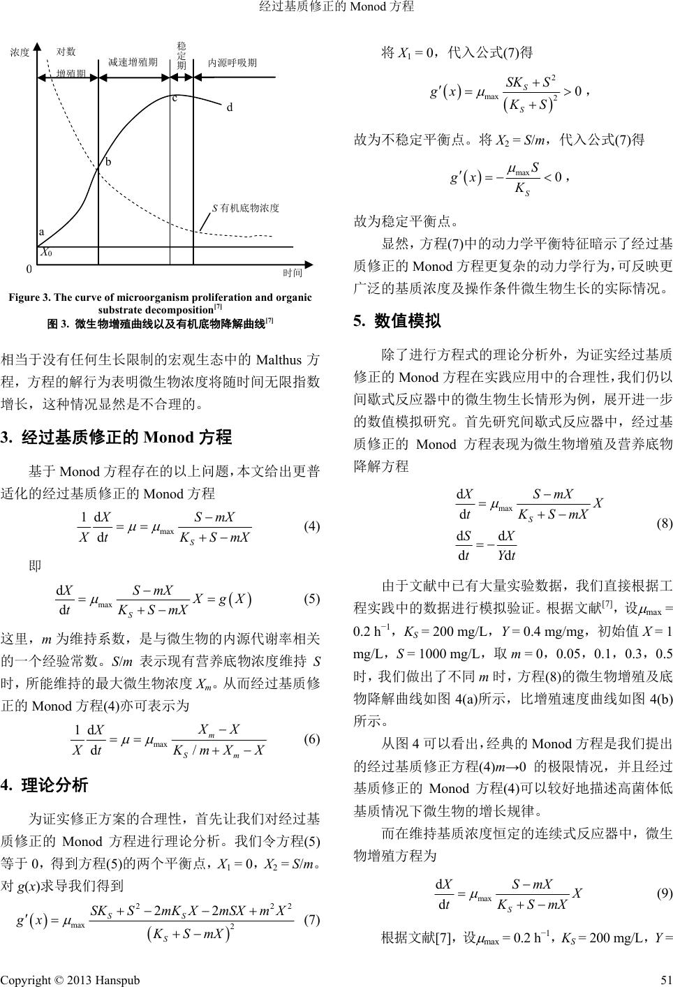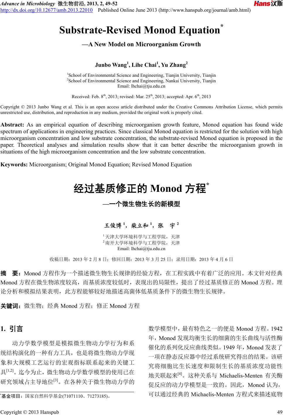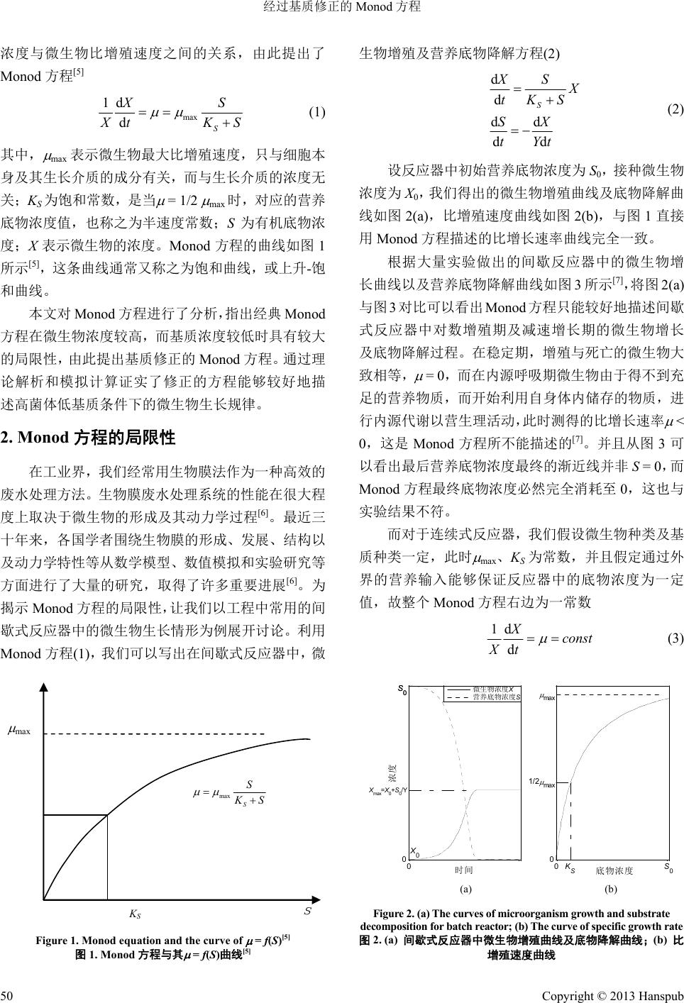 ![]() Advance in Microbiology 微生物前沿, 2013, 2, 49-52 http://dx.doi.org/10.12677/amb.2013.22010 Published Online June 2013 (http://www.hanspub.org/journal/amb.html) Substrate-Revised Monod Equation* —A New Model on Microorganism Growth Junbo W ang1, Lihe Chai1, Yu Zhang2 1School of Environmental Science and Engineering, Tianjin University, Tianjin 2School of Environmental Science and Engineering, Nankai University, Tianjin Email: lhchai@tju.edu.cn Received: Feb. 8th, 2013; revised: Mar. 25th, 2013; accepted: Apr. 6th, 2013 Copyright © 2013 Junbo Wang et al. This is an open access article distributed under the Creative Commons Attribution License, which permits unrestricted use, distribution, and reproduction in any medium, provided the original work is properly cited. Abstract: As an empirical equation of describing microorganism growth feature, Monod equation has found wide spectrum of applications in engineering practices. Since classical Monod equation is restricted for the solution with high microorganism concentration and low substrate concentration, the substrate-revised Monod equation is proposed in the paper. Theoretical analyses and simulation results show that it can better describe the microorganism growth in situations of the high microorganism concentration and the low substrate concentration. Keywords: Microorganism; Original Monod Equation; Revised Monod Equation 经过基质修正的 Monod 方程* —一个微生物生长的新模型 王俊博 1,柴立和 1,张 宇2 1天津大学环境科学与工程学院,天津 2南开大学环境科学与工程学院,天津 Email: lhchai@tju.edu.cn 收稿日期:2013 年2月8日;修回日期:2013 年3月25 日;录用日期:2013年4月6日 摘 要:Monod 方程作为一个描述微生物生长规律的经验方程,在工程实践中有着广泛的应用。本文针对经典 Monod 方程在微生物浓度较高,而基质浓度较低时,表现出的局限性,提出了经过基质修正的Monod 方程。理 论分析和模拟结果表明,此方程能够较好地描述高菌体低基质条件下的微生物生长规律。 关键词:微生物;经典 Monod 方程;修正Monod 方程 1. 引言 动力学数学模型是模拟微生物动力学行为和系 统结构演化的一种有力工具,也是将微生物动力学现 象和大规模工艺运行的宏观指标联系起来的关键工 具[1,2]。迄今为止,微生物动力学数学模型的使用已在 研究领域占主导地位[3]。在各种关于微生物动力学的 数学模型中,最有特色之一的便是Monod 方程。1942 年,Monod 发现均衡生长的细菌的生长曲线与活性酶 催化的系列化反应曲线类似。1949 年,Monod 发表了 一项在静态反应器中经过系统研究得出的结果。该研 究将细胞比生长速度和限制生长的基质浓度功能性 地关联起来[4]。这种关系与 Michaelis-Menten 有关酶 促反应的动力学模型是一致的。因此,Monod 认为, 可以通过经典的 Michaelis-Menten 方程式来描述底物 *基金项目:国家自然科学基金(71071110、71273185)。 Copyright © 2013 Hanspub 49 ![]() 经过基质修正的 Monod 方程 浓度与微生物比增殖速度之间的关系,由此提出了 Monod 方程[5] max 1d dS X S X tK S (1) 其中, max 表示微生物最大比增殖速度,只与细胞本 身及其生长介质的成分有关,而与生长介质的浓度无 关;KS为饱和常数,是当 = 1/2 max 时,对应的营养 底物浓度值,也称之为半速度常数;S为有机底物浓 度;X表示微生物的浓度。Monod 方程的曲线如图 1 所示[5],这条曲线通常又称之为饱和曲线,或上升-饱 和曲线。 本文对 Monod 方程进行了分析,指出经典 Monod 方程在微生物浓度较高,而基质浓度较低时具有较大 的局限性,由此提出基质修正的Monod 方程。通过理 论解析和模拟计算证实了修正的方程能够较好地描 述高菌体低基质条件下的微生物生长规律。 2. Monod方程的局限性 在工业界,我们经常用生物膜法作为一种高效的 废水处理方法。生物膜废水处理系统的性能在很大程 度上取决于微生物的形成及其动力学过程[6]。最近三 十年来,各国学者围绕生物膜的形成、发展、结构以 及动力学特性等从数学模型、数值模拟和实验研究等 方面进行了大量的研究,取得了许多重要进展[6]。为 揭示 Monod 方程的局限性,让我们以工程中常用的间 歇式反应器中的微生物生长情形为例展开讨论。利用 Monod 方程(1),我们可以写出在间歇式反应器中,微 K S S max S S K S max Figure 1. Monod equation and the curve of = f(S)[5] 图1. Monod方程与其 = f(S)曲线[5] 生物增殖及营养底物降解方程(2) d d dd dd S XS X tKS SX tYt (2) 设反应器中初始营养底物浓度为S0,接种微生物 浓度为 X0,我们得出的微生物增殖曲线及底物降解曲 线如图 2(a),比增殖速度曲线如图 2(b),与图 1直接 用Monod 方程描述的比增长速率曲线完全一致。 根据大量实验做出的间歇反应器中的微生物增 长曲线以及营养底物降解曲线如图 3所示[7],将图 2(a) 与图 3对比可以看出 Monod 方程只能较好地描述间歇 式反应器中对数增殖期及减速增长期的微生物增长 及底物降解过程。在稳定期,增殖与死亡的微生物大 致相等, = 0,而在内源呼吸期微生物由于得不到充 足的营养物质,而开始利用自身体内储存的物质,进 行内源代谢以营生理活动,此时测得的比增长速率 < 0,这是 Monod 方程所不能描述的[7]。并且从图 3可 以看出最后营养底物浓度最终的渐近线并非S = 0,而 Monod 方程最终底物浓度必然完全消耗至0,这也与 实验结果不符。 而对于连续式反应器,我们假设微生物种类及基 质种类一定,此时 max、KS为常数,并且假定通过外 界的营养输入能够保证反应器中的底物浓度为一