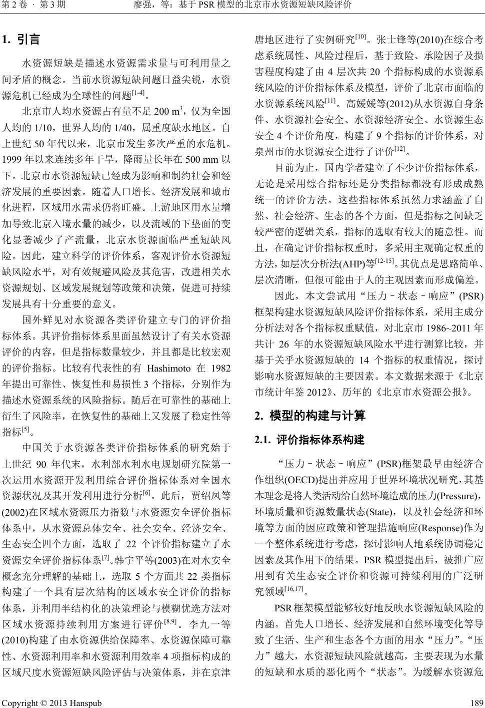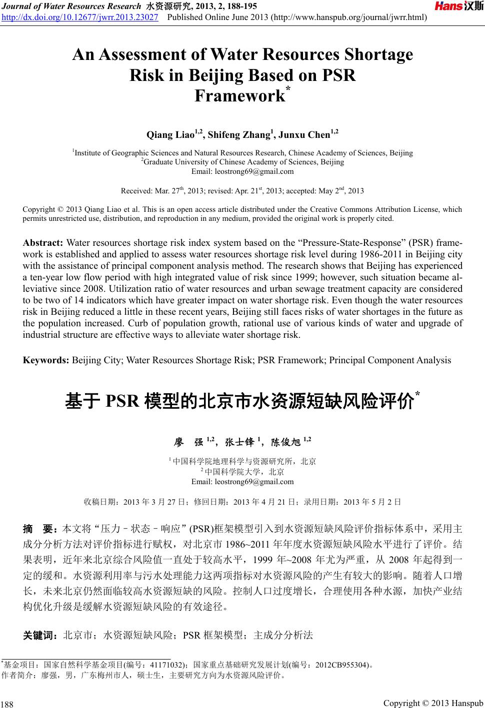 ![]() Journal of Water Resources Research 水资源研究, 2013, 2, 188-195 http://dx.doi.org/10.12677/jwrr.2013.23027 Published Online June 2013 (http://www.hanspub.org/journal/jwrr.html) An Assessment of Water Resources Shortage Risk in Beijing Based on PSR Framework* Qiang Liao1,2, Shifeng Zhang1, Junxu Chen1,2 1Institute of Geographic Sciences and Natural Resources Research, Chinese Academy of Sciences, Beijing 2Graduate University of Chinese Academy of Sciences, Beijing Email: leostrong69@gmail.com Received: Mar. 27th, 2013; revised: Apr. 21st, 2013; accepted: May 2nd, 2013 Copyright © 2013 Qiang Liao et al. This is an open access article distributed under the Creative Commons Attribution License, which permits unrestricted use, distribution, and reproduction in any medium, provided the original work is properly cited. Abstract: Water resources shortage risk index system based on the “Pressure-State-Response” (PSR) frame- work is established and applied to assess water resources shortage risk level during 1986-2011 in Beijing city with the assistance of principal component analysis method. The research shows that Beijing has experienced a ten-year low flow period with high integrated value of risk since 1999; however, such situation became al- leviative since 2008. Utilization ratio of water resources and urban sewage treatment capacity are considered to be two of 14 indicators which have greater impact on water shortage risk. Even though the water resources risk in Beijing reduced a little in these recent years, Beijing still faces risks of water shortages in the future as the population increased. Curb of population growth, rational use of various kinds of water and upgrade of industrial structure are effective ways to alleviate water shortage risk. Keywords: Beijing City; Water Resources Shortage Risk; PSR Framework; Principal Component Analysis 基于 PSR 模型的北京市水资源短缺风险评价* 廖 强1,2,张士锋 1,陈俊旭 1,2 1中国科学院地理科学与资源研究所,北京 2中国科学院大学,北京 Email: leostrong69@gmail.com 收稿日期:2013 年3月27 日;修回日期:2013 年4月21日;录用日期:2013 年5月2日 摘 要:本文将“压力–状态–响应”(PSR)框架模型引入到水资源短缺风险评价指标体系中,采用主 成分分析方法对评价指标进行赋权,对北京市 1986~2011 年年度水资源短缺风险水平进行了评价。结 果表明,近年来北京综合风险值一直处于较高水平,1999 年~2008 年尤为严重,从 2008 年起得到一 定的缓和。水资源利用率与污水处理能力这两项指标对水资源风险的产生有较大的影响。随着人口增 长,未来北京仍然面临较高水资源短缺的风险。控制人口过度增长,合理使用各种水源,加快产业结 构优化升级是缓解水资源短缺风险的有效途径。 关键词:北京市;水资源短缺风险;PSR框架模型;主成分分析法 *基金项目:国家自然科学基金项目(编号:41171032);国家重点基础研究发展计划(编号:2012CB955304)。 作者简介:廖强,男,广东梅州市人,硕士生,主要研究方向为水资源风险评价。 Copyright © 2013 Hanspub 188 ![]() 廖强,等:基于 PSR 模型的北京市水资源短缺风险评价 Copyright © 2013 Hanspub 第2卷 · 第3期 189 1. 引言 水资源短缺是描述水资源需求量与可利用量之 间矛盾的概念。当前水资源短缺问题日益尖锐,水资 源危机已经成为全球性的问题[1-4]。 北京市人均水资源占有量不足200 m3,仅为全国 人均的 1/10,世界人均的 1/40,属重度缺水地区。自 上世纪 50 年代以来,北京市发生多次严重的水危机。 1999 年以来连续多年干旱,降雨量长年在 500 mm以 下。北京市水资源短缺已经成为影响和制约社会和经 济发展的重要因素。随着人口增长、经济发展和城市 化进程,区域用水需求仍将旺盛。上游地区用水量增 加导致北京入境水量的减少,以及流域的下垫面的变 化显著减少了产流量,北京水资源面临严重短缺风 险。因此,建立科学的评价体系,客观评价水资源短 缺风险水平,对有效规避风险及其危害,改进相关水 资源规划、区域发展规划等政策和决策,促进可持续 发展具有十分重要的意义。 国外鲜见对水资源各类评价建立专门的评价指 标体系。其评价指标体系里面虽然设计了有关水资源 评价的内容,但是指标数量较少,并且都是比较宏观 的评价指标。比较有代表性的有 Hashimoto 在1982 年提出可靠性、恢复性和易损性 3个指标,分别作为 描述水资源系统的风险指标。随后在可靠性的基础上 衍生了风险率,在恢复性的基础上又发展了稳定性等 指标[5]。 中国关于水资源各类评价指标体系的研究始于 上世纪 90 年代末,水利部水利水电规划研究院第一 次运用水资源开发利用综合评价指标体系对全国水 资源状况及其开发利用进行分析[6]。此后,贾绍凤等 (2002) 在区域水资源压力指数与水资源安全评价指标 体系中,从水资源总体安全、社会安全、经济安全、 生态安全四个方面,选取了 22个评价指标建立了水 资源安全评价指标体系[7]。韩宇平等(2003)在对水安全 概念充分理解的基础上,选取5个方面共 22类指标 构建了一个具有层次结构的区域水安全评价的指标 体系,并利用半结构化的决策理论与模糊优选方法对 区域水资源持续利用方案进行评价[8,9] 。李九一等 (2010) 构建了由水资源供给保障率、水资源保障可靠 性、水资源利用率和水资源利用效率 4项指标构成的 区域尺度水资源短缺风险评估与决策体系,并在京津 唐地区进行了实例研究[10]。张士锋等( 2010) 在综合考 虑系统属性、风险过程后,基于致险、承险因子及损 害程度构建了由4