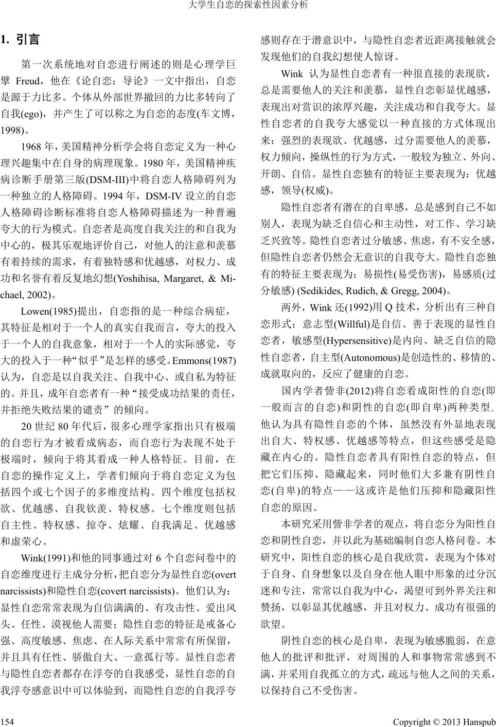 ![]() Advances in Psychology 心理学进展, 2013, 3, 153-161 http://dx.doi.org/10.12677/ap.2013.34025 Published Online July 2013 (http://www.hanspub.org/journal/ap.html) An Exploratory Factor Analysis of the Structure of Undergraduate Narcissism Guihua Wang, Fei Zi Department of Psychology, Beijing Forestry University, Beijing Email: wangguihua519@163.com, fei_z@sohu.com Received: Feb. 21st, 2013; revised: Mar. 5th, 2013; accepted: Mar. 17th, 2013 Copyright © 2013 Guihua Wang, Fei Zi. This is an open access article distributed under the Creative Commons Attribution License, which permits unrestricted use, distribution, and reproduction in any medium, provided the original work is properly cited. Abstract: Objective: To explore the structure of undergraduate narcissism, and distinguish negative narcis- sism and positive narcissism. Methods: 260 undergraduates of Beijing Forestry University were surveyed by the self-made Undergraduate Narcissism Questionnaires. Result: 1) According to exploratory factor analysis, Positive Narcissism was mainly composed of three factors: authority, self-centered and self-focus. Negative Narcissism also was mainly composed of three factors: vulnerability, self-imposed isolation and subordinate others. The six factors explained 59.512% variance; 2) The Cronbach’s Alpha coefficient of the self-made Undergraduate Narcissism Questionnaires was between 0.618 and 0.812. Each factor and Narcissism total score was significantly related, the correlation coefficient was between 0.382 and 0.861 (P < 0. 01); 3) Both Negative Narcissism and Positive Narcissism were significantly related with positive mood (r = −0.257, 0.222, P < 0.01). There were positive correlations between Negative Narcissism and negative mood (r = 0.340, P < 0.01). But Positive Narcissism wasn’t significantly related with Negative mood. Conclusion: With satisfactory reliability and validity, the self-made Undergraduate Narcissism Questionnaires is a good instru- ment can be used in both research and practice. Keywords: Undergraduate; Narcissism; Negative Narcissism; Positive Narcissism 大学生自恋的探索性因素分析 王桂华,訾 非 北京林业大学心理系,北京 Email: wangguihua519@163.com, fei_z@sohu.com 收稿日期:2013 年2月21 日;修回日期:2013 年3月5日;录用日期:2013 年3月17 日 摘 要:目的:初步探索大学生自恋的因子结构,区分阴性自恋和阳性自恋。方法:自编大学生自恋 问卷,采用随机抽样的方法,以北京林业大学 260 名本科生为样本进行研究。结果:1) 通过探索性因 素分析,阳性自恋由权力欲望、自我中心(需求)、自我关注构成,阴性自恋由敏感脆弱、自我孤立和 贬低他人构成,共解释总变异的 59.512%;2) 问卷各个因子的内部一致性系数在 0.618~0.812 之间, 且各因子与自恋问卷总分基本达到中等偏高的显著相关,相关系数在 0.382~0.861 之间(P < 0. 01);3) 阴 性自恋和阳性自恋分别与积极情绪总分存在显著相关(r = −0.257, 0.222, P < 0. 01),阴性自恋与消极情 绪总分存在显著正相关(r = 0.340,P < 0. 01),阳性自恋与消极情绪总分无显著相关。结论:大学生自 恋问卷具有良好的信效度,适用性良好,可以进一步作为后续研究的参考和测量工具。 关键词:大学生;自恋;阴性自恋;阳性自恋 Copyright © 2013 Hanspub 153 ![]() 大学生自恋的探索性因素分析 Copyright © 2013 Hanspub 154 1. 引言 第一次系统地对自恋进行阐述的则是心理学巨 擘Freud,他在《论自恋:导论》一文中指出,自恋 是源于力比多。个体从外部世界撤回的力比多转向了 自我(ego),并产生了可以称之为自恋的态度(车文博, 1998)。 1968 年,美国精神分析学会将自恋定义为一种心 理兴趣集中在自身的病理现象。1980 年,美国精神疾 病诊断手册第三版(DSM-III)中将自恋人格障碍列为 一种独立的人格障碍。1994 年,DSM-IV 设立的自恋 人格障碍诊断标准将自恋人格障碍描述为一种普遍 夸大的行为模式。自恋者是高度自我关注的和自我为 中心的,极其乐观地评价自己,对他人的注意和羡慕 有着持续的需求,有着独特感和优越感,对权力、成 功和名誉有着反复地幻想(Yoshihisa, Margaret, & Mi- chael, 2002)。 Lowen(1985)提出,自恋指的是一种综合病症, 其特征是相对于一个人的真实自我而言,夸大的投入 于一个人的自我意象,相对于一个人的实际感觉,夸 大的投入于一种“似乎”是怎样的感受。Emmons(1987) 认为,自恋是以自我关注、自我中心、或自私为特征 的。并且,成年自恋者有一种“接受成功结果的责任, 并拒绝失败结果的谴责”的倾向。 20 世纪 80 年代后,很多心理学家指出只有极端 的自恋行为才被看成病态,而自恋行为表现不处于 极端时,倾向于将其看成一种人格特征。目前,在 自恋的操作定义上,学者们倾向于将自恋定义为包 括四个或七个因子的多维度结构。四个维度包括权 欲、优越感、自我钦羡、特权感。七个维度则包括 自主性、特权感、掠夺、炫耀、自我满足、优越感 和虚荣心。 Wink(1991)和他的同事通过对 6个自恋问卷中的 自恋维度进行主成分分析,把自恋分为显性自恋(overt narcissists)和隐性自恋(covert narcissists)。他们认为: 显性自恋常常表现为自信满满的、有攻击性、爱出风 头、任性、漠视他人需要;隐性自恋的特征是戒备心 强、高度敏感、焦虑、在人际关系中常常有所保留, 并且具有任性、骄傲自大、一意孤行等。显性自恋者 与隐性自恋者都存在浮夸的自我感受,显性自恋的自 我浮夸感意识中可以体验到,而隐性自恋的自我浮夸 感则存在于潜意识中,与隐性自恋者近距离接触就会 发现他们的自我幻想使人惊讶。 Wink 认为