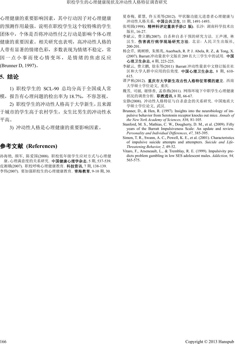 ![]() Advances in Psychology 心理学进展, 2013, 3, 162-166 http://dx.doi.org/10.12677/ap.2013.34026 Published Online July 2013 (http://www.hanspub.org/journal/ap.html) Secondary Vocational Technical School Students’ Mental Health and Impulsive Personality Characteristics Research Yan Zhang, Weihong Wang* Psychology Department, Southwestern University, Chongqing Email: 376905673@qq.com, *wangwh@swu.edu.cn Received: Apr. 1st, 2013; revised: Apr. 24th, 2013; accepted: May 3rd, 2013 Copyright © 2013 Yan Zhang, Weihong Wang. This is an open access article distributed under the Creative Commons Attribution Li- cense, which permits unrestricted use, distribution, and reproduction in any medium, provided the original work is properly cited. Abstract: Objective: Understand secondary vocational technical school students’ mental health and impul- sive personality characteristics of school mental health education and provide a basis for further intervention. Methods: The scl-90 scale and the Barratt Impulsive Scale which developed by the Beijing suicide research and prevention center at Beijing Huilongguan hospital was administered to 2770 students from 3 schools in the Chongqing municipal region who were selected by multi-stage stratified random methods. Results: 1) Mental health problems detection rate is 18.7%; 2) Impulsive personality scale score significantly higher than chongqing university freshmen; 3) Through the regression analysis found that impulsive personality trait in three dimensions in regression model, in which motor on the psychological health of the strongest prediction function. Conclusions: Impulsive personality trait is the important influence factors of the mental health. In the psychological problems to intervene, we should consider different personality traits using targeted method. Keywords: Secondary Vocational Technical School Students; Impulsivity; Mental Health; Research 职校学生的心理健康现状及冲动性人格特征调查研究 张 妍,王卫红* 西南大学心理学部,重庆 Email: 376905673@qq.com, *wangwh@swu.edu.cn 收稿日期:2013 年4月1日;修回日期:2013 年4月24 日;录用日期:2013 年5月3日 摘 要:目的:了解中等职业技术学校学生心理健康状况和冲动性人格特征,为学校心理健康教育和 进步干预提供依据。方法:应用 SCL-90 症状自评量表、经北京回龙观医院自杀与防控中心修订的中 文版 barratt 冲动性人格特征量表,对随机抽取的重庆市 3所职业技术学校 2770名学生进行问卷调查。 结果:1) 报告有心理健康问题的检出率为 18.7%;2) 职校学生的冲动性人格特质量表得分显著高于 重庆大学新生;3) 通过回归分析发现冲动性人格特质中三个维度都进入了回归模型,其中以行动因子 对心理健康的预测作用最强。结论:冲动性人格特质是心理健康的重要影响因素,在对心理问题进行 干预时应考虑不同人格特质采用有针对性的方法。 关键词:中等职业技术学校学生;冲动性;心理健康;调查研究 *通讯作者。 Copyright © 2013 Hanspub 162 ![]() 职校学生的心理健康现状及冲动性人格特征调查研究 Copyright © 2013 Hanspub 163 1. 引言 中等职业技术学校(本文简称职校)学生正处在身 心发展的转折时期,随着学习生活由普通教育向职业 教育转变,他们在自我意识、求职择业、学习和生活 等方面难免产生各种各样的心理困惑或问题。自 2004 年7月教育部印发《中等职业学校学生心理健康教育 指导纲要》(教职成[2004]8 号)以来,社会对职校教育 越来越关注,同时,对其心理健康问题也日益关注。 已有的研究资料表明,低年级职校学生心理健康状况 总体不容乐观,30.8%存在心理健康问题(孙海艳, 2008)。但多数研究是在基于学生心理健康状况现象描 述的前提下提出的关于加强学生心理健康教育必要 性的呼吁(皮湘娥,2007;李伟,2007) 。而对心理健 康状况及其影响因素的实证性调查研究较少,因此无 法描述学生的真实的心理健康情况及其影响因素,对 职校学生的冲动性人格特质的研究更是空白,但根据 国外相关研究,冲动性是一些人群自杀未遂的一个重 要且独立的危险因素(Simon TR, 2001),Vitaro和 Arseneault等人的研究结果显示,14岁儿童的冲动性 水平能预测青少年晚期的病理性赌博(Vitaro, 1999), 夏春梅等人的研究结果表明甲亢患者躯体性冲动、认 知行为冲动与 SCL-90 中多数因子相关(夏春梅, 2012)。近几年青少年冲动伤人杀人的事件屡见报端。 冲动性作为一种突出的人格特质(Stanford MS, 2009), 影响着人类的思维和行为控制,与人们的社会行为存 在着密切联系。但是以往对冲动性的研究大都集中在 儿童和精神病性病人中,对于职校学生的研究还是空 白。 本文通过调查研究以了解职校学生冲动性人格 特征与心理健康状况,并在此基础上研究心理健康和 冲动性人格的关系,以期为职校学生开展有针对性的 心理干预提供可靠的依据。 2. 研究对象与方法 2.1. 研究对象及施测 随机抽取重庆市3所职业技术学校学生2800 名 进行问卷调查,由经过严格培训的研究员主持,在统 一的指导语下,对学生进行统一的集体网络问卷测 试,测试时间约 20 分钟。剔除不完整数据,回收有 效问卷数 2770份。年龄范围为 10~31 岁,平均年龄 为16.13 岁。其中男生 1434人(51.79%),女生1336 人(48.21%)。来自城市的学生 963 人(34.79%),来自 于农村的学生1807 人(65.21%)。 2.2. 研究方法 2.2.1. SCL -9 0症状自评量表(张明圆,1998) 本量表共有 90 个项目,包含有较广泛的精神症 状学内容,从感觉、情感、思维、意识、行为直至生 活习惯、人际关系、饮食睡眠等,均有涉及,每一个 项目均