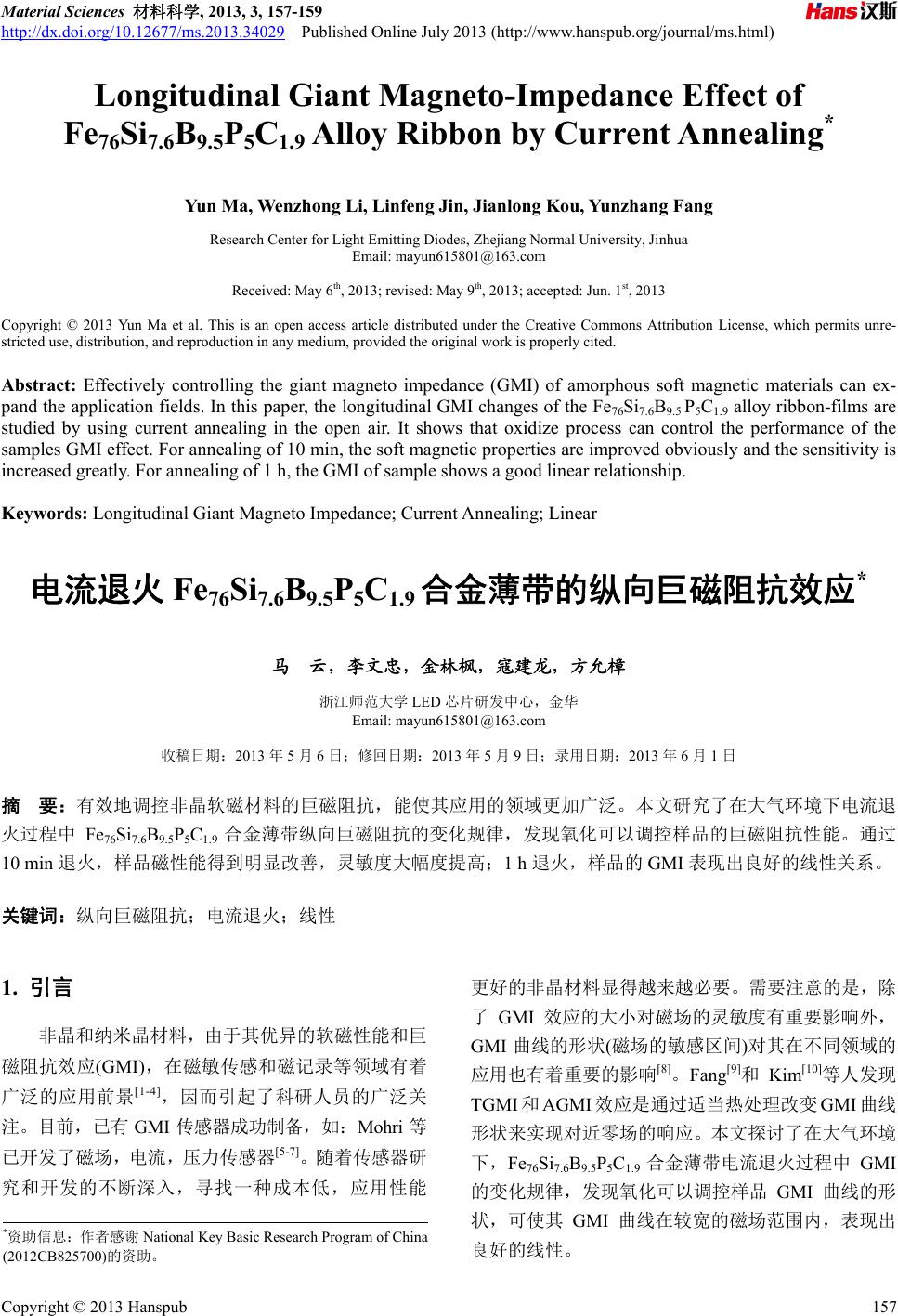 ![]() Material Sciences 材料科学, 2013, 3, 157-159 http://dx.doi.org/10.12677/ms.2013.34029 Published Online July 2013 (http://www.hanspub.org/journal/ms.html) Longitudinal Giant Magneto-Impedance Effect of Fe76Si7.6B9.5P5C1.9 Alloy Ribbon by Current Annealing* Yun Ma, Wenzhong Li, Linfeng Jin, Jianlong Kou, Yunzhang Fa ng Research Center for Light Emitting Diodes, Zhejiang Normal University, Jinhua Email: mayun615801@163.com Received: May 6th, 2013; revised: May 9th, 2013; accepted: Jun. 1st, 2013 Copyright © 2013 Yun Ma et al. This is an open access article distributed under the Creative Commons Attribution License, which permits unre- stricted use, distribution, and reproduction in any medium, provided the original work is properly cited. Abstract: Effectively controlling the giant magneto impedance (GMI) of amorphous soft magnetic materials can ex- pand the application fields. In this paper, the longitudinal GMI changes of the Fe76Si7.6B9.5 P5C1.9 alloy ribbon-films are studied by using current annealing in the open air. It shows that oxidize process can control the performance of the samples GMI effect. For annealing of 10 min, the soft magnetic properties are improved obviously and the sensitivity is increased greatly. For annealing of 1 h, the GMI of sample shows a good linear relationship. Keywords: Longitudinal Giant Magneto Impedance; Current Annealing; Linear 电流退火 Fe76Si7.6B9.5P5C1.9 合金薄带的纵向巨磁阻抗效应* 马 云,李文忠,金林枫,寇建龙,方允樟 浙江师范大学 LED 芯片研发中心,金华 Email: mayun615801@163.com 收稿日期:2013 年5月6日;修回日期:2013年5月9日;录用日期:2013 年6月1日 摘 要:有效地调控非晶软磁材料的巨磁阻抗,能使其应用的领域更加广泛。本文研究了在大气环境下电流退 火过程中 Fe76Si7.6B9.5P5C1.9 合金薄带纵向巨磁阻抗的变化规律,发现氧化可以调控样品的巨磁阻抗性能。通过 10 min 退火,样品磁性能得到明显改善,灵敏度大幅度提高;1 h 退火,样品的 GMI 表现出良好的线性关系。 关键词:纵向巨磁阻抗;电流退火;线性 1. 引言 非晶和纳米晶材料,由于其优异的软磁性能和巨 磁阻抗效应(GMI),在磁敏传感和磁记录等领域有着 广泛的应用前景[1-4],因而引起了科研人员的广泛关 注。目前,已有 GMI 传感器成功制备,如:Mohri 等 已开发了磁场,电流,压力传感器[5-7]。随着传感器研 究和开发的不断深入,寻找一种成本低,应用性能 更好的非晶材料显得越来越必要。需要注意的是,除 了GMI 效应的大小对磁场的灵敏度有重要影响外, GMI曲线的形状 (磁场的敏感区间)对其在不同领域的 应用也有着重要的影响[8]。Fang[9]和Kim[10]等人发现 TGMI 和AGMI 效应是通过适当热处理改变 GMI曲线 形状来实现对近零场的响应。本文探讨了在大气环境 下,Fe76Si7.6B9.5P5C1.9 合金薄带电流退火过程中 GMI 的变化规律,发现氧化可以调控样品 GMI 曲线的形 状,可使其 GMI 曲线在较宽的磁场范围内,表现出 良好的线性。 *资助信息:作者感谢 National Key Basic Research Program of China (2012CB825700)的资助。 Copyright © 2013 Hanspub 157 ![]() 电流退火 Fe76Si7.6B9.5P5C1.9 合金薄带的纵向巨磁阻抗效应 2. 实验 用单辊快淬法喷制宽 0.35 mm,厚 0.033 mm的 Fe76Si7.6B9.5P5C1.9 合金薄带,截成 100 mm,在大气环 境中进行电流退火,退火电流密度为 50 A·mm−2,然 后对其纵向巨磁阻抗进行测量。如图 1所示,测量阻 抗时,截取100 mm 合金带中间部分长度为 15 mm 的 薄带,放入一个线圈内,组成一个等效的阻抗组件。 用频率为300 KHz 的10 mA 正弦交流电驱动线圈,对 样品产生一个纵向的驱动场。线圈为线径 0.11 mm 漆 包线绕制成的100 匝内直径 0.57 mm 的螺线管,外加 的直流磁场由一赫姆赫兹提供,纵向阻抗值 Z采用 HP4294A 型阻抗分析仪测得[11]。 ex max max HH H ZZ Z100% ZZ (1) (1)式中 和分别表示任意外加磁场和最 大外加磁场下样品的阻抗值。 ex max H Z H Z 3. 结果与讨论 图2所示为铸态,电流密度为50 A·mm−2退火 10 Figure 1. Schematic diagram for the measurement of longitudinal giant magneto-impedance 图1. 纵向巨磁阻抗测量原理示意图 -1800 -1200-600060012001800 0 300 600 900 1200 H(A/ m) Z/Z(%) one hour ten min cast Figure 2. GMI curves of samples as-cast, annealed in air for ten minutes and for an hour, resp ectively 图2. 铸态样品,大气中退火 10 分钟和1小时的样品巨磁阻抗 min 和1 h 样品的 GMI 曲线。可以看到,10 min 退火 后样品的灵敏度明显增高,最大阻抗比由铸态的 754%增大到1035%。这种巨磁阻抗性能的改善,是由 于退火过程中薄带成型时的应力得到了释放。随着退 火时间的增长,GMI曲线的最大值减小,曲线展宽, 半高宽增大,在1小时退火后,最大阻抗比下降到 441%,而 GMI 曲线则表现出线性特性。 经拟合在 0~1162 A/m的磁场范围内,线性相关 系数为 0.995。图 3所示为铸态和 1 h 电流退火样品表 面的 XRD 谱线,铸态样品 XRD 谱线典型的馒头峰, 处于非晶状态;1 h 电流退火后样品的 XRD曲线依然 有一明显的馒头峰,处于非晶状态,只多出一个 Fe2O3 的峰,这说明在整个退火过程中样品的没发生相变, 最大阻抗比的变化与氧化有关。 为了进一步确定是否与表面的氧化有关,图4给 出了退火过程,样品表面的变化,为便于观察,在铸 态样品上找到了一适合观察的特征点。从图中可见, 10 min 退火样品表面已经有了一层浅浅的暗色出现, 随着退火时间的增长,这层暗色上不断有新的颗粒长 出,到 1 h时样品表面有大量的不均匀分布的氧化颗 粒形成,这说明在退火过程中,氧化是从样品表面慢 慢开始。这种氧化会导致样品表面合金成分的