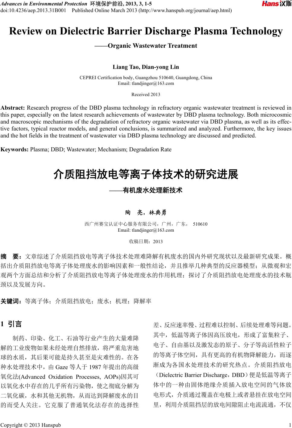 ![]() Advances in Environmental Protection 环境保护前沿, 2013, 3, 1-5 doi:10.4236/aep.2013.31B001 Published Online March 2013 (http://www.hanspub.org/journal/aep.html) Review on Dielectric Barrier Discharge Plasma Technology ——Organic Wa stewater Treatmen t Liang Tao, Dian-yong Lin CEPREI Certification body, Guangzhou 510640, Guangdong, China Email: tlandjinger@163.com Received 2013 Abstract: Research progress of the DBD plasma technology in refractory organic wastewater treatment is reviewed in this paper, especially on the latest research achievements of wastewater by DBD plasma technology. Both microcosmic and macroscopic mechanisms of the degradation of refractory organic wastewater via DBD plasma, as well as its effec- tive factors, typical reactor models, and general conclusions, is summarized and analyzed. Furthermore, the key issues and the hot fields in the treatment of wastewater via DBD plasma technology are discussed and predicted. Keywords: Plasma; DBD; Wastewater; Mechanism; Degradation Rate 介质阻挡放电等离子体技术的研究进展 ——有机废水处理新技术 陶 亮,林典勇 西广州赛宝认证中心服务有限公司,广州,广东, 510610 Email: tlandjinger@163.com 收稿日期:2013 摘 要:文章综述了介质阻挡放电等离子体技术处理难降解有机废水的国内外研究现状以及最新研究成果。概 括出介质阻挡放电等离子体处理废水的影响因素和一般性结论,并且推举几种典型的反应器模型;从微观和宏 观两个方面总结和分析了介质阻挡放电等离子体处理废水的作用机理;探讨了介质阻挡放电处理废水的技术瓶 颈以及发展方向。 关键词:等离子体;介质阻挡放电;废水;机理;降解率 1 引言 制药、印染、化工、石油等行业产生的大量难降 解的工业废物如果未经处理自然排放,将严重危害地 球的水质,其后果可能是持久甚至是灾难性的。在各 种水处理技术中,由Gaze 等人于 1987年提出的高级 氧化法(Advanced Oxidation Processes, AOPs)因其可 以氧化水中存在的几乎所有污染物,使之彻底分解为 二氧化碳,水和其他无机物,从而达到降解废水的目 的而受人关注。它克服了普通氧化法存在的选择性 差、反应速率慢、过程难以控制、后续处理难等问题。 其中,低温等离子体因高压放电,形成了富集粒子、 电子、自由基以及激发态的原子、分子等高活性粒子 的等离子体空间,具有更高的有机物降解能力,而逐 渐成为各国水处理技术的研究热点。介质阻挡放电 (Dielectric Barrier Discharge,DBD)便是低温等离子 体中的一种由固体绝缘介质插入放电空间的气体放 电形式,介质通过覆盖在电极上或者悬挂在放电空间 里,利用介质阻挡层的放电间隙阻止电流流通,不仅 Copyright © 2013 Hanspub 1 ![]() 介质阻挡放电等离子体技术的研究进展 限制了放电电流的无限增长,阻止了极间火花或弧光 的形成而使放电更均匀,还影响放电中微放电的性 质,从而间接影响着介质阻挡放电中的化学过程。介 质阻挡放电相对其他放电方法安全性更高、电极寿命 更长,是近几年来在低温等离子体处理废水领域中发 展起来的新方法[1-3]。 2 DBD等离子体技术的最新研究成果 2.1 概述 近年来,DBD 等离子体逐渐引起难降解有机废水 研究者们的兴趣,也取得了许多令人瞩目的成绩,得 到了一些重要的基础数据和结论。如 Young Sun Mok 等[4-5]利用DBD介质阻挡反应器分别处理偶氮染料酸 性红 27 和橙黄 II 模拟废水,考察了各自的降解机理、 反应过程条件和反应动力学等,并得出染料酸性红 27 能量消耗率为 0.654 kJ/mg,反应动力学常数大约为 0.8;黄兴华等应用高压脉冲 DBD放电对印染废水的 脱色进行的研究得出:合理的电导率对色度的去除起 决定作用;大连理工大学环境电工实验室从 1999 年 开始,对双极性纳秒级窄脉冲介质阻挡放电方式水中 放电的机理进行了深入的研究,并独创性地设计了几 种反应器,对靛蓝的处理研究中发现在两分钟内可以 使溶液的脱色率达到 99%以上。 从已经发表的文献来看,目前在 DBD 等离子处 理废水领域的研究主要集中在考察各种放电参数, pH,降解机理等对难降解有机废水降解率的影响,研 究开发了一些处理各种废水体系的介质阻挡放电反 应器(见表 1)。得到的结论也与研究目的大体一致, 主要表现为以下几点: Table 1. Introduction of DBD reactors 表 1. DBD 反应器简介 反应器装置图 反应器简介 装置特点 研究内容 线-筒式 DBD 反应器:由储水反应 容器、石英管和铜管镶嵌组成。废 水作为接地极。 电极浸在废水直接放电;添 加粉状 TiO2催化剂、H2O2 到污水中 橙黄 II的脱色研 究 线-筒式 DBD 反应器:由石英缸和 同轴陶瓷管组成。放电反应器浸没 在废水中,通入空气。 放电电极浸在废水中与废 水直接接触;可以进行批处 理而不影响降解率 酸性红 27脱色研 究 环-筒式DBD反应器:反应容器分为 上下石英反应罐,下半部用来储存 废水为接地极。 采用罐式结构,规模较大, 使得反应空间可以控制,更 接近于实际应用 敌草隆废水液降 解机理 板-板式 DBD 反应器:反应器介质 阻挡层为平行的有机玻璃,电极为 不锈钢,碘化钾溶液用于收集馏分 和废气。 连续进料;介质阻挡放电可 以循环再生;以活性炭为吸 附催化剂进行脱色的研究 酸性橙的脱色研 究 Copyright © 2013 Hanspub 2 ![]() 介质阻挡放电等离子体技术的研究进展 2.2 电导率和 pH 对降解过程的影响 降低废水电导率和使用恰当的pH 均可提高降解 率:张若冰等[6]考察三相放电等离子体降解苋菜红的 研究,得出