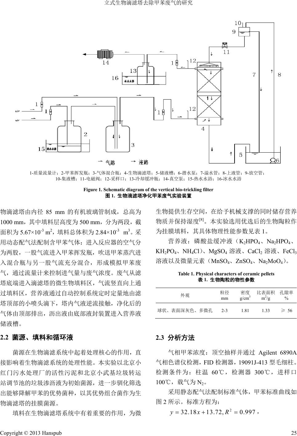 ![]() Advances in Environmental Protection 环境保护前沿, 2013, 3, 24-28 doi:10.4236/aep.2013.31B007 Published Online March 2013 (http://www.hansp u b . o rg/journal/aep.html) Removal of Toluene Contained Gas by Vertical Bio-trickling Filter Jian Li1, Yi ng Chen1, Jia Liu1, Chunjing Liu2 1College of Environmental and Energy Engineering, Beijing University of Technology, Beijing 100124, China 2College of Resources and environmental science, Agricultural University of Hebei, Hebei 071001, China Email: ljian@bjut.edu.cn, rubychenying2010@emails.bjut.edu.cn Received 2013 Abstract: The contained gas purification by vertical bio-trickling filter was performed with tolu ene as target pollutant, ceramists as packing material and the efficient composite bacteria as degrading bacteria, the efficient assorted bacteria are obtained from earlier experiments. The start-up process of the bio-trickling filter was studied; the effects of inlet toluene concentration and short-term stop on removal capacity under stable operation stage were also investigated. Keywords: Toluene; Bio-trickling Filter; Start-up; Stable Operation; Adsorption 立式生物滴滤塔去除甲苯废气的研究 李 坚1,陈 英1,刘 佳1,刘春敬 2 1北京工业大学环境与能源工程学院,北京 100024 2河北农业大学资源与环境科学学院,保定 071001 Email: ljian@bjut.edu.cn, rubychenying2010@emails.bjut.edu.cn 收稿日期:2013 摘 要:本实验以甲苯为目标污染物、陶粒为填料、实验室前期驯化筛选得到的优势甲苯组合菌为菌源进行实 验,研究立式生物滴滤塔的挂膜启动情况及在稳定运行阶段甲苯进气浓度、短期停置对甲苯去除率的影响。 关键词:甲苯;生物滴滤塔;挂膜启动;稳定运行;吸附 1 引言 生物处理工艺广泛应用于工业废气、恶臭污染 物、有机废气等处理,主要包括生物过滤、生物洗涤 和生物滴滤工艺[1]。生物滴滤是一种介于生物过滤和 生物洗涤之间的生物处理技术,具有生物量多,反应 条件(pH、湿度)易于控制,净化效率高,适合处理 低浓度、大气量的挥发性有机物(VOCs)等特点[2]。 近年来,生物滴滤法去除 VOCs 污染物已经成为国内 外学者的研究热点,主要集中在填料特性[3]、目标污 染物[4]、反应机理[5]、高效降解菌[6]、反应器结构设计 [7]等内容上。 传统生物滴滤工艺多采用混合菌污泥作为菌源 直接进行滴滤反应器的挂膜启动,在运行过程中,容 易出现堵塞现象。本实验以前期驯化筛选出的高效甲 苯组合菌为菌源、甲苯为目标污染物、陶粒为填料进 行实验,研究了生物滴滤塔的挂膜启动情况及在稳定 运行阶段甲苯进气浓度、短期停置对甲苯去除率的影 响。 2 材料和方法 2.1 实验装置 基金资助项目:国家自然科学基金(21107004);高等学校博士学科 点专项科研基金资助课题(20101103120018) 生物滴滤塔去除甲苯的实验流程如图 1所示。生 Copyright © 2013 Hanspub 24 ![]() 立式生物滴滤塔去除甲苯废气的研究 1-质量流量计;2-甲苯挥发瓶;3-气体混合瓶;4-生物滴滤塔;5-储液槽;6-潜水泵;7-溢水管;8-上液管;9-放空管; 10-集液槽;11-电磁阀;12-采样口;13-冷却缓冲瓶;14-真空泵;15-热水水浴;16-冰水水浴 Figure 1. Schematic diagram of the vertical bio-trickling filter 图1. 生物滴滤塔净化甲苯废气实验装置 物滴滤塔由内径 85 mm的有机玻璃管制成,总高为 1000 mm,其中填料层高度为 500 mm,分为两段,截 面积为 5.67×10-3 m2,填料总体积为 2.84×10-3 m3。采 用动态配气法配制含甲苯气体:进入反应器的空气分 为两股,一股气流进入甲苯挥发瓶,吹送甲苯蒸汽进 入混合瓶与另一股气流充分混合,形成模拟甲苯废 气,通过流量计来控制进气量与废气浓度。废气从滤 塔底端进入滴滤塔的微生物填料区,气流竖直向上通 过填料区,营养液通过自动控制系统定时定量地由滤 塔顶部的小喷头滴下,塔内气液逆流接触,净化后的 气体由顶部排出,沥出液由底部液封装置进入营养液 储液槽。 2.2 菌源、填料和循环液 菌源在生物滴滤系统中起着处理核心的作用,直 接影响着生物滴滤系统的处理性能。本实验以北京小 红门污水处理厂的活性污泥和北京小武基垃圾转运 站调节池的垃圾渗沥液为初始菌源,进一步驯化筛选 出能够降解甲苯的优势菌种,以其优势组合菌作为生 物滴滤塔的挂膜菌源。 填料在生物滴滤塔系统中有着重要的作用,为微 生物提供生存空间,在给予机械支撑的同时储存营养 物质并保持湿度[8]。本实验选用优选后的生物陶粒作 为挂膜填料,其具体物理性能参数见表 1。 营养液:磷酸盐缓冲液(K2HPO4、Na2HPO4、 KH2PO4、NH4Cl)、MgSO4溶液、CaCl2溶液、FeCl3 溶液以及微量元素(MnSO4、ZnSO4、Na2MoO4)。 Table 1. Physical characters of ceramic pellets 表1. 生物陶粒的物性参数 外观 粒径 mm 密度 g/cm3 比表面积 m2/g 孔隙率 % 球状、表面深灰色、多微孔 2-3 1.81 1.33 ≥ 56 2.3 分析方法 气相甲苯浓度:顶空抽样并通过 Agilent 6890A 气相色谱仪检测,FID 检测器,19091J-413 型毛细柱。 检测条件为:柱温 60℃,检测器 300℃,进样口 100℃,载气为 N2。 采用静态配气法配制标准气体,甲苯标准曲线如 图2所示。标准方程为: 2 32.18 13.72,0.997yx R , Copyright © 2013 Hanspub 25 ![]() 立式生物滴滤塔去除甲苯废气的研究 式中:y—甲苯质量浓度,mg/m3;x—峰面积。 2.4 评价指标 在净化系统不漏风,即进、出口气量相同的情况 下,生物滴滤塔的主要净化工艺指标如下: 1) 去除效率 η,废气的净化程度,其数学表达式 为: 2 1/ CC 1 (1) 式中:η—净化效率,%;C1—气体入口浓度,mg/m3; C2—气体出口浓度,mg/m3。 2) 进气