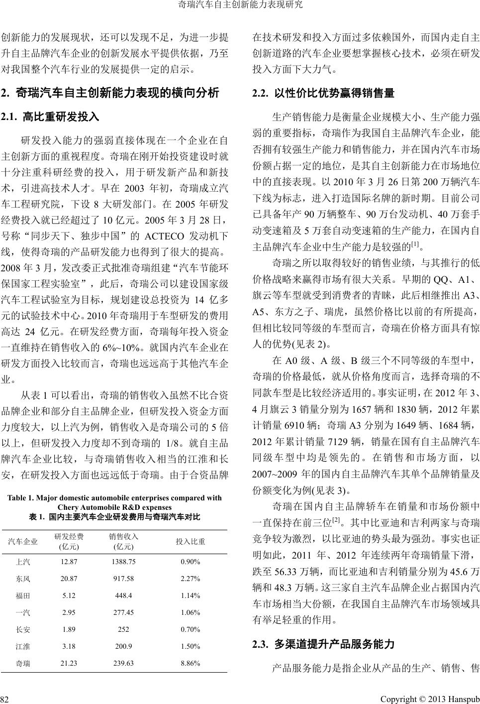 ![]() Service Science and Management 服务科学和管理, 2013, 2, 81-89 http://dx.doi.org/10.12677/ssem.2013.23014 Published Online July 2013 (http://www.hanspub.org/journal/ssem.html) The Studies of Chery’s Ability of Independent Innovation Performance* Kui Zhao, Fang Liu, Min Xu Anhui University of Technology, Ma’a nshan Email: 935696010@qq.com Received: Jun. 4th, 2013; revi se d: J un. 10th, 2013; acce p ted: J u n. 24th, 2013 Copyright © 2013 Kui Zhao, Min Xu. This is an open access article distributed under the Creative Commons Attribution License, which permits unrestr i ct e d u s e , distribution, and reproducti o n i n a n y medium, provided th e original work is properly cited. Abstract: During the National Twelfth Five-Year Plan period, the government has opened a new policy of the auto industry, aiming at pushing the adjustment of industry structure, mergers and acquisitions, as well as promoting independent innovation of car enterprises. As a representative of our own brand, Chery is adhering to the road of self-innovation, gaining substantial achievement in all aspects. Based on four actors as R&D, Production & Sales, Service and Organizational Management, it has made horizontal and vertical compara- tive analysis and factor analysis, making good example for self-innovation capacity of our domestic brand. Keywords: Independent Innovation Ability; Comparison and Analysis; Facto r Analysis 奇瑞汽车自主创新能力表现研究* 赵 奎,刘 芳,徐 敏 安徽工业大学,马鞍山 Email: 935696010@qq.com 收稿日期:2013 年6月4日;修回日期:2013 年6月10 日;录用日期:2013 年6月24 日 摘 要:“十二五”期间,国家出台了新的汽车产业政策,力求推动汽车行业结构调整和兼并重组, 促进我国汽车企业提高自主创新能力。奇瑞是我国自主品牌汽车的代表性企业,坚持走自主创新道路, 在各个方面都取得一定的成就。通过从科研研发能力、生产销售能力、产品服务能力和组织管理能力 四个方面选取代表性指标,进行了横向与纵向的对比分析和因子分析,为提升国有汽车品牌自主创新 能力提供一定的借鉴意义和启示。 关键词:自主创新能力;对比分析;因子分析 1. 引言 企业自主创新能力就是企业在市场竞争中,通过 有效运用企业内外的各种优势资源、建立新的技术平 台或对已有技术进行重大改进而形成自己的核心技 术,并取得自主知识产权,使企业能不断增强其核心 竞争力,获得持续竞争优势的自主创新过程中所表现 出来的各种能力的有机综合。汽车企业的自主创新能 力一般包括:研发投入能力、生产销售能力、产品服 务能力、组织管理能力等四个方面。奇瑞在我国自主 品牌的汽车企业中,创造了中国汽车发展的奇迹,开 创了我国汽车自主品牌成功的典范。从 1999 年第一 台轿车下线,到 2010 年68.21 万辆的销售量,是国内 自主品牌汽车中的领先者。通过分析奇瑞汽车的自主 创新能力,不仅可以看出我国汽车企业目前总体自主 *基金项目:安徽工业大学研究生创新研究基金。 Copyright © 2013 Hanspub 81 ![]() 奇瑞汽车自主创新能力表现研究 创新能力的发展现状,还可以发现不足,为进一步提 升自主品牌汽车企业的创新发展水平提供依据,乃至 对我国整个汽车行业的发展提供一定的启示。 在技术研发和投入方面过多依赖国外,而国内走自主 创新道路的汽车企业要想掌握核心技术,必须在研发 投入方面下大力气。 2. 奇瑞汽车自主创新能力表现的横向分析 2.2. 以性价比优势赢得销售量 2.1. 高比重研发投入 生产销售能力是衡量企业规模大小、生产能力强 弱的重要指标,奇瑞作为我国自主品牌汽车企业,能 否拥有较强生产能力和销售能力,并在国内汽车市场 份额占据一定的地位,是其自主创新能力在市场地位 中的直接表现。以 2010 年3月26日第 200 万辆汽车 下线为标志,进入打造国际名牌的新时期。目前公司 已具备年产 90 万辆整车、90 万台发动机、40 万套手 动变速箱及 5万套自动变速箱的生产能力,在国内自 主品牌汽车企业中生产能力是较强的[1]。 研发投入能力的强弱直接体现在一个企业在自 主创新方面的重视程度。奇瑞在刚开始投资建设时就 十分注重科研经费的投入,用于研发新产品和新技 术,引进高技术人才。早在 2003 年初,奇瑞成立汽 车工程研究院,下设 8大研发部门。在 2005 年研发 经费投入就已经超过了 10亿元。2005 年3月28 日, 号称“同步天下、独步中国”的 ACTECO 发动机下 线,使得奇瑞的产品研发能力也得到了很大的提高。 2008 年3月,发改委正式批准奇瑞组建“汽车节能环 保国家工程实验室”,此后,奇瑞公司以建设国家级 汽车工程试验室为目标,规划建设总投资为 14 亿多 元的试验技术中心。2010 年奇瑞用于车型研发的费用 高达 24 亿元。在研发经费方面,奇瑞每年投入资金 一直维持在销售收入的 6%~10%。就国内汽车企业在 研发方面投入比较而言,奇瑞也远远高于其他汽车企 业。 奇瑞之所以取得较好的销售业绩,与其推行的低 价格战略来赢得市场有很大关系。早期的 QQ、A1、 旗云等车型就受到消费者的青睐,此后相继推出 A3、 A5、东方之子、瑞虎,虽然价格比以前的有所提高, 但相比较同等级的车型而言,奇瑞在价格方面具有惊 人的优势(见表 2)。 在A0 级、A级、B级三个不同等级的车型中, 奇瑞的价格最低,就从价格角度而言,选择奇瑞的不 同款车型是比较经济适用的。事实证明,在 2012 年3、 4月旗云 3销量分别为 1657 辆和 1830 辆,2012 年累 计销量 6910 辆;奇瑞 A3 分别为1649 辆