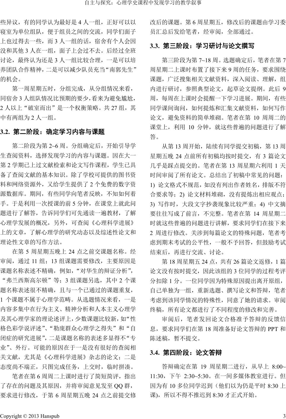 ![]() Creative Education Studies创新教育研究, 2013, 1, 1-5 http://dx.doi.org/10.12677/ces.2013.11001 Published Online August 2013 (http://www.hanspub.org/journal/ces.html) Autonomy and Exploration: Teaching Narrative about Discovery Learning of History of Psychology* Xianhua Liu Department of Educational Science, Hengyang Normal University, Hengyang Email: lxhxlx203@163.com Received: Jun. 25th, 2013; revised: Jul. 8th, 2013; accepted: Jul. 19th, 2013 Copyright © 2013 Xianhua Liu. This is an open access article distributed under the Creative Commons Attribution License, which per- mits unrestricted use, distribution, and reproduction in any medium, provided the original work is properly cited. Abstract: History of Psychology is a core curriculum for under-graduated students of Applied Psychology. The present study explored discovery learning during curriculum teaching of History of Psychology by the method of narrative research. The results showed that discovery learning highlighted autonomy, research and innovativeness. Discovery learning effectively promoted curriculum teaching of History of Psychology and was accepted by students. Applying discovery learning during curriculum teaching of History of Psychology embodied the changes of teaching concept and teaching behavior from teacher-centeredness to student-cen- tered. Keywords: History of Psychology; Teaching; Discovery Learning; Narrative Research 自主与探究:心理学史课程中发现学习的教学叙事* 刘衔华 衡阳师范学院教育科学系,衡阳 Email: lxhxlx203@163.com 收稿日期:2013 年6月25 日;修回日期:2013 年7月8日;录用日期:2013 年7月19 日 摘 要:心理学史是本科应用心理学专业的核心课程。本研究采用叙事研究方法,探讨了心理学史课 程教学中的发现学习。结果显示,发现学习突出了大学学习的自主性、研究性和创新性,有效地促进 了心理学史课程教学,并得到了学生们的接受和认可。心理学史课程教学中发现学习的应用体现了从 “以教师为中心”到“以学生为中心”教学观念和教学行为的转变。 关键词:心理学史;教学;发现学习;叙事研究 1. 引言 心理学史是本科应用心理学专业的核心课程与 基础课程,心理学史课程教学对于培养和提高学生的 心理学理论素养具有其他课程所不能替代的重要作 用。美国心理学史家黧黑曾指出,“研究心理学史是 为了理解心理学是什么以及它曾经是什么”[1]。美国 著名心理学史家波林说过,“我相信心理学家只有知 道了心理学史,才算是功行完满”[2]。 自2003 年开始,笔者一直承担应用心理学专业 本科生的心理学史课程的教学工作,深感心理学史的 教学存在诸多困难和问题,主要表现在以下几个方 面:1) 教学内容多,教学时数短。最初教学时数为 *基金项目:湖南省普通高等学校教学改革研究项目(湘教通[2011] 315 号:525)。 Copyright © 2013 Hanspub 1 ![]() 自主与探究:心理学史课程中发现学习的教学叙事 68 个学时,但随着培养计划中选修课程的不断增加, 心理学史课程的教学时数一减再减,现为 48 个学时。 2) 教师自主性小,教学方法单一。早些年,学校主管 部门对教师教学统得过死,如选定教材的内容都得教 完,教学进度快慢不能超过 2个学时,任课教师为保 持教学内容体系的完整,赶进度,只好采用讲授法蜻 蜓点水般择其要而教之,未能引导学生进行深入思考 和讨论。3) 学生缺乏兴趣,死记硬背。心理学史理论 性很强,抽象而枯燥,学生普遍缺乏学习兴趣,缺乏 批判性思维和创新学习精神,课堂沉闷,带动不起来, 平时不学,考时搞突击,要求老师点重点,只求考个 好分数,考后即忘。因此,心理学史的教学无法实现 引导学生探索和掌握心理学思想形成和发展的历史 与体系、培养和提高学生心理学的批判性思维和历史 性思维能力的教学目标。 近年来,笔者所在高校倡导教学改革,教师教学 自主权大大增加,笔者根据多年教学经验,着手对心 理学史的教学进行改革,加强了教学中师生的交流互 动,学生参与教学,尤其注重学生的发现学习,即把 自主学习、研究学习和创新性学习结合起来,以“自 主为前提、研究为手段、创新为目的”进行学习,实 现发现学习三种方式的转换和升华,使学生真正“学 会学习”,同时把过程性评价和终结性评价结合,加 强对教学过程的全程监控,有效地提高了心理学史的 课程教学质量。本研究拟采用叙事研究的方法,对学 生的心理学史课程的发现学习进行探索,以更深入地 促进心理学史的教学改革,提高教学质量。 2. 研究方法 2.1. 研究方法的选择 本研究采用教育叙事研究方法。所谓教育叙事研 究,是指以叙事的方式开展的教育研究。它是通过对 有意义的教学事件、教师生活和教育教学实践经验的 描述、分析、发掘或揭示内隐于日常事件、生活和行 为背后的意义、思想或理念,从而帮助教师改进自身 的教育教学实践,以更鲜活的形式丰富教育科学理 论,并促使教育政策的制定与实施更加完善和灵活的 一种质的研究方法[3]。具体而言,本研究采用自传式 叙事研究,即以教师作为研究者对自身教育、教学和 科研等方面经历的研究,属于“教师的叙事研究”。 康奈利、克兰迪宁认为“自传研究对于探索教师的个 人化实践知识来说,是一个非常有用的起点”[4]。 2.2. 确定研究对象 本研究的探究对象即研究者自身。笔者先后获得 学校教育专业学士学位、基础心理学专业硕士和应用 心理学专业博士学位,现正从事心理学博士后研究工 作。2003 年开始,笔者一直承担应用心