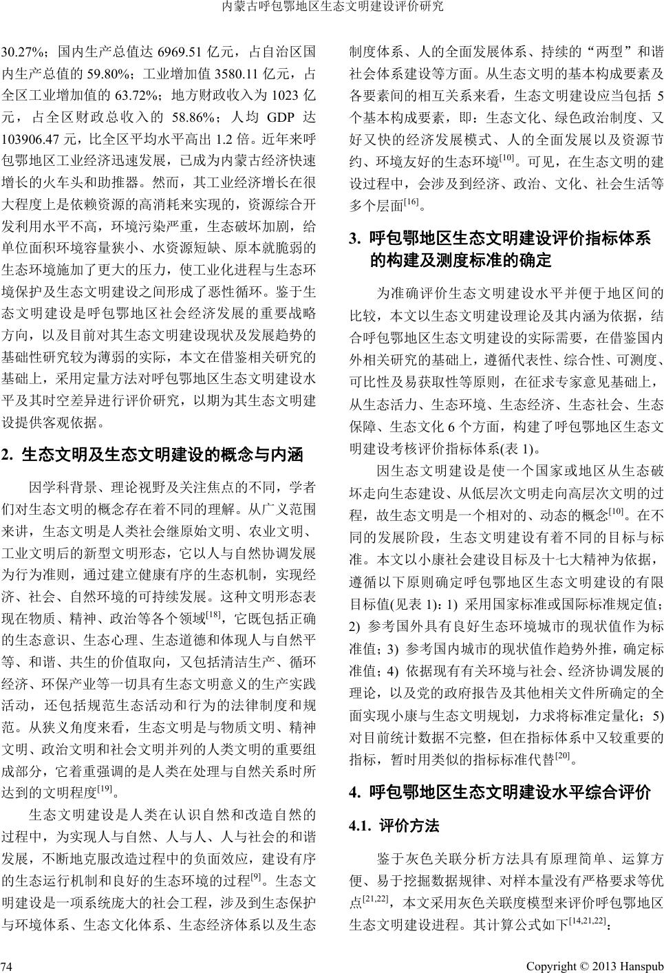 ![]() Geographical Science Research 地理科学研究, 2013, 2, 72-81 http://dx.doi.org/10.12677/gser.2013.23009 Published Online August 2013 (http://www.hanspub.org/journal/gser.html) Evaluation of the Ecological Civilization Construction of HuBaoE Area in Inner Mongolia* Jianghong Zhen, Lingmin Li, Jing He College of Geography Science, Inner Mongolia Normal University, Huhhot Email: zhenjianghong@sina.com Received: Apr. 10th, 2013; revised: May 12th, 2013; accepted: May 19th, 2013 Copyright © 2013 Jianghong Zhen et al. This is an open access article distributed under the Creative Commons Attribution License, which permits unrestricted use, distribution, and reproduction in any medium, provided the original work is properly cited. Abstract: Correct judgement of regional ecological civilization construction stage and its evolution charac- teristics has an important significance to alleviate the ecological crisis and to accelerate the ecological civili- zation construction. Based on the concept and objective of ecological civilization construction, this paper constructs a comprehensive evaluation index system, standard and assessment model of ecological civiliza- tion construction. Using the Analytical Hierarchy Process based on the entropy technical support and the grey correlation method, the paper calculates and analyzes the ecological civilization construction level and the spatial-temporal change of HuBaoE area in Inner Mongolia during 1990-2010. The results show: The eco- logical civilization construction level of HuBaoE area has risen ceaselessly since 1990, and it has entered the middle stage of ecological civilization construction. The development speed of ecological civilization con- struction had stage characteristics during the study period and it has entered the period of accelerated devel- opment since 2000. In recent years, the ecological civilization construction level of HuBaoE area is superior to the average level of Inner Mongolia. But there are regional differences of the ecological civilization con- struction level and its development speed among HuBaoE cities, and the development trend of each compo- nent index were not the same. The overall level of the ecological civilization construction is better in Hohhot city, the development speed of ecological civilization construction is faster in Baotou city. Ecological envi- ronment, ecological security and ecological economic index improved significantly during the study period, while ecological society and ecological culture construction level are relatively low and develop slowly. Keywords: HuBaoE Area; Ecological Civilization Construction; Comprehensive Index; Spatial-Temporal Change; Assessment 内蒙古呼包鄂地区生态文明建设评价研究* 甄江红,李灵敏,贺 静 内蒙古师范大学地理科学学院,呼和浩特 Email: zhenjianghong@sina.com 收稿日期:2013 年4月10 日;修回日期:2013年5月12 日;录用日期:2013年5月19日 摘 要:正确判断区域生态文明建设水平及其演进特征,对缓解生态危机、推进生态文明建设具有重 要意义。基于生态文明建设的内涵与目标,本文构建了生态文明建设综合评价指标体系、标准与模型, 运用熵技术支持下的层次分析与灰色关联方法,对 1990~2010 年间内蒙古呼包鄂地区生态文明建设水 平及其时空变化进行了测度与分析。结果表明:1990 年以来呼包鄂地区生态文明建设水平不断提高, 现已进入生态文明建设的中级阶段;研究时段内呼包鄂地区生态文明建设具有阶段性特征,2000 年以 来开始步入加速发展时期,近年来生态文明建设状况优于全区平均水平。但研究区生态文明建设水平 *基金资助:国家自然科学基金项目(41261109)、内蒙古自然科学基金项目(2012MS0617)资助。 Copyright © 2013 Hanspub 72 ![]() 内蒙古呼包鄂地区生态文明建设评价研究 Copyright © 2013 Hanspub 73 及其发展速度具有区域差异,生态文明建设各分量指数的发展趋势亦不尽相同,其中以呼和浩特市生 态文明建设的总体水平较好,包头市生态文明建设发展速度较快;生态环境、生态保障与生态经济指 数显著提高,而生态社会与生态文化建设水平相对较低且发展缓慢。 关键词:呼包鄂地区;生态文明建设;综合指数;时空变化;评价 1. 引言 作为人类文明发展的新阶段,生态文明是减缓生 态危机、实现人与自然和谐发展的高级别的文明形 态。自党的十七大将生态文明建设确立为国家发展战 略,使之成为我国全面建设小康社会的奋斗目标和重 要内容以来,生态文明的相关研究引起了社会的广泛 关注。而如何构建科学、系统的生态文明建设评价指 标体系,并对生态文明建设水平进行客观评价与监 测,已成为国内生态文明研究关注的焦点[1]。因不同 学者对生态文明建设内涵与目标的理解存在差异,使 其所构建的生态文明建设评价指标也有较大不同,如 任恢忠等[2]提出生态文明评价指标体系应包括生态食 品、绿色环保、清洁能源、高科技含量和高科技的绿 色含量以及社会信息化水平指标;关琰珠等[3]等从资 源节约系统、环境友好系统、生态安全系统、社会保 证系统等方面,构建了生态文明指标体系;宋马林等 [4]从经济发展效率、金融生态环境、科技教育水平、 人力资源利用、生态产业聚集、环境保护状况、区域 节能降耗、社会秩序稳定 8个方面,设计了生态文明 评价指标;何爱国[5]提出生态文明建设指标体系应由 生态响应、生态政治、生态经济、生态社会、生态文 化5个一级指标和 46 个二级指标构成;房安文[6]从生 态行为文明、生态制度文明、生态意识文明、地区发 展力等方面建立了生态文明评价指标体系;王文清[7] 从资源节约、