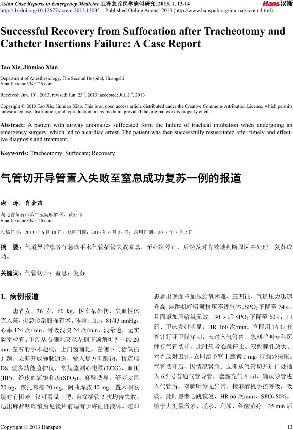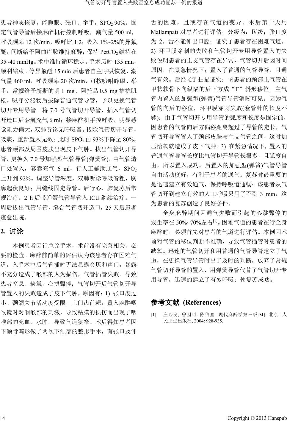 ![]() Asian Case Reports in Emergency Medicine亚洲急诊医学病例研究, 2013, 1, 13-14 http://dx.doi.org/10.12677/acrem.2013.13005 Published Online August 2013 (http://www.hanspub.org/journal/acrem.html) Successful Recovery from Suffocation after Tracheotomy and Catheter Insertions Failure: A Case Report Tao Xie, Ji nmiao Xiao Department of Anesthesiology, The Second Hospital, Huangshi Email: xietao33@126.com Received: Jun. 10th, 2013; revised: Jun. 23rd, 2013; accepted: Jul. 2nd, 2013 Copyright © 2013 Tao Xie, Jinmiao Xiao. This is an open access article distributed under the Creative Commons Attribution License, which permits unrestricted use, distribution, and reproduction in any medium, provided the original work is properly cited. Abstract: A patient with airway anomalies suffocated form the failure of tracheal intubation when undergoing an emergency surgery, which led to a cardiac arrest. The patient was then successfully resuscitated after timely and effect- ive diagnosis and treatment. Keywords: Tracheotomy; Suffocate; Recovery 气管切开导管置入失败至窒息成功复苏一例的报道 谢 涛,肖金苗 湖北省黄石市第二医院麻醉科,黄石市 Email: xietao33@126.com 收稿日期:2013 年6月10 日;修回日期:2013年6月23日;录用日期:2013 年7月2日 摘 要:气道异常患者行急诊手术气管插管失败窒息,至心跳停止,后经及时有效地判断原因并处理。复苏成 功。 关键词:气管切开;窒息;复苏 1. 病例报道 患者女,36 岁,60 kg。因车祸外伤、失血性休 克入院,拟急诊剖腹探查术。体检:血压 81/43 nmHg、 心率 124 次/min,呼吸浅快 24次/min、浅晕迷,无实 验室检查。下颌从右侧乳突至左侧下颌角可见一约20 mm 左右的手术疤痕,上门齿前耙,左侧下门齿缺损 3颗。立即开放静脉通道,输入复方乳酸钠,接迈瑞 D8 型多功能监护仪,常规监测心电图(ECG)、血压 (BP)、经皮血氧饱和度(SPO2)。麻醉诱导:舒芬太尼 20 ug,依托咪酯 20 mg,阿曲库胺40 mg。置入咽喉 镜时有困难,仅可看见上腭,盲探插管 2次均告失败。 退出麻醉咽喉镜后见镜片前端有少许血性液体。随即 患者出现面罩加压给氧困难、三凹征、气道压力迅速 升高,麻醉机呼吸囊挤压不进气体。SPO2下降至 74%, 且面罩加压给氧无效。30 s后SPO2下降至 60%;口 唇、甲床发绀明显,HR 160次/min。立即用 16 G套 管针行环甲膜穿刺,未进入气管内。急刻呼叫专科医 师行气管切开,此时患者心跳停止、双侧瞳孔放大、 对光反射迟钝,立即给予肾上腺索 1 mg,行胸外按压。 气管切开后,因情况紧急;立即从气管切开造口处插 入6.5 号普通气管导管,套囊充气 6 rnl,确认导管进 入气管后,双肺听诊无异常。接麻醉机手控呼吸,吸 痰,此时患者心跳恢复,HR 66 次/min,SPO2 80%, 给予大剂量激素、脱水、利尿、纠酸治疗。35 min 后 Copyright © 2013 Hanspub 13 ![]() 气管切开导管置入失败至窒息成功复苏一例的报道 患者神志恢复,能睁眼、张口、举手,SPO2 90%。固 定气管导管后接麻醉机行控制呼吸,潮气量500 ml, 呼吸频率12 次/min,吸 呼 比1:2;吸 入1%~2%的异氟 醚,间断给予阿曲库胺维持麻醉;保持PetCO2维持在 35~40 mmHg。术中维持循环稳定。手术历时 135 min, 顺利结束。停异氟醚 15 min 后患者自主呼吸恢复,潮 气量 460 ml,呼吸频率20 次/min,可按吩咐睁眼、举 手,常规给予新斯的明1 mg、阿托品 0.5 mg拮抗肌 松。吸净分泌物后拔除普通气管导管,予以更换气管 切开专用导管。将 7.0 号气管切开导管,插入气管切 开造口后套囊充气 6 rnl;接麻醉机手控呼吸,明显感 觉阻力偏大,双肺听诊无呼吸音。拔除气管切开导管, 吸痰,重新置入无效;此时 SPO2由93%下降至 80 %, 患者颈部及周围皮肤出现皮下气肿。拔出气管切开导 管,更换为 7.0 号加强型气管导管(弹簧管),由气管造 口处置入,套囊充气6 ml,行人工辅助通气,SPO2 上升到 92%。调整导管深度,双肺听诊呼吸音粗,胸 廓起伏良好;用缝线固定导管。后行心、肺复苏后常 规治疗。2 h后带弹簧气管导管入 ICU继续治疗。一 周后拔出气管导管,缝合气管切开造口,25天后患者 痊愈出院。 2. 讨论 本例患者因行急诊手术,术前没有完善相关、必 要的检查。麻醉前简单的评估认为该患者存在困难气 道,入手术室后气管插时无法显露会厌和声门,暴露 不充分造成了喉部的人为损伤,气管插管失败。导致 患者窒息、缺氧,心搏骤停;气管切开后气管切开导 管置入的失败造成了皮下气肿,原因有:1) 张口度过 小、颞颌关节活动度受限,上门齿前耙,置入麻醉咽 喉镜时对咽喉部的刺激,导致粘膜的损伤而出现了咽 喉部的充血、水肿,导致气道狭窄。术后得知患者因 下颌骨畸形做了两次下颌部的整形手术,有张口及伸 舌的因难,且或存在气道的变异。术后第十天用 Mallampati 对患者进行评估,分级为:Ⅳ级;张口度 为2。舌不能伸出口腔;证实了患者存在困难气道。 2) 环甲膜穿刺的失败和气 管切开专用导管置入的 失 败说明患者的主支气管存在异常,气管切开后因时间 原因,在紧急情况下;置入了普通的气管导管,且通 气有效。后经 CT扫描证实:该患者的颈部主气管在 甲状软骨下向纵隔的后下方成 “Г”斜形移位。主 气 管内置入的加强型(弹簧)气管导管消晰可见。因为气 管的向后的移位,环甲膜穿刺失败(套管针的长度不 够):由于气管切开专用导管的弧度和长度是固定的, 因患者的气管向后方偏移距离超过了导管的定长,气 管切开导管置人了颈部皮肤与主支气管之间,这时加 压给氧就造成了皮下气肿。3) 在紧急情况下,置入的 普通气