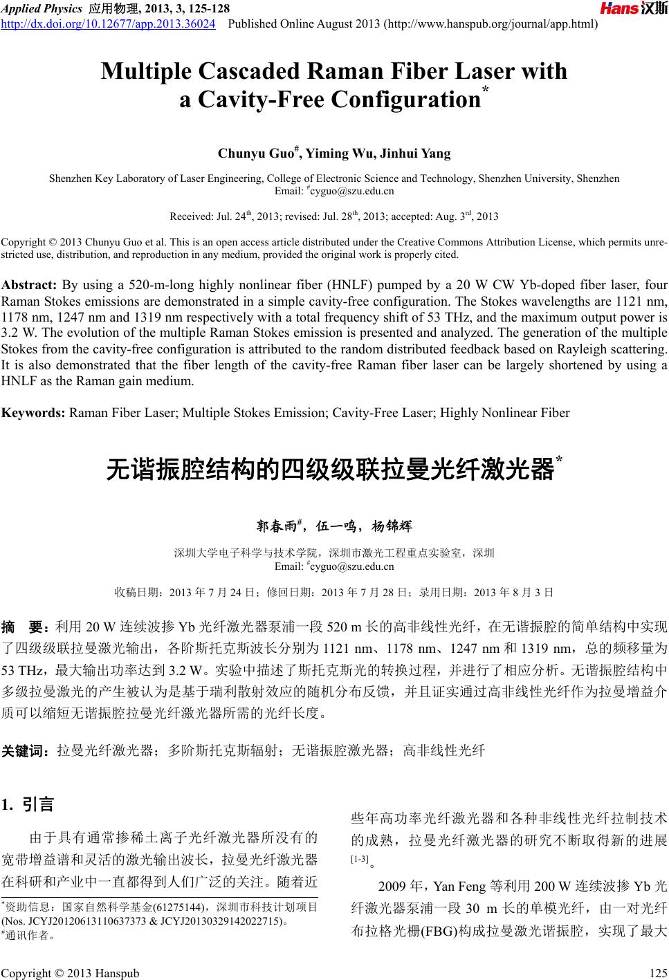 ![]() Applied Physics 应用物理, 2013, 3, 125-128 http://dx.doi.org/10.12677/app.2013.36024 Published Online August 2013 (http://www.hanspub.org/journal/app.html) Multiple Cascaded Raman Fiber Laser with a Cavity-Free Configuration* Chunyu Guo#, Y iming Wu, Jinhui Ya ng Shenzhen Key Laboratory of Laser Engineering, College of Electronic Science and Technology, Shenzhen University, Shenzhen Email: #cyguo@szu.edu.cn Received: Jul. 24th, 2013; revised: Jul. 28th, 2013; accepted: Aug. 3rd, 2013 Copyright © 2013 Chunyu Guo et al. This is an open access article distributed under the Creative Commons Attribution License, which permits unre- stricted use, distribution, and reproduction in any medium, provided the original work is properly cited. Abstract: By using a 520-m-long highly nonlinear fiber (HNLF) pumped by a 20 W CW Yb-doped fiber laser, four Raman Stokes emissions are demonstrated in a simple cavity-free configuration. The Stokes wavelengths are 1121 nm, 1178 nm, 1247 nm and 1319 nm respectively with a total frequency shift of 53 THz, and the maximum output power is 3.2 W. The evolution of the multiple Raman Stokes emission is presented and analyzed. The generation of the multiple Stokes from the cavity-free configuration is attributed to the random distributed feedback based on Rayleigh scattering. It is also demonstrated that the fiber length of the cavity-free Raman fiber laser can be largely shortened by using a HNLF as the Raman gain medium. Keywords: Raman Fiber Laser; Multiple Stokes Emission; Cavity-Free Laser; Highly Nonlinear Fiber 无谐振腔结构的四级级联拉曼光纤激光器* 郭春雨#,伍一鸣,杨锦辉 深圳大学电子科学与技术学院,深圳市激光工程重点实验室,深圳 Email: #cyguo@szu.edu.cn 收稿日期:2013 年7月24 日;修回日期:2013年7月28日;录用日期:2013年8月3日 摘 要:利用20 W连续波掺 Yb 光纤激光器泵浦一段520 m长的高非线性光纤,在无谐振腔的简单结构中实现 了四级级联拉曼激光输出,各阶斯托克斯波长分别为 1121 nm、1178 nm、1247 nm和1319 nm,总的频移量为 53 THz,最大输出功率达到 3.2 W。实验中描述了斯托克斯光的转换过程,并进行了相应分析。无谐振腔结构中 多级拉曼激光的产生被认为是基于瑞利散射效应的随机分布反馈,并且证实通过高非线性光纤作为拉曼增益介 质可以缩短无谐振腔拉曼光纤激光器所需的光纤长度。 关键词:拉曼光纤激光器;多阶斯托克斯辐射;无谐振腔激光器;高非线性光纤 1. 引言 由于具有通常掺稀土离子光纤激光器所没有的 宽带增益谱和灵活的激光输出波长,拉曼光纤激光器 在科研和产业中一直都得到人们广泛的关注。随着近 些年高功率光纤激光器和各种非线性光纤拉制技术 的成熟,拉曼光纤激光器的研究不断取得新的进展 [1-3]。 2009 年,Yan Feng等利用 200 W 连续波掺Yb光 纤激光器泵浦一段 30 m长的单模光纤,由一对光纤 布拉格光栅(FBG)构成拉曼激光谐振腔,实现了最大 *资助信息:国家自然科学基金(61275144),深圳市科技计划项目 (Nos. JCYJ20120613110637373 & JCYJ20130329142022715)。 #通讯作者。 Copyright © 2013 Hanspub 125 ![]() 无谐振腔结构的四级级联拉曼光纤激光器 功率为 150 W的1120 nm 一阶拉曼激光输出,这是目 前所报导的最高输出功率的拉曼光纤激光器[3]。此外, 为了拓展拉曼激光输出波长,级联拉曼光纤激光器的 研究也不断深入[4,5]。2010 年,OFS 实验室的 J. W. Nicholson 等利用中心波长为 1117 nm,输出功率达到 162 W的MOPA 结构掺 Yb 光纤激光器泵浦一段120 m的长波截止拉曼滤波光纤(RFF),通过五对FBG组 成的级联拉曼谐振腔将泵浦波长拉曼频移到了 1480 nm,采用损耗峰位于 1175 nm一阶斯托克斯波长处的 长周期光纤光栅(LPG)来避免一阶拉曼反馈光对掺 Yb 放大系统的影响,从而保证掺Yb泵浦源的高功率稳 定运行,最终实现了输出功率为 81 W的1480 nm级 联拉曼激光输出[6]。2012 年,他们将之前的窄带长周 期光纤光栅替换为 1117/1175 nm 宽带波分复用器 (WDM),进一步降低一阶斯托克斯反射光对泵浦源的 影响,从而将 1480 nm 的级联拉曼激光输出功率提高 到了 104 W[7]。 尽管拉曼光纤激光器的输出功率不断得到提高, 激光波长不断得到拓展,但是通常拉曼光纤激光器的 实现要求高质量的FBG、WDM 或LPG 等器件,这增 加了整个系统的复杂性及其成本。那么一个非常值得 关注的问题就是是否可以通过一种简单的结构和较 低的成本实现级联拉曼激光输出。 本文首次利用百米级高非线性光纤实现了无谐 振腔结构的瓦级高功率四级级联拉曼激光输出,提供 了一种实现简单的无谐振腔结构的多级拉曼光纤激 光器的方案。 2. 实验装置 实验装置如图 1所示,利用最大输出功率为 20 W 的连续波掺 Yb 光纤激光器(YFL)直接泵浦一段长度 为520 m 的高非线性光纤(HNLF)。掺 Yb 光纤激光器 输出中心波长为1070 nm,谱宽(FWHM)为0.5 nm。 高非线性光纤的非线性系数和拉曼增益系数分别为 10 (W·km)−1和4.8 (W·km)−1,模场直径和数值孔径分 别为 3.6 μm和0.35。高非线性光纤的零色散波长为 1840 nm,位于 1070 nm泵浦激光前几级级联斯托克 斯线的长波方向,有利于位于光纤正常色散区的拉曼 斯托克斯光的产生。掺Yb 光纤激光器尾纤(H I1060) 和高非线性光纤之间存在着比较大的模场失配,如果 Figure 1. The experimental setup of the multiple Stokes generation 图1. 多阶拉曼斯托克斯光产生的实验装置图 直接熔接将引入较大的熔接损耗,因此首先对高非线 性光纤进行纤芯热扩散,然后再与激光器的HI1060 尾纤进行模场匹配熔接,最终得到了 0.2 dB 的熔接损 耗。为