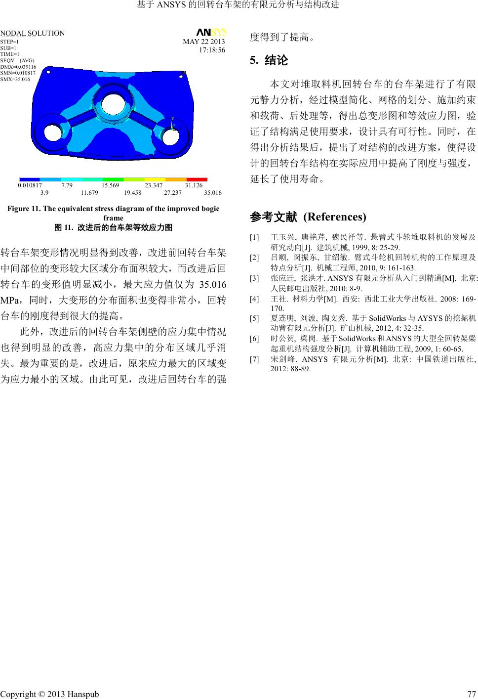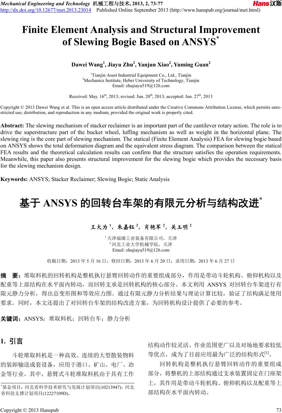 ![]() Mechanical Engineering and Technology 机械工程与技术, 2013, 2, 73-77 http://dx.doi.org/10.12677/met.2013.23014 Published Online September 2013 (http://www.hanspub.org/journal/met.html) Finite Element Analysis and Structural Improvement of Slewing Bogie Based on ANSYS* Dawei Wa ng1, Jiayu Zhu2, Ya njun Xiao2, Yuming Guan2 1Tianjin Asset Industrial Equipment Co., Ltd., Tianjin 2Mechanics Institute, Hebei University of Technology, Tianjin Email: zhujiayu519@126.com Received: May. 16th, 2013; revised: Jun. 20th, 2013; accepted: Jun. 27th, 2013 Copyright © 2013 Dawei Wang et al. This is an open access article distributed under the Creative Commons Attribution License, which permits unre- stricted use, distribution, and reproduction in any medium, provided the original work is properly cited. Abstract: The slewing mechanism of stacker reclaimer is an important part of the cantilever rotary action. The role is to drive the superstructure part of the bucket wheel, luffing mechanism as well as weight in the horizontal plane. The slewing ring is the core part of slewing mechanism. The statical (Finite Element Analysis) FEA for slewing bogie based on ANSYS shows the total deformation diagram and the equivalent stress diagram. The comparison between the statical FEA results and the theoretical calculation results can confirm that the structure satisfies the operation requirements. Meanwhile, this paper also presents structural improvement for the slewing bogie which provides the necessary basis for the slewing mechanism design. Keywords: ANSYS; Stacker Reclaimer; Slewing Bogie; Static Analysis 基于 ANSYS 的回转台车架的有限元分析与结构改进* 王大为 1,朱嘉钰 2,肖艳军 2,关玉明 2 1天津福臻工业装备有限公司,天津 2河北工业大学机械学院,天津 Email: zhujiayu519@126.com 收稿日期:2013 年5月16 日;修回日期:2013 年6月20 日;录用日期:2013 年6月27 日 摘 要:堆取料机的回转机构是整机执行悬臂回转动作的重要组成部分,作用是带动斗轮机构、俯仰机构以及 配重等上部结构在水平面内转动,而回转支承是回转机构的核心部分。本文利用 ANSYS 对回转台车架进行有 限元静力分析,得出总变形图和等效应力图。通过有限元静力分析结果与理论计算比较,验证了结构满足使用 要求。同时,本文还提出了对回转台车架的结构改进方案,为回转机构设计提供了必要的参考。 关键词:ANSY S;堆取料机;回转台车;静力分析 1. 引言 斗轮堆取料机是一种高效、连续的大型散装物料 的装卸输送成套设备,应用于港口、矿山、电厂、冶 金等行业。其中,悬臂式斗轮堆取料机由于具有工作 结构动作较灵活、作业范围更广以及对场地要求较低 等优点,成为了目前应用最为广泛的结构形式[1]。 回转机构是整机执行悬臂回转动作的重要组成 部分,将整机的上部结构通过支承装置固定在门座架 上,其作用是带动斗轮机构、俯仰机构以及配重等上 部结构在水平面内转动。 *基金项目:河北省科学技术研究与发展计划项目(10213947),河 北 省科技支撑计划项目(12227109D)。 Copyright © 2013 Hanspub 73 ![]() 基于 ANSYS 的回转台车架的有限元分析与结构改进 回转台车的设计是依靠传统的经验,为了保证安 全性,会造成尺寸偏大,重量增加。本文以SolidWorks 为平台,建立回转台车的三维实体模型,并用ANSYS 对回转台车架进行有限元分析,修复生产前的问题, 以提高生产成本。同时,本文还根据回转台车架的受 力及变形规律,提出了结构改进方案,为以后的研究 打下了基础。 2. 回转台车结构 回转台车类似于行走台车,不同的是,台车结构 中每对车轮的二只车轮轴线形成一个夹角而不是相 互平行,并且通过圆形轨道的中心[2],且台车车轮无 轮缘,车轮的踏面比圆形轨道的踏面要略宽一些,如 图1所示。 回转台车安装于堆取料机回转机构的下部,主要 由铰座、台车架、走轮等部分组成,如图2所示。台 车架是由两侧腹板、上部连接板及筋板等通过焊接而 成的箱型结构,它的强度和刚度直接影响了回转台车 机构的安全,在堆取料机作业的过程中,主要承受其 以上部件的重力。 Copyright © 2013 Hanspub 74 Figure 1. The slewing bogie 图1. 回转台车 台车架 铰座 走轮 Figure 2. The model diagram of slewing bogie 图2. 回转台车模型图 3. 回转台车架的有限元静力分析 静力学分析是有限元分析的基础,是用来求解在 固定不变的外载荷作用下位移、应力等的变化,适用 于求解惯性和阻尼影响不显著的结构的问题[3]。通过 静力分析可以校核结构的刚度和强度是否满足设计 的要求,对结构设计有着十分重要的意义。 本节主要对 4500/7000 t/h型堆取料机的回转台车 架进行分析。 3.1. 台车架有限元模型假设与简化 模型合理的假设与简化可提高建模速度,降低解 题难度,因此对台车架做如下假设与简化:假定材料 均匀分布,台车架的各个板块为实体单元,忽略焊接 应力以及螺栓对台车架的影响。 3.2. 基本失效理论及强度评价标准 该结构采用了合金钢Q345,主要失效形式为材 料屈服破坏,采用第四强度理论进行评价。第四强度 理论的意义在任何给定应力下材料不发生材料屈服 破坏的条件为[4]: 22 2 12 23 31 1 2 式中, 1 ,2 ,3 ——主力方向上的应力; — —许用应力。 但计算式有个安全系数n,即有公式: n s 斗轮堆取料机的回转机构在轨道上运动,但运行 速度缓慢且匀速,所以说台车架的强度计算主要是对 其进行静强度计算,根据机械标准JB/T8849-2005 规 范,对于台车架的静力学分析采用的许用应力按Ⅰ类 载荷进行计算,Q345 材料许用应力