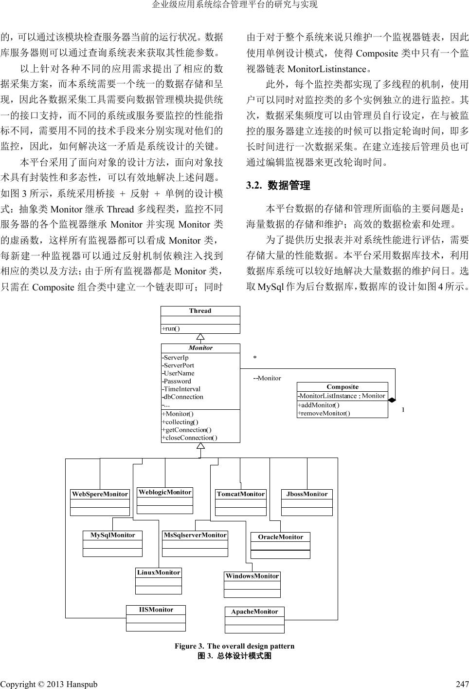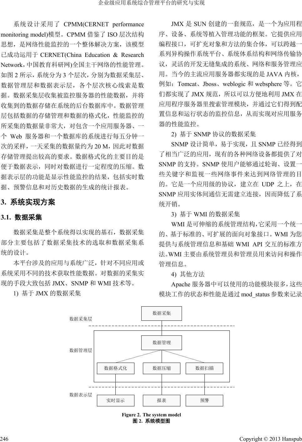 ![]() Computer Science and Application 计算机科学与应用, 2013, 3, 244-250 http://dx.doi.org/10.12677/csa.2013.35042 Published Online August 2013 (http://www.hanspub.org/journal/csa.html) Integrated Management Platform for Enterprise Application System: Design and Implementation* Yu Sheng1, Zhongxin Jiang2, Pingping Dong1, Jia Yuan1 1School of Information Science and Engineering, Central South University, Changsha 2Hunan Police Academy, Changsha Email: vlab@163.com Received: May 2nd, 2013; revised: May 16th, 2013; accepted: May 28th, 2013 Copyright © 2013 Yu Sheng et al. This is an open access article distributed under the Creative Commons Attribution License, which permits unre- stricted use, distribution, and reproduction in any medium, provided the original work is properly cited. Abstract: With the expansion of domestic enterprise network, more and more enterprises realize that, in additio n to rely on the device itself and the reliability of the network architecture, to ensure the whole system run efficiently and reliably through monitoring the performance of network servers is important equally. In this paper, an enterprise-level applica- tion management platform based on the CPMM model was proposed. This platform integrates JMX (Java Management Extensions), SNMP (Simple Network Management Protocol) and WMI (Windows Management Instrumentation) to monitor the running state of all the servers in monitoring range, and judges whether the system has a poor performance or other problems according to the monitoring information and informs the fault to user. The platform provides a com- prehensive solution for enterprise to ensure the whole system run efficiently and reliably, which makes administrators not need to prepare different monitoring tools for different IT resources. Keywords: Performance Monitor; Server; Real-Time; Enterprise Application System 企业级应用系统综合管理平台的研究与实现* 盛 羽1,蒋忠新 2,董苹苹 1,袁 佳1 1中南大学信息科学与工程学院,长沙 2湖南警察学院,长沙 Email: vlab@163.com 收稿日期:2013 年5月2日;修回日期:2013 年5月16 日;录用日期:2013 年5月28 日 摘 要:随着国内企业网络规模的扩大,越来越多的企业认识到,除了要依靠设备本身和网络架构的可靠性之 外,通过对网络中服务器的性能监控来保证整个系统高效、可靠地运行一样重要。本文设计并实现了一种基于 CPMM 模型的企业级应用系统综合管理平台,平台通过 JMX(Java Management Extensions, Java扩展管理)、 SNMP(Simple Network Management Protocol,简单网络管理协议)和WMI(Windows Management Instrumentation, Windows 管理规范)等技术对监控范围内所有服务器的详细运行情况进行监控,并根据监控信息进行判断,当性 能变差或存在其他问题时及时预警,告知可能会发生的故障。它为企业提供了一个综合的解决方案,使管理员 不必再为每个 IT 资源准备不同的监控工具来保证整个系统高效、可靠地运行。 关键词:性能监控;服务器;实时;企业应用系统 *基金项目:湖南省科技计划重点项目“网络运行安全监控技术研究”(2011GK2008);国家自然科学基金面上项目“难解问题的核心化技术 及其应用研究”(61073036)。 Copyright © 2013 Hanspub 244 ![]() 企业级应用系统综合管理平台的研究与实现 Copyright © 2013 Hanspub 245 1. 引言 护过程比较复杂;3) 监控数据呈现单一,缺少异常情 况的全方位报警机制。 随着企业应用需求复杂性的增加,企业网络规模 的不断扩大,这导致网络故障率提高、可管理性下降。 在中等规模以上的企业网络中,仅仅靠人工利用传统 方式来管理网络是不切实际的[1]。企业级应用系统综 合管理平台为企业提供了一个综合的解决方案,实现 包括实时查看整个系统的状态、检测系统可能出现的 瓶颈、并通过邮件等方式向管理员发出告警等功能, 以保证整个系统高效、可靠地运行。 针对以上问题,本文设计并实现了一个企业级应 用系统综合管理平台,包含对操作系统、数据库、应 用服务器和 Web 服务器的全方位监控。该平台能自动 的实现监控功能,并从监控范围内采集所需要的数 据,这些数据通过网络集中到后台数据库中后再进行 一系列的后续处理工作。对数据的采集实现的手段大 致包括 JMX、SNMP 和WMI 技术等。为企业提供了 一个综合的解决方案,使管理员不必再为每个 IT资 源准备不同的监控工具。 在传统方式中,可以通过查看每个服务器的日志 信息或运行相应的命令来获取服务器自身的一些参 数,从而判断服务器的运行状况,这种方式是完全被 动的依靠管理员人工操作来得到零散的数据,需要大 量的人工操作。目前,一些网络管理方案,如惠普公 司的 HP Open View、QUANTA 公司的 ESM[2]、加州 理工学院的 MonALISA[3],IBM 公司的 Tivoli[4],采 用了代理的监控方式,即在被监控端安装代理,并由 代理执行监测任务[5]。这些监控方式往往存在一下问 题:1) 这些监控系统一般是针对某一个层次的软件系 统的运行状态进行监控,无法实现对整个应用系统从 操作系统到服务器的全方位监控;2) 这些监控系统往 往需要安装代理到每个被监控的服务器上,安装和维 2. 系统架构设计 企业级应用系统综合管理平台实现了对操作系 统,应用服务器,Web服务器和数据库的监控。提供 对这几种系统及应用的性能数据的获取,例如,在应 用服务器方面,可以获取其堆栈使用信息,线程池信 息,JDBC 连接池信息等。支持对性能数据的存取, 然后通过图表的形式表现出来,为管理员提供对所监 控内容简单直观的理解。并且期望通过对历史数据的 分析实现对