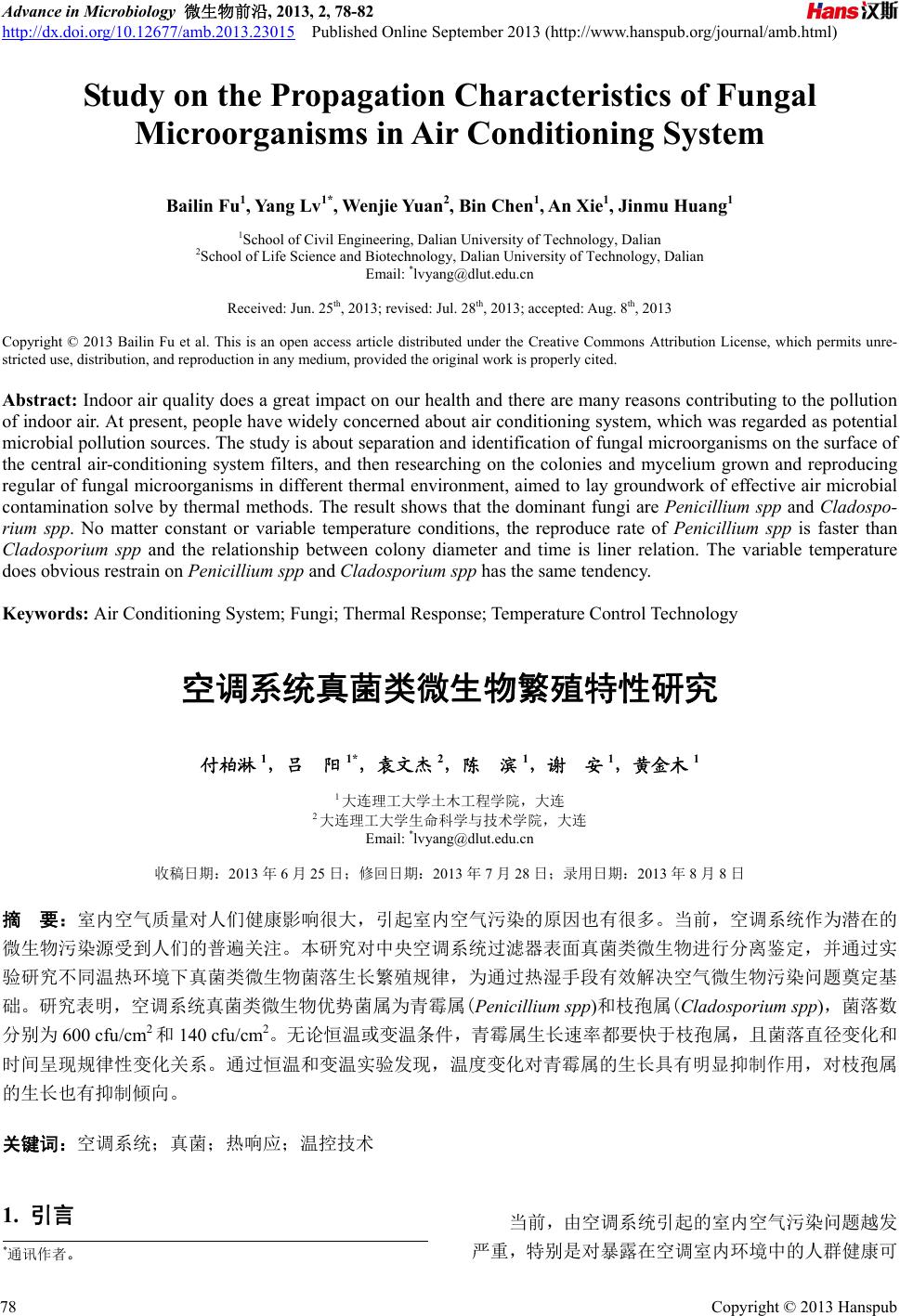 ![]() Advance in Microbiology 微生物前沿, 2013, 2, 78-82 http://dx.doi.org/10.12677/amb.2013.23015 Published Online September 2013 (http://www.hanspub.org/journal/amb.html) Study on the Propagation Characteristics of Fungal Microorganisms in Air Conditioning System Bailin Fu1, Ya ng Lv1*, Wenjie Yuan2, Bin Chen1, An Xie1, Jinmu Huang1 1School of Civil Engineering, Dalian University of Technology, Dalian 2School of Life Science and Biotechnology, Dalian University of Technology, Dalian Email: *lvyang@dlut.edu.cn Received: Jun. 25th, 2013; revised: Jul. 28th, 2013; accepted: Aug. 8th, 2013 Copyright © 2013 Bailin Fu et al. This is an open access article distributed under the Creative Commons Attribution License, which permits unre- stricted use, distribution, and reproduction in any medium, provided the original work is properly cited. Abstract: Indo or air quality does a great impact on our health and there are many reasons contributing to the pollution of indoor air. At present, people have widely concerned about air conditioning system, which was regarded as potential microbial pollution sources. The study is about separation and identification of fungal microorganisms on the surface of the central air-conditioning system filters, and then researching on the colonies and mycelium grown and reproducing regular of fungal micro organisms in different thermal environment, aimed to lay groundw ork of effective air microbial contamination solve by thermal methods. The result shows that the dominant fungi are Penicillium spp and Cladospo- rium spp. No matter constant or variable temperature conditions, the reproduce rate of Penicillium spp is faster than Cladosporium spp and the relationship between colony diameter and time is liner relation. The variable temperature does obvious restrain on Penicillium spp and Cladosporium spp has the same tendency. Keywords: Air Conditioning System; Fungi; Thermal Response; Temperature Control Technology 空调系统真菌类微生物繁殖特性研究 付柏淋 1,吕 阳1*,袁文杰 2,陈 滨1,谢 安1,黄金木 1 1大连理工大学土木工程学院,大连 2大连理工大学生命科学与技术学院,大连 Email: *lvyang@dlut.edu.cn 收稿日期:2013 年6月25 日;修回日期:2013 年7月28 日;录用日期:2013 年8月8日 摘 要:室内空气质量对人们健康影响很大,引起室内空气污染的原因也有很多。当前,空调系统作为潜在的 微生物污染源受到人们的普遍关注。本研究对中央空调系统过滤器表面真菌类微生物进行分离鉴定,并通过实 验研究不同温热环境下真菌类微生物菌落生长繁殖规律,为通过热湿手段有效解决空气微生物污染问题奠定基 础。研究表明,空调系统真菌类微生物优势菌属为青霉属(Penicillium spp)和枝孢属(Cladosporium spp),菌落数 分别为 600 cfu/cm2和140 cfu/cm2。无论恒温或变温条件,青霉属生长速率都要快于枝孢属,且菌落直径变化和 时间呈现规律性变化关系。通过恒温和变温实验发现,温度变化对青霉属的生长具有明显抑制作用,对枝孢属 的生长也有抑制倾向。 关键词:空调系统;真菌;热响应;温控技术 1. 引言 当前,由空调系统引起的室内空气污染问题越发 严重,特别是对暴露在空调室内环境中的人群健康可 *通讯作者。 Copyright © 2013 Hanspub 78 ![]() 空调系统真菌类微生物繁殖特性研究 造成危害,因此空调系统的卫生状况受到人们的普遍 关注。空调系统作为主要污染源,其系统内部很多地 方容易滋生微生物。研究表明,空调过滤器积存了大 量灰尘,以及设备中易吸水的材料,加湿器、冷却盘 管、冷凝水积水盘都提供了高湿甚至积水的环境,而 这些环境往往是细菌、真菌等微生物的滋生地[1-3]。另 外,在滋生的微生物中,真菌在空调系统中的存在比 例比较高。哈尔滨工业大学卢振等人对我国北方城市 哈尔滨两栋建筑的中央空调系统进行测试表明,空调 系统内真菌总数是细菌的 4.7 倍[4]。西安建筑科技大 学李安桂等人对陕西历史博物馆空调系统实测研究 表明,空调系统送风段各工作段中真菌浓度是细菌浓 度的 1.6~128 倍[5]。 在人体健康危害性方面,真菌微生物的影响也尤 为严重。法国国家卫生与医学研究所研究表明,室内 真菌对严重哮喘患者的危害相对于其它过敏物质的 2 倍[6]。人们受真菌的感染易患脚气、皮炎、皮癣、湿疹 等疾病[7]。Somers 等人观测到吸入污染真菌颗粒的小 鼠发生基因突变,为真菌导致癌变提供了间接证明[8]。 基于以上原因,对空调系统真菌类微生物进行生 长特性研究,并找到适宜的控制方法极其重要。本研 究通过对实际建筑空调系统中真菌微生物进行实测 研究,掌握中央空调系统过滤器表面真菌类微生物优 势菌属,并通过热响应实验研究,对不同温热环境下 真菌微生物菌落生长繁殖规律进行分析。 2. 实测研究 2.1. 实测仪器与材料 灭菌无纺布,蒸馏水,察氏培养基,高压灭菌锅, 恒温培养箱,具有双向调节温度的培养摇床,显微镜, TR-72i 温湿度自记仪等。 2.2. 真菌的采样与计数 实测对象为某体育馆内中央空调系统,从空调系 统过滤网上选取 5 cm × 5 cm的区域用灭菌无纺布轻 拭,采集区域内全部积尘。将擦拭物无菌操作加入到 无菌水中,充分清洗,使擦拭物上物质完全溶于无菌 水,制成菌原液。分别再制备原液浓度、10倍梯级稀 释浓度、100 倍梯级稀释浓度。分别取三种不同浓度 的溶液 1 ml在培养基上培养,观察菌落数,平行样菌 落数取平均值。 2.3. 优势菌属的分离鉴定 根据菌落的形态、颜色等生理生化特征,并在 40 倍显微镜下观察菌丝及孢子结构,可见菌属 1(图1所 示)特征为有隔膜