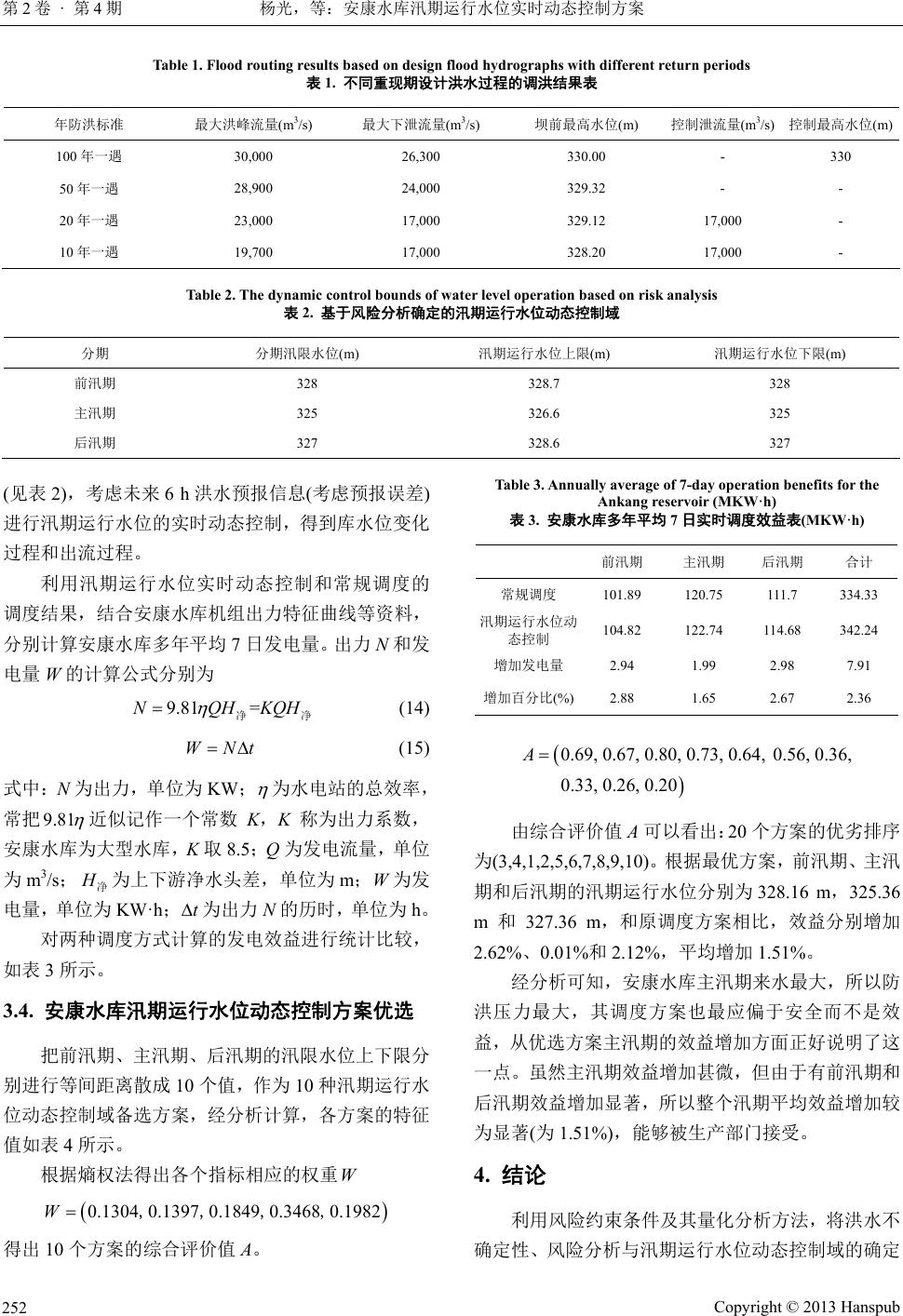 ![]() Journal of Water Resources Research 水资源研究, 2013, 2, 248-254 http://dx.doi.org/10.12677/jwrr.2013.24035 Published Online August 2013 (http://www.hanspub.org/journal/jwrr.html) Real-Time and Dynamic Control of Water Level Operating Scheme during Flood Season for the Ankang Reservoir* Guang Yang, Shen glian Gu o, Yanlai Zhou State Key Laboratory of Water Resources and Hydropower Engineering Science, Wuhan University, Wuhan Email: 1148777255@qq.com Received: Jun. 15th, 2013; revised: Jul. 4th, 2013; accepted: Jul. 13th, 2013 Abstract: Dynamic control of reservoir water level during flood season is one of the effective measures to solve the conflict between flood control and power generation. The dynamic control bound of water level for the Ankang reservoir is derived by risk-analysis based method, and dynamic control of water level operating scheme by considering flood forecasting information is established in this paper. By using multi-objective evaluation system which considers flood risk and power generation benefit, the dynamic control of water level operating schemes is proposed for the Ankang reservoir. Compared with the designed operation scheme, it is shown that the proposed scheme can increase hydropower generation by 2.94 MKW·h (2.88%), 1.99 MKW·h (1.65%) and 2.98 MKW·h (2.67%) in the pre-flood season, main flood season and post-flood season (7 days) without reducing flood control standards, respectively. Keywords: Operating Water Level; Real-Time and Dynamic Control; Multi-Objective Decision; Ankang Reservoir 安康水库汛期运行水位实时动态控制方案* 杨 光,郭生练,周研来 武汉大学水资源与水电工程科学国家重点实验室,武汉 Email: 1148777255@qq.com 收稿日期:2013 年6月15 日;修回日期:2013 年7月4日;录用日期:2013 年7月13 日 摘 要:汛期运行水位实时动态控制是协调水库防洪与兴利矛盾的一条有效措施。本文采用风险分析 法推求了安康水库汛期运行水位动态控制域,建立了考虑洪水预报信息的汛期运行水位实时动态控制 模型,并采用防洪风险和兴利效益相结合的多目标综合评价指标体系,优选出了安康水库汛期运行水 位动态控制方案。结果表明:实时动态控制方案在不降低原防洪标准的前提下与常规调度相比,在前 汛期、主汛期和后汛期 7日增加的发电量分别为 2.94 MKW·h (2.88%)、1.99 MKW·h (1.65%)和2.98 MKW·h (2.67%),效益增加较为显著。 关键词:汛期运行水位;实时动态控制;多目标决策;安康水库 1. 引言 传统的水库调度方法按规划设计的调度图运行, 没有考虑气象水文预报信息,直接由入库流量和防洪 库容确定下泄流量以控制水库水位不超过汛限水位, 时刻防御可能发生的洪水,经常导致洪水过程中受汛 限水位约束而发生弃水,洪水过后又无水可蓄的局 *基金项目:水利部公益性行业科研专项(201001002)资助。 作者简介:杨光(1991-),男,湖北荆州人,硕士研究生。 Copyright © 2013 Hanspub 248 ![]() 杨光,等:安康水库汛期运行水位实时动态控制方案 第2卷 · 第4期 面,造成洪水资源的巨大浪费[1]。在确保水库防洪安 全的前提下,科学地设计与运用汛限水位,合理地利 用水库防洪与兴利重叠库容,是发挥水库综合利用效 益,缓解我国水资源紧缺与防洪减灾矛盾的有效手段 之一[2]。经多年的研究和实践,水库汛限水位控制理 论有了很大的发展[3],已由单一固定水位控制及分期 固定水位控制发展到汛限水位动态控制阶段[4,5]。 Murota 等[6]综合分析了影响水库汛期蓄水和弃水 的主要因素,在水库汛限水位设计中引入了风险理 论。周惠成等[7]在分析防洪预报调度方式运行机理及 其对水库调度影响的基础上,采用防洪风险和蓄水效 益综合评价体系,确定出相对合理的汛限水位控制 值。刘攀等[8]在三峡水库运行初期,提出了防洪、发 电和航运等指标体系,建立了动态汛限水位和蓄水时 机优化的混合规划数学模型,运用遗传算法对该模型 进行优化求解,得到了相对合理的动态汛限水位与蓄 水时机方案,充分挖掘前汛期与后汛期的潜力,提高 了三峡水库运行的综合效益。陈炯宏等[9]结合洪水预 报及梯级水库防洪调度信息,建立了梯级水库汛限水 位的联合运用模型,寻求了综合利用效益最大的梯级 水库汛限水位的联合动态控制方案,清江梯级水库应 用结果表明,在不增加防洪风险的前提下可显著地提 高综合利用效益。 目前水库汛期运行水位动态控制理论与方法已 经逐步完善和成熟,并取得了一定的应用研究成果 [10,11]。国外虽然没有专门研究水库汛期运行水位动态 控制方法,但在其相关领域研究的较早、成果较多。 与国内相比,发达国家由于在气象水文特性、人口密 度及分布、水资源供需矛盾、社会保险机制及政府管 理办法等方面与我国存在很大的差异,其防洪研究重 心以考虑防洪效益及生态环境效益为主[12]。 本文研究安康水库汛期运行水位实时动态控制 方案,建立方案优选评价指标体系,结合水库防洪风 险率、防洪易损性、防洪可恢复性和水库发电量四项 指标,优选相对合理的安康水库汛期运行水位实时动 态控制方案。 2. 汛期运行水位实时动态控制模型 2.1. 风险分析模型 以年防洪标准特征值(坝前最高水位和最大下泄 流量)为基础对防洪调度过程进行风险分析,推求不同 分期的汛期运行水位与防洪风险率之间的关系是确 定汛期运行水位动态控制域的依据。按照原有的汛期 运行水位控制方案对不同频率的年设计洪水进行调 洪演算,得出对应的坝前最高水位和水库最大下泄流 量作为风险指标