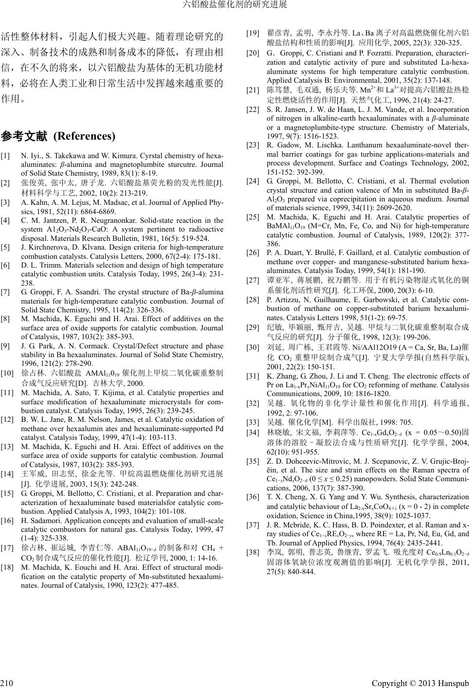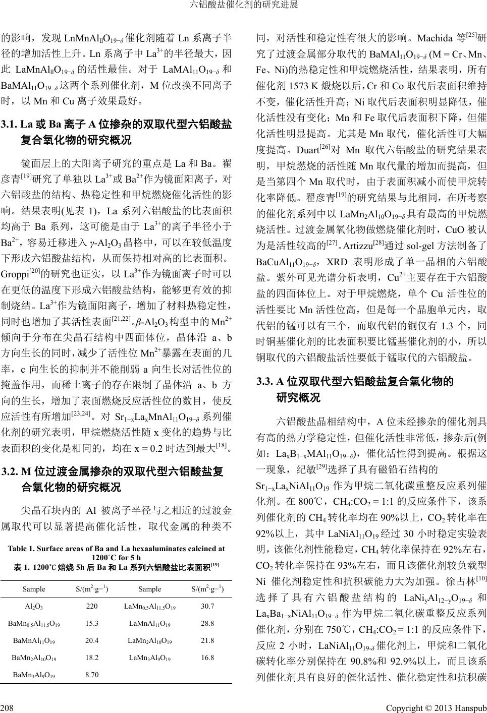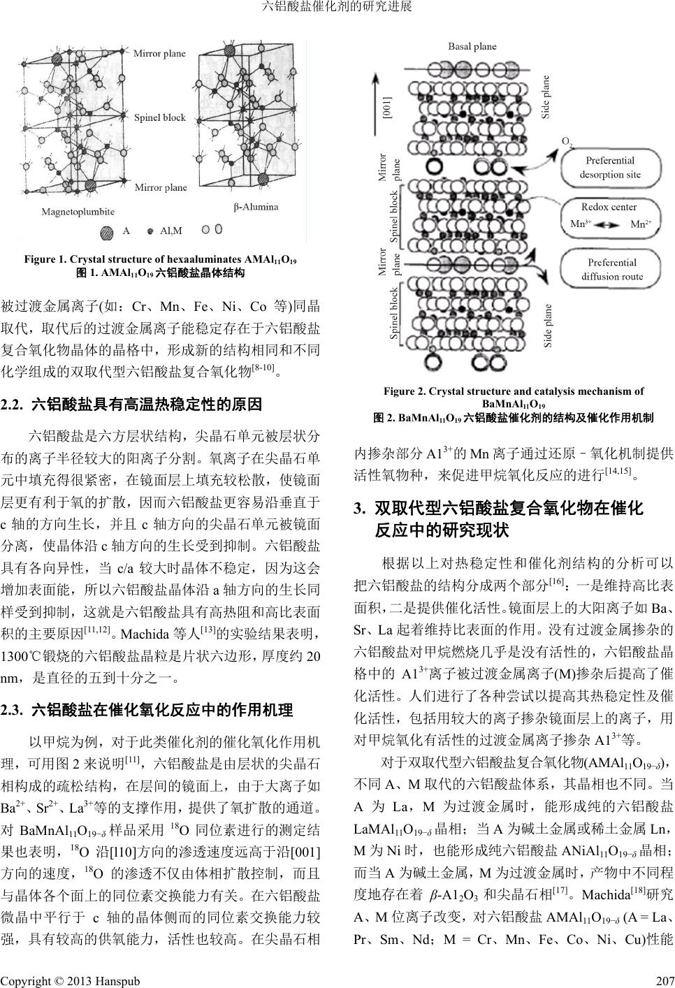 ![]() Material Sciences 材料科学, 2013, 3, 206-210 http://dx.doi.org/10.12677/ms.2013.35037 Published Online September 2013 (http://www.hanspub.org/journal/ms.html) Advance in the Catalysis of Hexaaluminate Compound Fangfang Zhang, Lei Li, Ke Zhang College of Chemistry and Molecular Engineering, Zhengzhou University, Zhengzhou Email: zhangke81@zzu.edu.cn Received: Aug. 10th, 2013; revised: Aug. 24th, 2013; accepted: Aug. 29th, 2013 Copyright © 2013 Fangfang Zhang et al. This is an open access article distributed under the Creative Commons Attribution License, which permits unrestricted use, distribution, and reproduction in any medium, provided the original work is properly cited. Abstract: This paper reviews the structure of hexaaluminate and its application as the catalysis. On the other hand, we also briefly summarize the relative research of hexaaluminate compound and forecast the prospect of the future ap- plication of it. Keywords: Hexaaluminate; Catalyst; Crystal Structure 六铝酸盐催化剂的研究进展 张芳芳,李 雷,张 轲 郑州大学化学分子工程学院,郑州 Email: zhangke81@zzu.edu.cn 收稿日期:2013 年8月10 日;修回日期:2013年8月24 日;录用日期:2013 年8月29日 摘 要:本文从六铝酸盐复合氧化物的晶体结构及作为催化剂的应用方面入手,综述了相应的研究成果,并对 六铝酸盐复合氧化物未来的应用进行了展望。 关键词:六铝酸盐;催化剂;晶体结构 1. 引言 自上世纪 70 年代以来,六铝酸盐复合氧化物的 出现,已经在许多领域得到广泛的应用。如:可以做 超导材料[l],荧光的晶体基质[2],激光材料[3],也可用 于核废料处理[4]等方面。同时,由于六铝酸盐制备温 度高,具有良好的高热稳定性,机械强度大以及较强 的抗热冲击能力和抗水能力,也多用于高温催化燃烧 反应的催化材料,是一种很好的高温热稳定材料,引 起了很多研究者的关注[5,6]。本文从六铝酸盐复合氧化 物的结构特点、性质、应用研究以及未来可能的研究 热点等方面进行了评述。 2. 六铝酸盐复合氧化物的研究现状 2.1. 六铝酸盐复合氧化物的结构 六铝酸盐通式可以表示为 AAl12O19。其结构有两 种:磁铅石型(MP Magnetoplumbite)和β-Al2O3 (β- Alumina)型,这两种结构都是由互成镜相的尖晶石结 构单元(尖晶石块)和镜面交替堆积形成的层状结构。 如图 1所示,这两种结构的主要区别在于镜面上:MP 结构含有一个 An+、一个Al3+和三个 O2−;而 β-Al2O3 结构只有一个An+、一个 O2−,结构较为疏松[7]。六铝 酸盐结构属于哪一种,取决于A位大阳离子的离子半 径和价态;当 A为碱金属离子和 Ba2+离子时,为 β- Al2O3结构;当 A为碱土金属离子或稀土金属离子时, 为磁铅石结构。尖晶石结构单元(尖晶石块)由Al3+和 O2−离子构成,结构较为紧密。晶格中的 Al3+可以部分 Copyright © 2013 Hanspub 206 ![]() 六铝酸盐催化剂的研究进展 Figure 1. Crystal structure of hexaaluminates AMAl11O19 图1. AMAl11O19 六铝酸盐晶体结构 被过渡金属离子(如:Cr、Mn 、Fe 、Ni、Co 等)同晶 取代,取代后的过渡金属离子能稳定存在于六铝酸盐 复合氧化物晶体的晶格中,形成新的结构相同和不同 化学组成的双取代型六铝酸盐复合氧化物[8-10]。 2.2. 六铝酸盐具有高温热稳定性的原因 六铝酸盐是六方层状结构,尖晶石单元被层状分 布的离子半径较大的阳离子分割。氧离子在尖晶石单 元中填充得很紧密,在镜面层上填充较松散,使镜面 层更有利于氧的扩散,因而六铝酸盐更容易沿垂直于 c轴的方向生长,并且 c轴方向的尖晶石单元被镜面 分离,使晶体沿c轴方向的生长受到抑制。六铝酸盐 具有各向异性,当 c/a较大时晶体不稳定,因为这会 增加表面能,所以六铝酸盐晶体沿 a轴方向的生长同 样受到抑制,这就是六铝酸盐具有高热阻和高比表面 积的主要原因[11,12]。Machida 等人[13]的实验结果表明, 1300℃锻烧的六铝酸盐晶粒是片状六边形,厚度约 20 nm,是直径的五到十分之一。 2.3. 六铝酸盐在催化氧化反应中的作用机理 以甲烷为例,对于此类催化剂的催化氧化作用机 理,可用图 2来说明[11],六铝酸盐是由层状的尖晶石 相构成的疏松结构,在层间的镜面上,由于大离子如 Ba2+、Sr2+、La3+等的支撑作用,提供了氧扩散的通道。 对BaMnAl11O19−δ样品采用 18O同位素进行的测定结 果也表明,18O沿[l10]方向的渗透速度远高于沿[001] 方向的速度,18O的渗透不仅由体相扩散控制,而且 与晶体各个面上的同位素交换能力有关。在六铝酸盐 微晶中平行于 c轴的晶体侧而的同位素交换能力较 强,具有较高的供氧能力,活性也较高。在尖晶石相 Figure 2. Crystal structure and catalysis mechanism of BaMnAl11O19 图2. BaMnAl11O19 六铝酸盐催化剂的结构及催化作用机制 内掺杂部分 A13+的Mn离子通过还原–氧化机制提供 活性氧物种,来促进甲烷氧化反应的进行[14,15]。 3. 双取代型六铝酸盐复合氧化物在催化 反应中的研究现状 根据以上对热稳定性和催化剂结构的分析可以 把六铝酸盐的结构分成两个部分[16]:一是维持高比表 面积,二是提供催化活性。镜面层上的大阳离子如Ba、 Sr、La 起着维持比表面的作用。没有过渡金属掺杂的 六铝酸盐对甲烷燃烧几乎是没有活性的,六铝酸盐晶 格中的 A13+离子被过渡金属离子(M)掺杂后提高了催 化活性。人们进行了各种尝试以提高其热稳定性及催 化活性,包括用较大的离子掺杂镜面层上的离子,用 对甲烷氧化有活性的过渡金属离子掺杂 A13+等。 对于双取代型六铝酸盐复合氧化物(AMAl11O19−δ), 不同 A、M取代的六铝酸盐体系,其晶相也