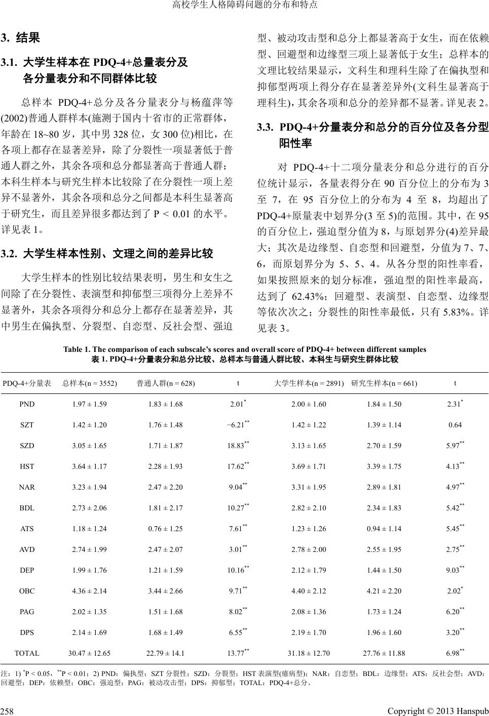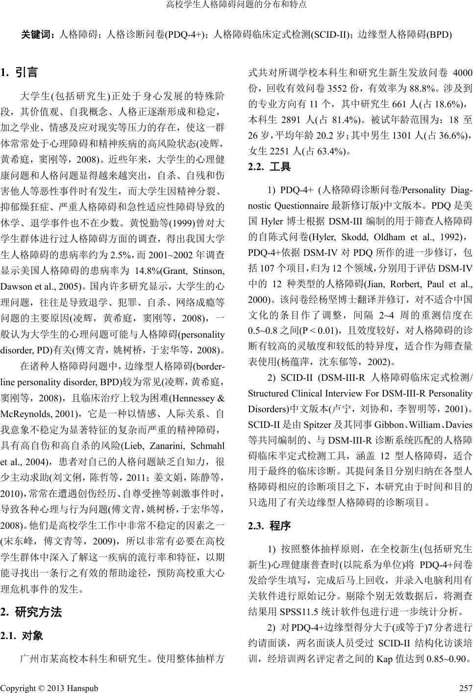 ![]() Advances in Psychology 心理学进展, 2013, 3, 256-261 http://dx.doi.org/10.12677/ap.2013.35039 Published Online September 2013 (http://www.hanspub.org/journal/ap.html) The Distributing and Characteristic of Students’ Personality Disorder Problems in an University Jiangxue Li1, Dangwei Zhou2 1The Research Center of Psychological Counseling, Guangzhou 2Department of Psychology, South China Normal University, Guangzhou Email: 1019488129@qq.com Received: Jun. 17th, 2013 revised: Jul. 4th, 2013; accepted: Jul. 28th, 2013 Copyright © 2013 Jiangxue Li, Dangwei Zhou. This is an open access article distributed under the Creative Commons Attribution Li- cense, which permits unrestricted use, distribution, and reproduction in any medium, provided the original work is properly cited. Abstract: Objective: To achieve an in-depth knowledge of personality disorders prevalence features in the university students groups. Methods: Personality Diagnostic Questionnaire-4 + (PDQ-4+) was administered to a sample consisting of 3552 university students (including postgraduate and undergraduate) to investigate personality disorder (PD) subjects, and BPD subjects were diagnosed by Structured Clinical Interview for DSM-IV personality disorders (SCID-II). Results: 1) The undergraduates showed significantly higher than graduate students in the subscales for different types of PD (excluding schizoid) of PDQ-4+; 2) The males showed significantly higher than females in subtypes of paranoid, schizotypal, antisocial, narcissistic, com- pulsive-obsessive and passive-aggressive, and lower in subtypes of avoidant, borderline and dependent; 3) The results of Percentile showed that the scores of compulsive-obsessive and borderline were significantly higher at the point of 95% than cut-off scores of PDQ-4+; 4) According to the original classification, the positive rate of compulsive-obsessive was the highest, avoidant, histrionic, narcissistic, borderline followed, and schizotypal was the lowest; 5) The prevalence of BPD was 1.74% in the university students groups. Conclusion: There were differences in gender and art & science on some terms of PDQ-4+; the original clas- sification of PDQ-4+ is not suitable for university students, it needs to be adapted when applied. Keywords: Personality Disorder; PDQ-4+; SCID-II; Borderline Personality Disorder 高校学生人格障碍问题的分布和特点 李江雪 1,周党伟 2 1华南师范大学心理咨询研究中心,广州 2华南师范大学心理学院,广州 Email: 1019488129@qq.com 收稿日期:2013 年6月17日;修回日期:2013 年7月4日;录用日期:2013 年7月28日 摘 要:目的:深入了解高校学生群体中人格障碍问题的分布和特点。方法:采用人格障碍诊断问卷 (PDQ-4+)对3552 名高校学生(包括大学生和研究生)进行人格障碍筛查,并用人格障碍临床定式检测 (SCID-II)对该群体中的边缘型人格障碍进行诊断。结果:1) 本科生 PDQ-4+各分量表得分显著高于研究 生(分裂性除外);2) 男生在偏执型、分裂型、自恋型、反社会型、强迫型、被动攻击型上得分显著高 于女生,在依赖型、回避型和边缘型三项上显著低于女生;3) 强迫型和边缘型在 95 的百分位上明显高 于原量表划界分;4) 按原划分标准,强迫型阳性率最高,回避型、表演型、自恋型、边缘型等依次之, 分裂性阳性率最低;5) 高校学生样本中边缘型人格障碍(BPD)的患病率大约为 1.74%。结论:PDQ-4+ 高校样本在一些项目上存在性别和文理科的差异;PDQ-4+原划分标准不适合高校学生样本,建议在实 际工作中采用新的划界分。 Copyright © 2013 Hanspub 256 ![]() 高校学生人格障碍问题的分布和特点 Copyright © 2013 Hanspub 257 关键词:人格障碍;人格诊断问卷(PDQ-4+);人格障碍临床定式检测(SCID-II);边缘型人格障碍(BPD) 1. 引言 大学生(包括研究生)正处于身心发展的特殊阶 段,其价值观、自我概念、人格正逐渐形成和稳定, 加之学业、情感及应对现实等压力的存在,使这一群 体常常处于心理障碍和精神疾病的高风险状态(凌辉, 黄希庭,窦刚等,2008)。近些年来,大学生的心理健 康问题和人格问题显得越来越突出,自杀、自残和伤 害他人等恶性事件时有发生,而大学生因精神分裂、 抑郁燥狂症、严重人格障碍和急性适应性障碍导致的 休学、退学事件也不在少数。黄悦勤等(1999)曾对大 学生群体进行过人格障碍方面的调查,得出我国大学 生人格障碍的患病率约为 2.5%,而 2001~2002 年调查 显示美国人格障碍的患病率为 14.8%(Grant, Stinson, Dawson et al., 2005)。国内许多研究显示,大学生的心 理问题,往往是导致退学、犯罪、自杀、网络成瘾等 问题的主要原因(凌辉,黄希庭,窦刚等,2008),一 般认为大学生的心理问题可能与人格障碍(personality disorder, PD)有关(傅文青,姚树桥,于宏华等,2008)。 在诸种人格障碍问题中,边缘型人格障碍(border- line personality disorder, BPD)较为常见(凌辉,黄希庭, 窦刚等,2008),且临床治疗上较为困难(Hennessey & McReynolds, 2001),它是一种以情感、人际关系、自 我意象不稳定为显著特征的复杂而严重的精神障碍, 具有高自伤和高自杀的风险(Lieb, Zanarini, Schmahl et al., 2004),患者对自己的人格问题缺乏自知力,很 少主动求助(刘文俐,陈哲等,2011;姜文娟,陈静等, 2010),常常在遭遇创伤经历、自尊受挫等刺激事件时, 导致各种心理与行为问题(傅文青,姚树桥,于宏华等, 2008)。他们是高校学生工作中非常不稳定的因素之一 (宋东峰,傅文青等,2009),所以非常有必要在高校 学生群体中深入了解这一疾病的流行率和特征,以期 能寻找出一条行之有效的帮助途径,预防高校重大心 理危机事件的发生。 2. 研究方法 2.1. 对象 广州