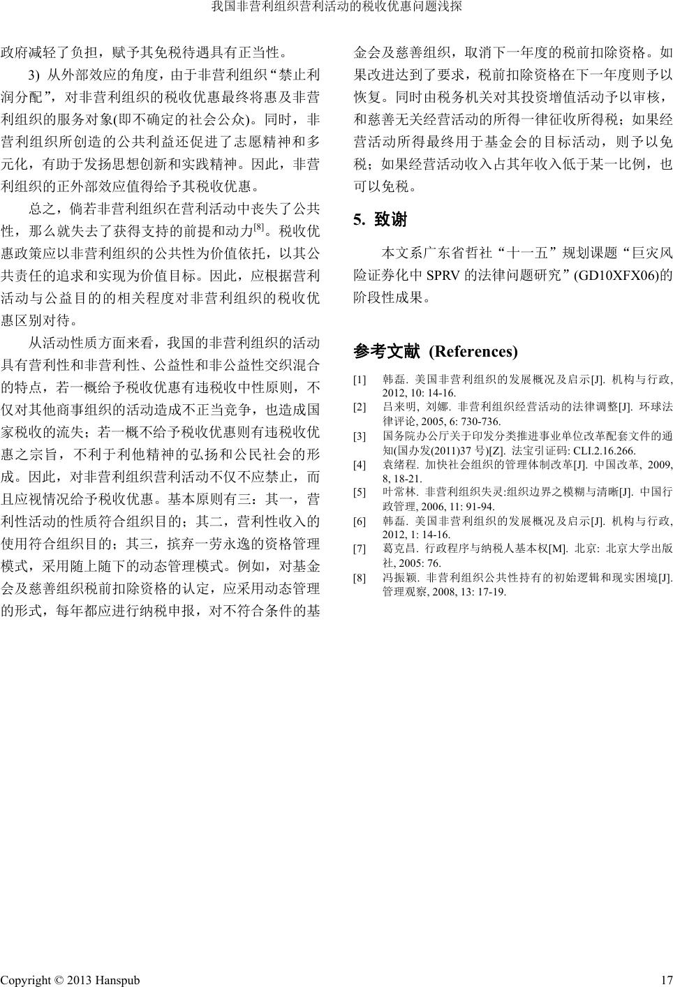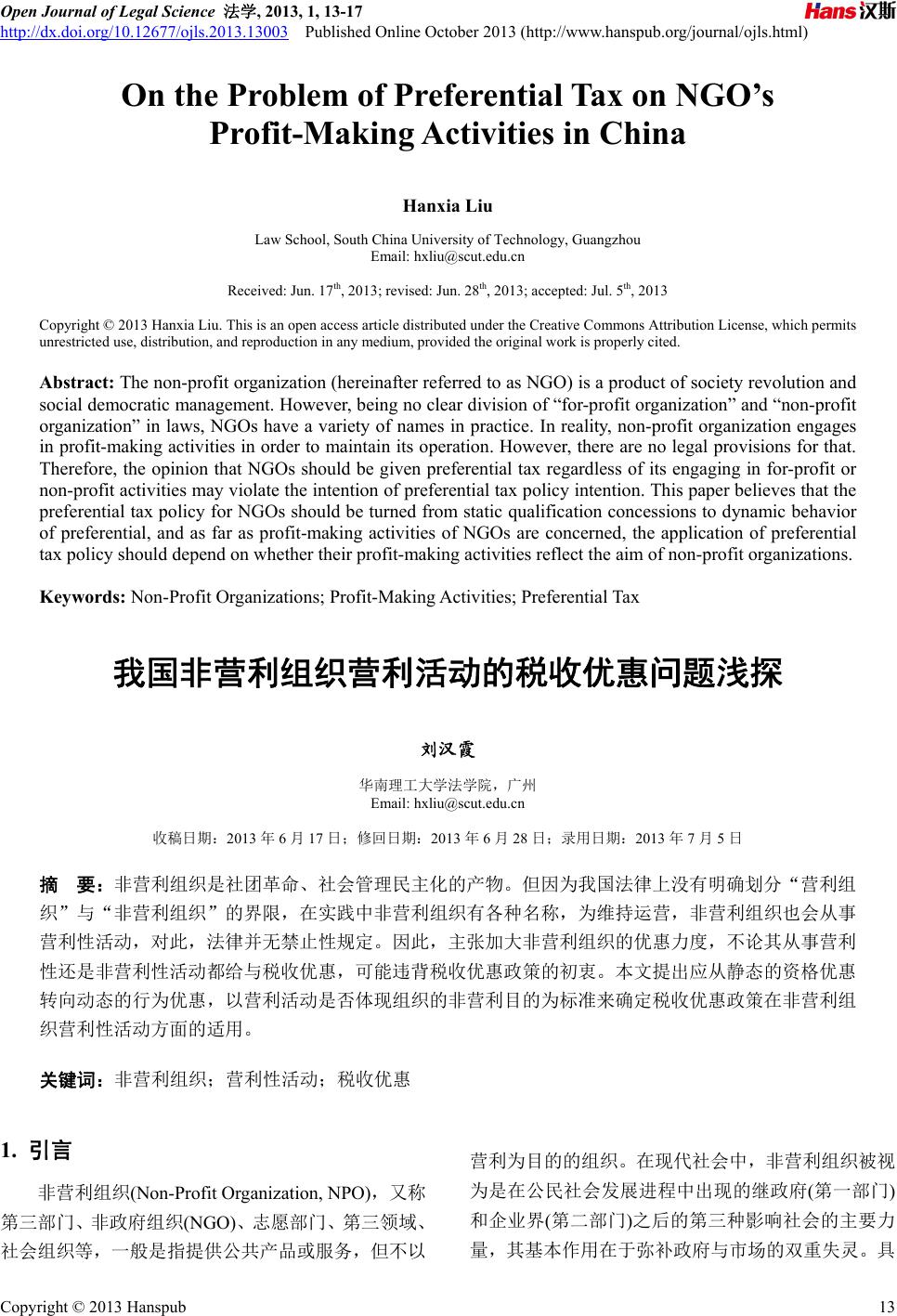 ![]() Open Journal of Legal Science 法学, 2013, 1, 13-17 http://dx.doi.org/10.12677/ojls.2013.13003 Published Online October 2013 (http://www.hanspub.org/journal/ojls.html) On the Problem of Preferential Tax on NGO’s Profit-Making Activities in China Hanxia Liu Law School, South China University of Technology, Guangzhou Email: hxliu@scut.edu.cn Received: Jun. 17th, 2013; revised: Jun. 28th, 2013; accepted: Jul. 5th, 2013 Copyright © 2013 Hanxia Liu. This is an open a cc e s s a r t i cl e d i s tributed under the Creative Commons At tribution License, which permits unrestricted use, distribution, and reproduction in any medium, provided the or iginal work is properly cited. Abstract: The non-profit organization (hereinafter referred to as NGO) is a product of society revolution and social democratic management. Howe ver, being no clear division of “for-profit organization” and “non-profit organization” in laws, NGOs have a variety of names in practice. In reality, non-profit organization engages in profit-making activities in order to maintain its operation. However, there are no legal provisions for that. Therefore, the opinion that NGOs should be given preferential tax regardless of its engaging in for-profit or non-profit activities may violate the in tention of preferential tax p olicy intention . This paper be lieves that the preferential tax policy for NGOs should be turned from static qualification concessions to dynamic behavior of preferential, and as far as profit-making activities of NGOs are concerned, the application of preferential tax policy should depend on whether their profit-making activities reflect the aim of non-profit organizations. Keywords: Non-Profit Organizations; Profit-Making Activities; Preferential T ax 我国非营利组织营利活动的税收优惠问题浅探 刘汉霞 华南理工大学法学院,广州 Email: hxliu@scut.edu.cn 收稿日期:2013 年6月17 日;修回日期:2013 年6月28 日;录用日期:2013 年7月5日 摘 要:非营利组织是社团革命、社会管理民主化的产物。但因为我国法律上没有明确划分“营利组 织”与“非营利组织”的界限,在实践中非营利组织有各种名称,为维持运营,非营利组织也会从事 营利性活动,对此,法律并无禁止性规定。因此,主张加大非营利组织的优惠力度,不论其从事营利 性还是非营利性活动都给与税收优惠,可能违背税收优惠政策的初衷。本文提出应从静态的资格优惠 转向动态的行为优惠,以营利活动是否体现组织的非营利目的为标准来确定税收优惠政策在非营利组 织营利性活动方面的适用。 关键词:非营利组织;营利性活动;税收优惠 1. 引言 非营利组织(Non-Profit Organization, NPO),又称 第三部门、非政府组织(NGO)、志愿部门、第三领域、 社会组织等,一般是指提供公共产品或服务,但不以 营利为目的的组织。在现代社会中,非营利组织被视 为是在公民社会发展进程中出现的继政府(第一部门) 和企业界(第二部门)之后的第三种影响社会的主要力 量,其基本作用在于弥补政府与市场的双重失灵。具 Copyright © 2013 Hanspub 13 ![]() 我国非营利组织营利活动的税收优惠问题浅探 体而言,非营利组织所从事的活动都是市场主体和政 府不愿做或不能做好的事情。非营利组织能够发掘和 运用分散的社会资源,作为公共权力和私人利益的补 充机制,来制衡、沟通、协调和整合个人与群体、群 体与群体以及群体与政府间的关系。营利组织是社会 财富的主要创造者;非营利组织主要致力于社会服务 和管理;政府是在这两者之间,站在更高层次上,进 行政策调节、法律制定和财政支持,来实施宏观调控 和宏观管理[1]。 人们通常认为,非营利组织是不以获取利润为目 的,为社会公益服务的机构。因此,它不能进行营利 性活动,不能赚取利润。因为按照一般商法理论,营 利性组织通过从事以营利为目的的持续性业务活动 来获取利润,如果非营利性组织也从事营利性的活 动,不论其营利的最终用途与目的,都具有商事交易 的形式,在商事交易活动都应该受到同等对待,因此, 非营利组织的营利活动不应享受税收优惠。而相当多 的学者则认为,非营利组织依靠社会捐助的资金来源 已越来越不能支撑其日益扩大的资金需求,为了维持 自身的生存与发展,有必要从事商事交易行为以赚取 利润。对此,国家应给予非营利组织税收优惠政策以 支持其发展。 笔者认为,对非营利组织的营利性活动能否享受 税收优惠问题不能一概而论,应根据活动性质与组织 目的的相关程度区分相关性营利活动与非相关性营 利活动来决定税收优惠政策的适用。 2. 我国对非营利组织营利活动的规制与 问题 非营利组织的“非营利性”是针对于其存在目的 而言的,而不是针对其存在过程中的行为而言的,强 调组织体设立和存在的非营利目的,不等于组织体就 是为“公”的公益性组织,也不意味着该组织体不能 进行经营性活动[2]。事实上,为满足非营利组织的生 存需求,我国法律上并没有禁止非营利组织从事营利 性活动,只是税法上只对非营利收入给予税收优惠, 而营利性收入没有优惠待遇。 我国没有统一的非营利组织立法,对不同类型非 营利组织营利活动的调整散见于各个单行法规之中。 1) 事业单位。国务院 1998 年发布的《事业单位 登记管理暂行条例》第 2条规定:“事业单位是指国 家为了社会公益目的,由国家机关或者其他组织利用 国有资产举办的,从事教育、科技、文化、卫生等活 动的社会服务组织。”事实上,除了以上列举的行业 之外,事业单位还大量存