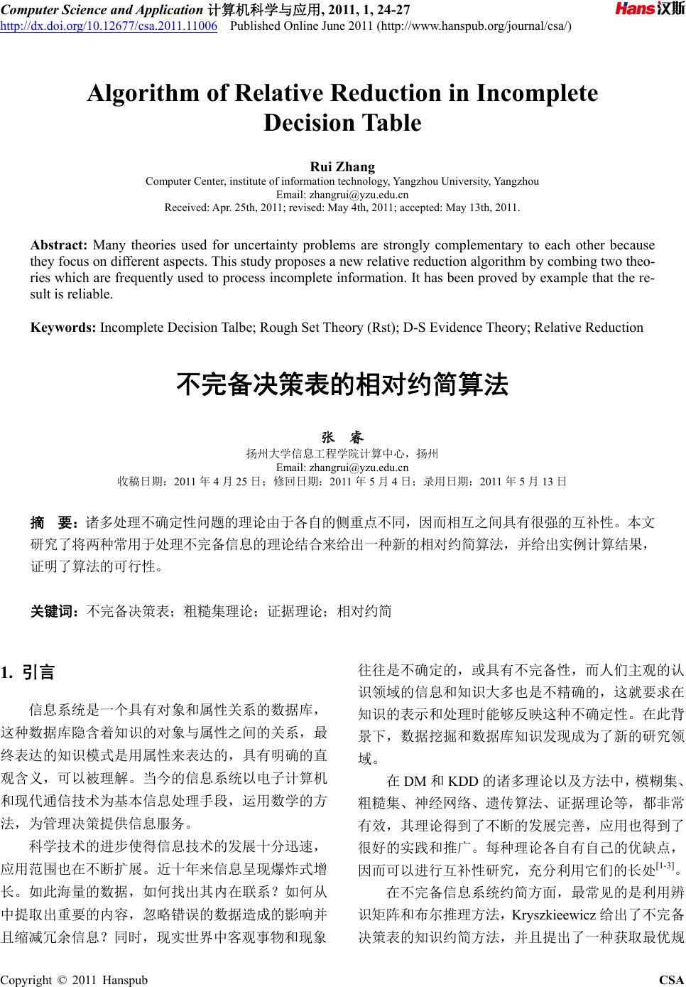 ![]() Computer Science and Application计算机科学与应用, 2011, 1, 24-27 http://dx.doi.org/10.12677/csa.2011.11006 Published Online June 2011 (http://www.hanspub.org/journal/csa/) Copyright © 2011 Hanspub CSA Algorithm of Relative Reduction in Incomplete Decision Table Rui Zhang Computer Center, institute of information technology, Yangzhou University, Yangzhou Email: zhangrui@y zu.edu.cn Received: Apr. 25th, 2011; revised: May 4th, 2011; accepted: May 13th, 2011. Abstract: Many theories used for uncertainty problems are strongly complementary to each other because they focus on different aspects. This study proposes a new relative reduction algorithm by combing two theo- ries which are frequently u sed to process incomplete information. It has been proved by example that the re- sult is reliable. Keywords: Incomplete Decision Talbe; Rough Set Theory (Rst); D-S Evidence Theory; Relative Reduction 不完备决策表的相对约简算法 张 睿 扬州大学信息工程学院计算中心,扬州 Email: zhangrui@yzu.edu.cn 收稿日期:2011 年4月25日;修回日期:2011 年5月4日;录用日期:2011 年5月13 日 摘 要:诸多处理不确定性问题的理论由于各自的侧重点不同,因而相互之间具有很强的互补性。本文 研究了将两种常用于处理不完备信息的理论结合来给出一种新的相对约简算法,并给出实例计算结果, 证明了算法的可行性。 关键词:不完备决策表;粗糙集理论;证据理论;相对约简 1. 引言 信息系统是一个具有对象和属性关系的数据库, 这种数据库隐含着知识的对象与属性之间的关系,最 终表达的知识模式是用属性来表达的,具有明确的直 观含义,可以被理解。当今的信息系统以电子计算机 和现代通信技术为基本信息处理手段,运用数学的方 法,为管理决策提供信息服务。 科学技术的进步使得信息技术的发展十分迅速, 应用范围也在不断扩展。近十年来信息呈现爆炸式增 长。如此海量的数据,如何找出其内在联系?如何从 中提取出重要的内容,忽略错误的数据造成的影响并 且缩减冗余信息?同时,现实世界中客观事物和现象 往往是不确定的,或具有不完备性,而人们主观的认 识领域的信息和知识大多也是不精确的,这就要求在 知识的表示和处理时能够反映这种不确定性。在此背 景下,数据挖掘和数据库知识发现成为了新的研究领 域。 在DM 和KDD 的诸多理论以及方法中,模糊集、 粗糙集、神经网络、遗传算法、证据理论等,都非常 有效,其理论得到了不断的发展完善,应用也得到了 很好的实践和推广。每种理论各自有自己的优缺点, 因而可以进行互补性研究,充分利用它们的长处[1-3]。 在不完备信息系统约简方面,最常见的是利用辨 识矩阵和布尔推理方法,Kryszkieewicz 给出了不完备 决策表的知识约简方法,并且提出了一种获取最优规 ![]() 张睿 不完备决策表的相对约简算法25 | 则的方法。Leung 等提出了基于极大相容块技术的方 法。国内学者也提出了许多约简算法[4-10]。 尽管不完备决策表缺少信息,但仍然蕴涵一些有 用的知识,这些知识对于不完备信息下的决策,是很 有意义的。本文将证据理论的概念融入粗糙集,给出 了一种新的计算不完备决策表相对约简的算法,并用 实例进行了验证,分析了算法的复杂度。 2. 不完备信息的相关理论 2.1. 不完备信息系统概述 定义 1[1] 设S = (U, AT)是信息系统。其中 U是 对象的非空有限集合,AT 是属性的非空有限集合。对 每个属性有 a:U。其中Va 称为 a的值 域。如果至少有一个属性 aATVa aAT 使得 Va 含有空值, 则称 S为一个不完备信息系统,并用“*”表示空值。 对于不完备信息系统中的未知信息,存在两种可 能性:①该值是存在的但它被遗漏了;②该对象在其 他属性值确定的情况下为空值的属性没有办法赋值。 定义 2[1] 不完备决策表(DT)是一个不完备信息 系统 。其中属性 称为决策属性,是完备的;AT 中的属性称为条件属性。 ,DTU ATd )(,* d dd ATV 2.2. 不完备信息下的粗糙集理论 粗糙集(RST)[1-3]理论由波兰数学家 Z. Pawlak[2]于 1982 年提出。这是一种研究信息系统中不精确,不确 定或模糊信息的理论。 与完备信息系统的不可分关系相对应,本文给出 不完备信息系统的相似关系定义。 定义 3[1] 令 A AT,定义相似关系如下: () {(,)|, ()()() *() *} SIMAx yUUaA axayaxay (1) 相似关系有如下性质: 性质 1 SIM(A)是一个相容关系: () ({}) aA SIM ASIMa 令SA(x)表示对象集 |,yU xySIMA |xU 。对 于A而言,SA(x)是与x可能可区分的对象最大集合。 令 表示分类, /AUSIMA Sx A/USIM /USIMA 中的任何元素称为相容类。 中的相容类一 般不构成 U的划分,它们构成U的覆盖。∪U / SIM (A) = U。 令DA(x)表示对象集{|。对 于A而言,DA(x)是与 x可能不可分的对象的最大集合。 (,) (yU xySIMA)} 对任意 x U ,SA (x) ∩ DA (x) = φ且SA (x) ∪ DA (x) = U。 定义 4[1] 不完备决策表中的广义决策函数 :(), Ad UPVAAT 定义为: () {|(),()} AA x iidy ySx (2) 其中,P(Vd)表示 Vd的幂集。 定义 5[1] 形式上,条件属性集AT是不完备决策 表的一个相对约简,若 , AAT A AT且 B AT BA 。 2.3. 不完备信息下的粗糙集理论 证据理论[11-13]工作在封闭世界假设(CWA)的基础 上。设 θ 是一有限论域,通常称为辨别框架,由一组 我们需要研究的互斥且穷举的命题组成。 θ 的一个子 集,即 2 θ 中的元素,可以理解为一个命题。 定义 6[12] 对应于一个辨别框架 θ 的基本概率赋 值函数,或称为 m函数,定义如下: m : 2 θ → [0, 1] m函数有如下性质: (1) m( φ ) = 0 (2)∑m(X) = 1,X φ 表示空命题,因而对其信任度为 0