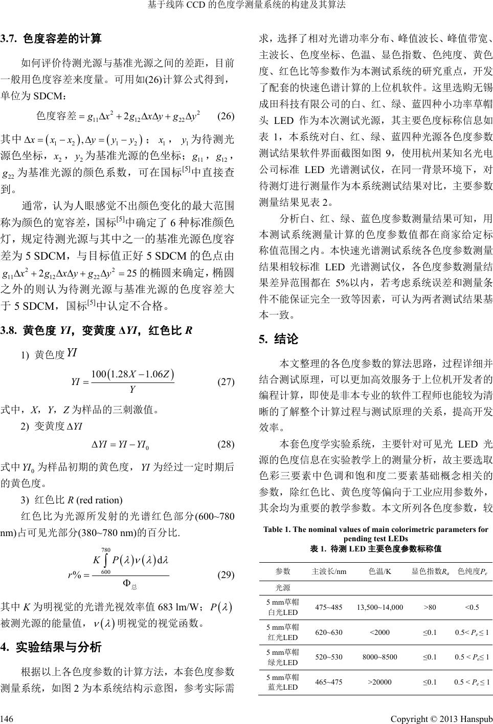 ![]() Applied Physics 应用物理, 2013, 3, 141-148 http://dx.doi.org/10.12677/app.2013.37027 Published Online September 2013 (http://www.hanspub.org/journal/app.html) Colorimetric Measurement System and Its Algorithm Based on Linear Array CCD Zili Zou1, Chenghua Sui1*, Xiaoming Chen2 1Department of Applied Physics, College of Science, Zhejiang University of Technology, Hangzhou 2Shanghai Keming Instrument Co., Shanghai Email: zlzhou@brolight.cn, zouzili8017839@qq.com, *suich@zjut.edu.cn Received: Jul. 10th, 2013; revised: Jul. 19th, 2013; accepted: Jul. 24th, 2013 Copyright © 2013 Zili Zou et al. This is an open access article distributed under the Creative Commons Attribution License, which permits unre- stricted use, distribution, and reproduction in any medium, provided the original work is properly cited. Abstract: We propose a method of colorimetric measurement system construction based on linear array CCD. It can be used to measure the color information of illumination light source that commonly used. At the same time, we also have given the algorithm ideas of chromatic parameters in details which have been used to develop the rapid PC calculation software. By using this measurement system, we have a colorimetric experiment on LED light source, and the mea- surement results are basically consistent with the standard LED spectrum tester. Keywords: Linear Array CCD; Colorimetry; Calculation Software 基于线阵 CCD 的色度学测量系统的构建及其算法 邹自立 1,隋成华 1*,陈晓明 2 1浙江工业大学理学院应用物理系,浙江,杭州 2上海科铭仪器有限公司,上海 Email: zlzhou@brolight.cn, zouzili8017839@qq.com, *suich@zjut.edu.cn 收稿日期:2013 年7月10 日;修回日期:2013年7月19日;录用日期:2013年7月24日 摘 要:提出了一种基于线阵CCD 的色度学测量系统的构建方法,利用该系统可完成照明光源常用颜色信息的 测量。同时整理出了各种色度学参数算法较为详细的计算思路,并利用此算法开发了配套的上位机快速计算软 件。利用本测量系统,对 LED 光源进行色度实验测试,测试结果与某标准 LED 光谱测试仪测量结果基本一致。 关键词:线阵 CCD;色度学;计算软件 1. 引言 色度学是一门研究人的颜色视觉规律、颜色测量 理论与技术的科学,是 20 世纪发展起来的以物理光 学、视觉生理、视觉心理、心理物理等学科领域为基 础的综合性学科[1,2]。无论是实际应用方面,如LED 照明产业,还是高校物理实验室对色度学实验的实际 需求,都对光源颜色特性参数如色坐标、主波长、色 纯度、色温、显色指数、色度容差、黄色度、变黄度、 红色比等的评价与计量提出了更高的要求。 本文提出了一款基于线阵CCD 的可用于高校实 验室进行快速光源色度特性参数测量的实验系统的 构建设想,依据国家标准和国际照明委员会(CIE)提出 有关色度学标准[3-8],整理出了相关色度参数算法较为 详细的计算步骤,可以作为上位机计算软件的开发中 色度计算的算法思路。 *通讯作者。 Copyright © 2013 Hanspub 141 ![]() 基于线阵 CCD 的色度学测量系统的构建及其算法 2. 基于线阵 CCD 的色度学实验系统结构 获得照明光源 380~780 nm范围内的光谱功率分 布,是计算其他色度参数的首要条件。测量光源的光 谱功率分布也是本系统的功能核心。本系统原理框架 图如图 1,待测光源与积分球组成光源部分,光线由 光纤导入光学系统(主要由反射镜与光栅组成),经过 光学系统之后将不同波长的光分散投射到CCD 探测 器上的不同位置,经过数据采集模块,将光信号转化 为电信号,在通信模块中,把电信号经过放大等处理 后进入 AD 转换模块,将模拟的电信号转换为数字信 号,之后在CPLD 和微控制器的配合工作下存入到静 态RAM 中,再把数据通过 USB口上传到PC 上位机, 接着在上位机进行波长定标和能量校准,就可得到待 测光源的相对光谱功率分布数据信息,也就可以开始 进行其他色度学参数的计算了,图 2为本系统的结构 示意图。 3. 色度学各参数的计算方法 3.1. 相对光谱功率分布 Px( ),峰值波长, 谱线宽度的计算 要计算待测光源的相对光谱功率分布,首先要得 到该线阵 CCD 探测器各波长的仪器响应系数 Ki,我 们常用标准 A光源(色温 2856 K)通过对比得到该响应 系数 Ki。图 3为Px(λ)简易的计算流程, 具体对比计算为公式(1): , , ri i Ai P KP (1) 式中,Pr,i( )为标准 A光源已知 T = 2856 K色温下, 利用普朗克公式(2)得到的能量曲线数据,PA,i( )为标 准A光源在该 CCD 探测器上实际采样的能量分布值。 21 5 ,1 e1 CT ri PC (2) 式中, 为第一辐射常数, 为第二辐射常数,λ为波长。 16 2 13.741810W mC 2 38810m K 21.4C 则任意待测光源的光谱功率分布由公式(3) 计算 得到 ,xii i Pl KSl (3) 式中,Si( )为待测光源在CCD 探测器上的实际采样 能量分布值。 Figure 1. System block diagram 图1. 系统原理框图 Figure 2. System structure diagram 图2. 系统结构示意图 Figure 3. The calculation process of Px( ) 图3. 相对光谱功率分布计算流程 峰值波长 m为Px,i( )中最大值所对应的波长, 谱线宽度 Δ 为Px,i( )中最大值一半处所对应的两 个波长之差。 3.2. 色度坐标的计算 在1˚~4˚视场角时,我们常用CIE1931 标准色度 系统的三刺激值X,Y,Z和色品坐标 x,y,z表示颜色。图 Copyright © 2013 Hanspub 142 ![]() 基于线阵 CCD 的色度学测量系统的构建及其算法 Figure 4. The calculation process of chromaticity coordinates 图4. 色品坐标计算流程 4为色坐标计算流程。 其中三刺激值X,Y,Z的计算如公式(3): 780 380 d mx XKP x (3a) 780 380 d mx YKP y (3b) 780 380 d mx ZKP z (3c) 其中:Km = 683 lm/W,为辐