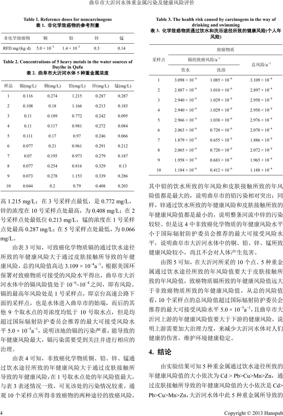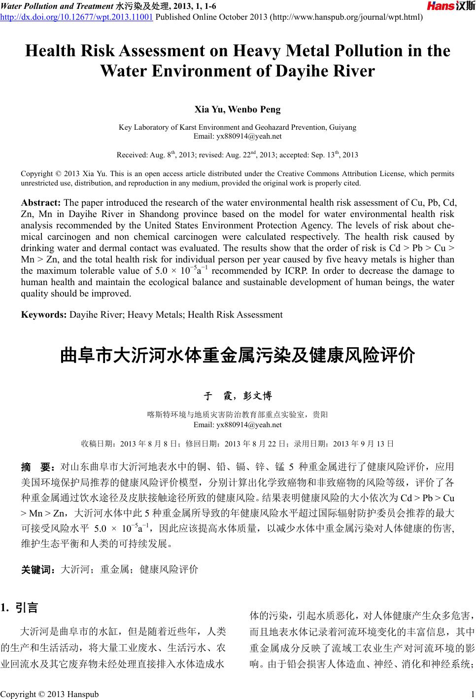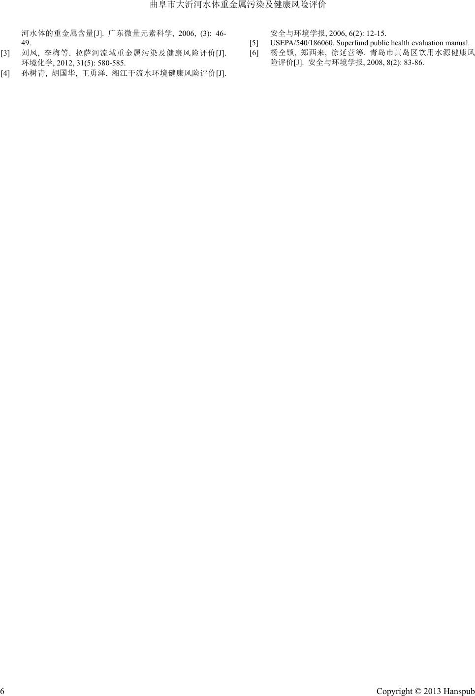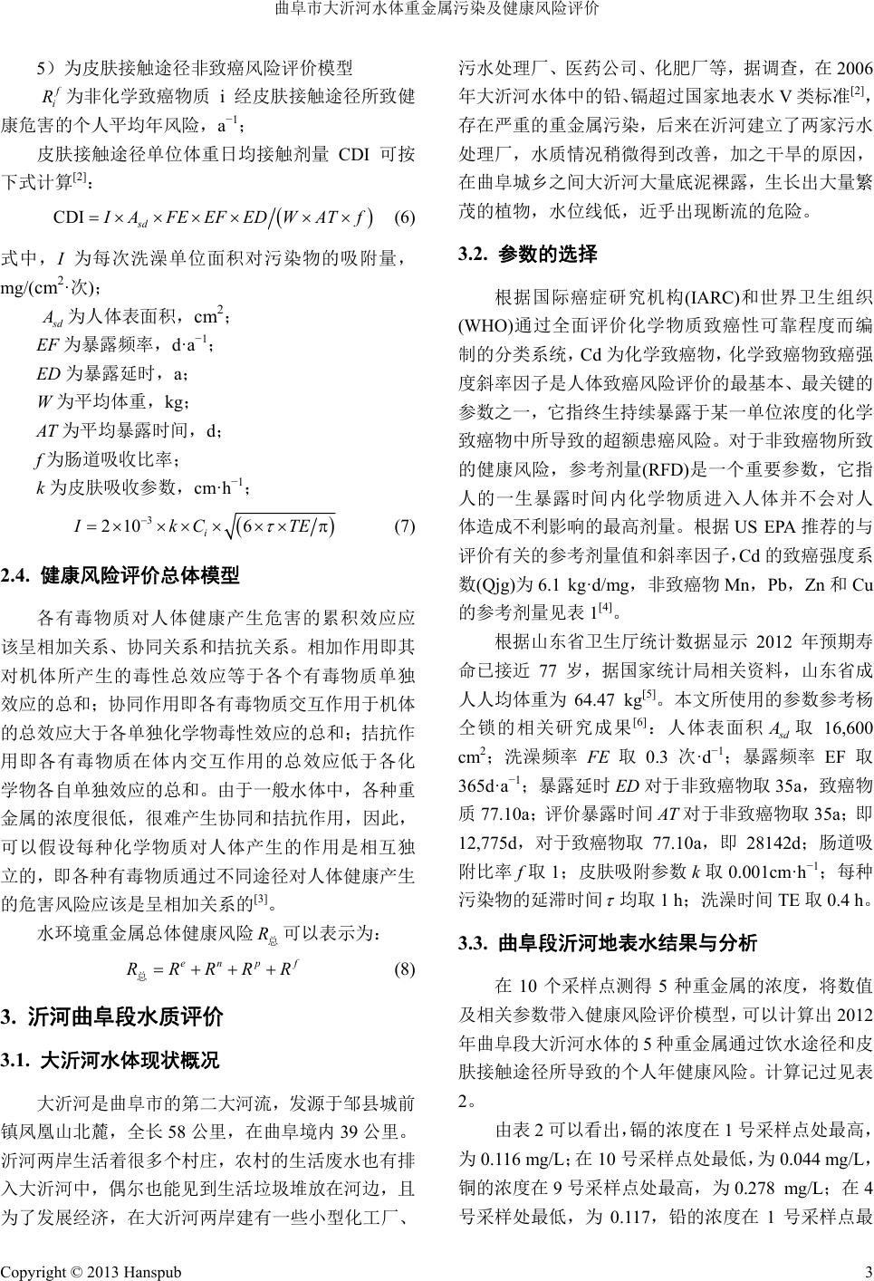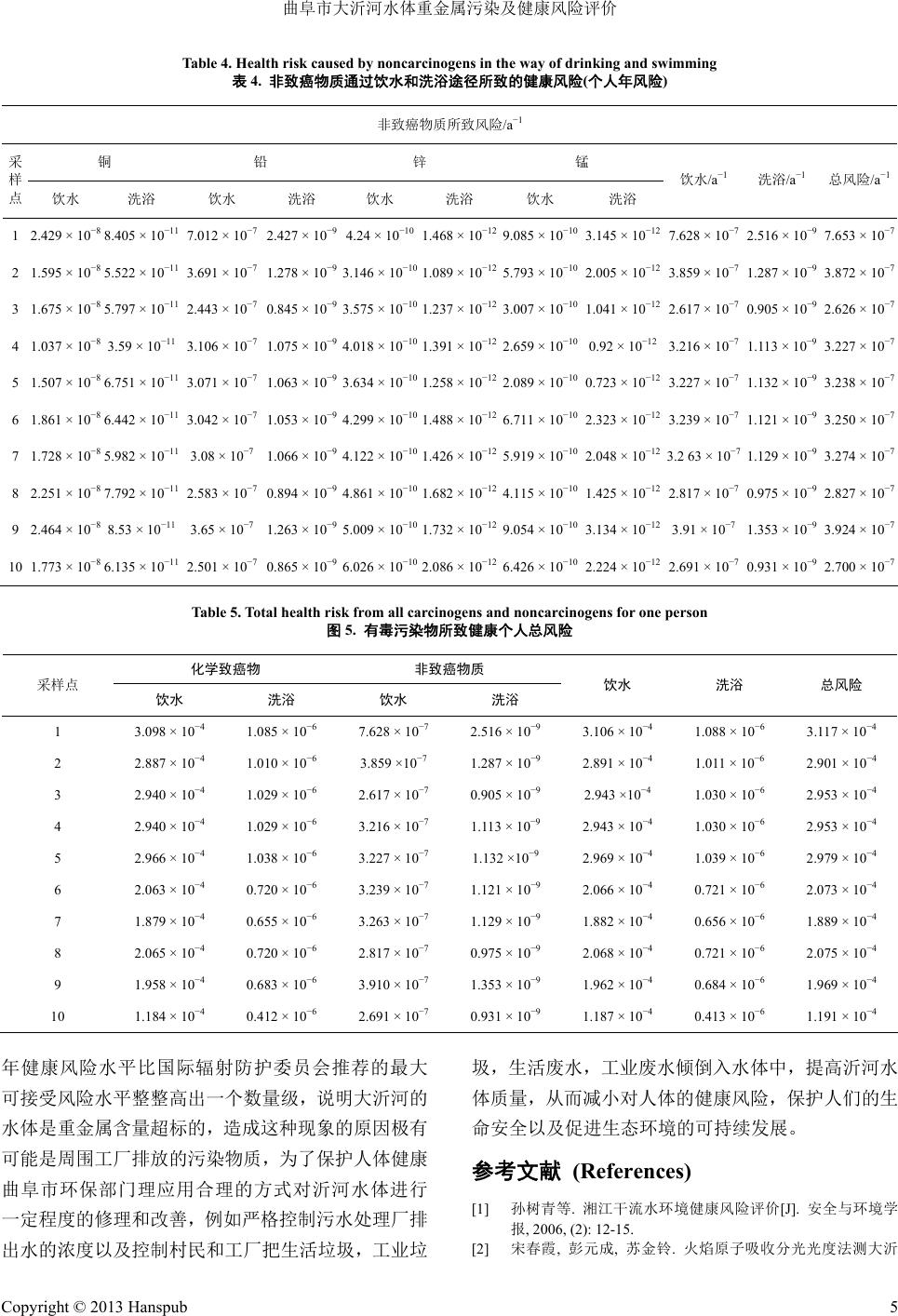 ![]() Water Pollution and Treatment水污染及处理, 2013, 1, 1-6 http://dx.doi.org/10.12677/wpt.2013.11001 Published Online October 2013 (http://www.hanspub.org/journal/wpt.html) Health Risk Assessment on Heavy Metal Pollution in the Water Environment of Dayihe River Xia Yu, W enbo Peng Key Laboratory of Karst Environment and Geohazard Prevention, Guiyang Email: yx880914@yeah.net Received: Aug. 8th, 2013; revised: Aug. 22nd, 2013; accepted: Sep. 13th, 2013 Copyright © 2013 Xia Yu. This is an open access article distributed under the Creative Commons Attribution License, which permits unrestricted use, distribution, and reproduction in any medium, provided the original work is properly cited. Abstract: The paper introduced the research of the water environmental health risk assessment of Cu, Pb, Cd, Zn, Mn in Dayihe River in Shandong province based on the model for water environmental health risk analysis recommended by the United States Environment Protection Agency. The levels of risk about che- mical carcinogen and non chemical carcinogen were calculated respectively. The health risk caused by drinking water and dermal contact was evaluated. The results show that the order of risk is Cd > Pb > Cu > Mn > Zn, and the total health risk for individual person per year caused by five heavy metals is higher than the maximum tolerable value of 5.0 × 10−5a−1 recommended by ICRP. In order to decrease the damage to human health and maintain the ecological balance and sustainable development of human beings, the water quality should be improved. Keywords: Dayihe River; Heavy Metals; Health Risk Assessment 曲阜市大沂河水体重金属污染及健康风险评价 于 霞,彭文博 喀斯特环境与地质灾害防治教育部重点实验室,贵阳 Email: yx880914@yeah.net 收稿日期:2013 年8月8日;修回日期:2013年8月22 日;录用日期:2013年9月13日 摘 要:对山东曲阜市大沂河地表水中的铜、铅、镉、锌、锰 5种重金属进行了健康风险评价,应用 美国环境保护局推荐的健康风险评价模型,分别计算出化学致癌物和非致癌物的风险等级,评价了各 种重金属通过饮水途径及皮肤接触途径所致的健康风险。结果表明健康风险的大小依次为 Cd > Pb > Cu > Mn > Zn,大沂河水体中此 5种重金属所导致的年健康风险水平超过国际辐射防护委员会推荐的最大 可接受风险水平 5.0 × 10−5a−1,因此应该提高水体质量,以减少水体中重金属污染对人体健康的伤害, 维护生态平衡和人类的可持续发展。 关键词:大沂河;重金属;健康风险评价 1. 引言 大沂河是曲阜市的水缸,但是随着近些 年 ,人类 的生产和生活活动,将大量工业废水、生活污水、农 业回流水及其它废弃物未经处理直接排入水体造成水 体的污染,引起水质恶化,对人体健康产生众多危害, 而且地表水体记录着河流环境变化的丰富信息,其中 重金属成分反映了流域工农业生产对河流环境的影 响。由于铅会损害人体造血、神经、消化和神经系统; Copyright © 2013 Hanspub 1 ![]() 曲阜市大沂河水体重金属污染及健康风险评价 镉可对人的肝和肾造成严重蓄积性伤害;过量铜可致 儿童胆汁淤积、贫血、Wilson 氏症等;锌可致贫血、 高血压、冠心病等;锰可致神经衰弱综合征和自主神 经功能紊乱等。因而通过对河流水体中铜、铅、镉、 锌、锰 5种重金属的浓度的研究,可以评价人类生产 生活活动造成的污染通过水体对人自身的影响。本文 应用美国环保署(USEPA)推荐的健康风 险评 价模型 及 Strenge 等提出的皮肤接触计算模型进行年健康风险 值计算,又通过国际辐射防护委员会推荐的最大可接 受风险进行比较,以期探讨沂河水体现状以及对居民 健康的状况的影响,为沂河水质安全控制和环境质量 的综合评价提供科学依据。 2. 材料与方法 2.1. 样品采集与处理 根据河水采样标准,在市沂大河分别取地表水 10 个样(图1)。采集样品用的 500 ml聚乙烯瓶在使用前 用10%的硝酸水溶液浸泡 24 h,然后用去离子水冲洗 干净。采集水样时先放水 5 min,用水样洗涤容器 3 次,再取水样密封运回实验室进行实验。 2.2. 样品测定 利用原子吸收分光光度计,分别采用火焰法在波 长324.7 nm下测铜、在波长 283.3 nm下测铅、在波 长228.8 nm下测镉、在波长 213.8 nm下测锌、在波 长279.4 nm下测锰。实验所器皿在硝酸溶液中浸泡 24 小时以上,并用蒸馏水洗净后烘干,样品测定设定 空白对照,分析过程所用试剂均为分析纯,实验用水 为去离子水。 2.3. 健康风险评价模型 水环境健康风险评价主要包括两方面。1) 基因毒 物质,包括放射性污染物和化学致癌物。对于放射性 污染物,在一般水体中,其污染程度很轻,一般检测 不出,因此,仅考虑化学致癌物。2) 躯体毒物质,即 非致癌物和化学有毒物质[1]。根据国际癌症研究机构 (IARC)和世界卫生组织(WHO)编制的分类系统 ,水环 境健康风险评价模型分为饮水途径所致健康风险模 型和洗浴途径所致的健康风险评价模型,而此两个模 型又包括化学致癌物健康风险模型和非致癌物健康 Figure1. Location of ten sampling sites 风险模型。 2.3.1. 饮水健康风险评价模型 1exp e ii RDq i L (1) 1) 式为饮水途径致癌物所致健康风险模型, e i R为化学致癌物 i经饮水途径产生的平均个人 致癌年风险,a−1; i D为化学致癌物 i经饮水途径的单位体质量日 均暴露剂量,mg·(kg·d) −1; i q为化学致癌物经饮水途径致癌强度系数, kg·d·mg−1; L为人类平均寿命,a。 6 RFD 10 n iii DR L (2) 2) 式为饮水途径非致癌物所致健康风险模型 n i R为非致癌物 i通过饮水途径产生的个人平均 年风险,a−1