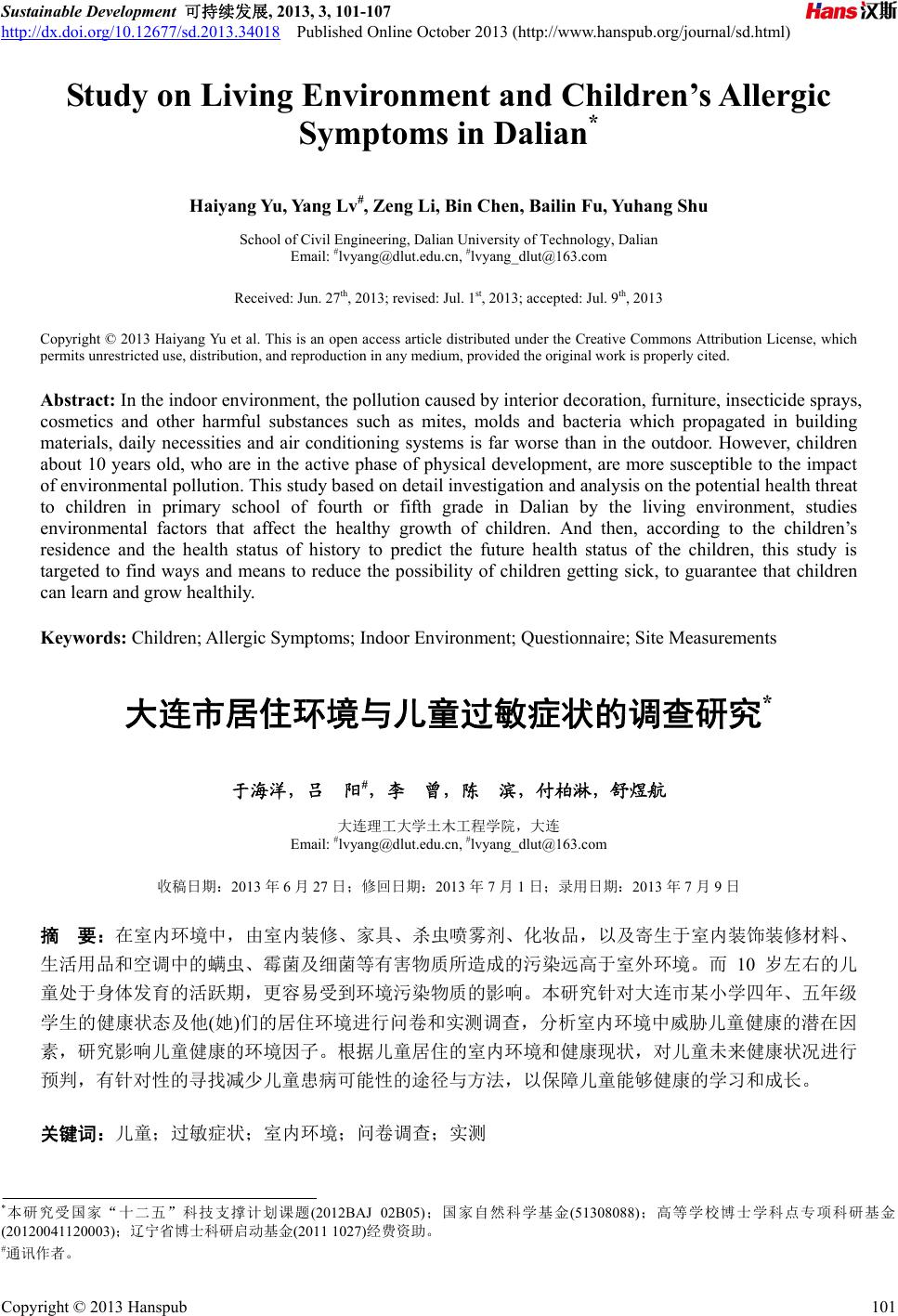 ![]() Sustainable Development 可持续发展, 2013, 3, 101-107 http://dx.doi.org/10.12677/sd.2013.34018 Published Online October 2013 (http://www.hanspub.org/journal/sd.html) Study on Living Environment and Children’s Allergic Symptoms in Dalian* Haiyang Yu, Ya ng Lv#, Zeng Li, Bin Chen, Bailin Fu, Yuhang Shu School of Civil Engineering, Dalian University of Technology, Dalian Email: #lvyang@dlut.edu.cn, #lvyang_dlut@163.com Received: Jun. 27th, 2013; revised: Jul. 1st, 2013; accepted: Jul. 9th, 2013 Copyright © 2013 Haiyang Yu et al. This is an open access article distributed under the Creative Commons Attribution License, which permits unrestricted use, distribution, and reproduction in any medium, provided the original work is properly cited. Abstract: In the indoor environment, the pollution caused by interior decoration, furniture, insecticid e sprays, cosmetics and other harmful substances such as mites, molds and bacteria which propagated in building materials, daily necessities and air conditioning systems is far worse than in the outdoor. However, children about 10 years old, who are in the active phase of physical development, are more susceptible to the impact of environmental pollution. This study based on detail investigation and analysis on the potential health threat to children in primary school of fourth or fifth grade in Dalian by the living environment, studies environmental factors that affect the healthy growth of children. And then, according to the children’s residence and the health status of history to predict the future health status of the children, this study is targeted to find ways and means to reduce the possibility of children getting sick, to guarantee that children can learn and grow healthily. Keywords: Children; Allergic Symptoms; Indoor Environment; Questionnaire; Site Measu rements 大连市居住环境与儿童过敏症状的调查研究* 于海洋,吕 阳#,李 曾,陈 滨,付柏淋,舒煜航 大连理工大学土木工程学院,大连 Email: #lvyang@dlut.edu.cn, #lvyang_dlut@163.com 收稿日期:2013 年6月27 日;修回日期:2013 年7月1日;录用日期:2013 年7月9日 摘 要:在室内环境中,由室内装修、家具、杀虫喷雾剂、化妆品,以及寄生于室内装饰装修材料、 生活用品和空调中的螨虫、霉菌及细菌等有害物质所造成的污染远高于室外环境。而 10 岁左右的儿 童处于身体发育的活跃期,更容易受到环境污染物质的影响。本研究针对大连市某小学四年、五年级 学生的健康状态及他(她)们的居住环境进行问卷和实测调查,分析室内环境中威胁儿童健康的潜在因 素,研究影响儿童健康的环境因子。根据儿童居住的室内环境和健康现状,对儿童未来健康状况进行 预判,有针对性的寻找减少儿童患病可能性的途径与方法,以保障儿童能够健康的学习和成长。 关键词:儿童;过敏症状;室内环境;问卷调查;实测 *本研究受国家“十二五”科技支撑计划课题(2012BAJ 02B05);国家自然科学基金(51308088);高等学校博士学科点专项科研基金 (20120041120003);辽宁省博士科研启动基金(2011 1027)经费资助。 #通讯作者。 Copyright © 2013 Hanspub 101 ![]() 大连市居住环境与儿童过敏症状的调查研究 Copyright © 2013 Hanspub 102 1. 引言 “过敏”这个词源于希腊,原意是“不正常的反 应”。现代医学认为是由于免疫系统错把一些原本无 害的物质当做危险的外来入侵者,反应过度形成了过 敏[1]。其中,儿童过敏性疾病主要有过敏性鼻炎、过 敏性哮喘和过敏性皮肤病[2]。 随着社会工业化程度不断提高,过敏性疾病在全 世界范围内呈逐年增高趋势[3]。2005 年世界变态反应 组织公布了对 30 个国家流行病学调查,在这些国家 12 亿总人口中,22%患IgE 介导的过敏性疾病,美国 过敏性疾病发病率约 20%~40%,成为美国第六大慢 性疾病;英国 1/5 的人患有花粉症和过敏性哮喘、1/6 儿童患与过敏反应有关的皮肤病[4]。WHO 把过敏性疾 病列为“21 世纪重点研究和预防的疾病”。常见过敏 性疾病包括婴儿期面部湿疹(俗称奶癣)、幼儿期过敏 性鼻炎、过敏性哮喘。研究表明,中国现有两亿多人 患有过敏性疾病,且呈日渐俱增的趋势[4]。在这中间, 儿童占相当大的比例,而且由于儿童处于发育期,过 敏的影响更加深远,应引起重视。 本研究旨在通过问卷调查和实测的方法,探寻大 连市儿童过敏症状的主要诱因,并对其进行分析,有 针对性的寻找减少儿童患病可能性的途径与改善方 法,从而达到使儿童过敏症状发生率降低的目的,更 好地保障儿童的身心健康。 2. 研究方案 2.1. 问卷调查概况 问卷抽查对象为大连市某小学四、五年级学生, 调查时间从 2012 年11 月9日至2012 年11 月16 日。 调查表交由儿童父母或监护人填写,7日内回收。共 发放调查问卷120 份,回收问卷 120 份,有效分析问 卷116份,问卷回复率100%,有 效 率 为96.7%。问 卷 发放及回收的基本情况如表 1所示。 Table 1. Questionnaires and recycling 表1. 问卷发放及回收情况 项目 A小学 B小学 发放问卷 60 60 回收问卷 60 60 回收问卷比例 100% 100% 有效问卷 59 57 有效问卷比例 98% 95% 问卷共有 83 项问题,包含多选和单选,分为三 大方面:居住环境相关问题,住宅设备及生活方式相 关问题,关于孩子的健康状况问题。表 2是对问卷问 题设置的总结。 2.2. 实测调查概况 2.2.1. 研究对象 研究选取大连市某小学典型教室进行实测,实测 时间是 2012 年12 月。教室具有前后两扇门,四扇窗 户,两片暖气,为标准的学生教室构造。测量项目包 括温湿度、总挥发性有机化合物(TVOC)、可吸入颗粒 物(PM10)。对于颗粒物的测试主要是考虑到该