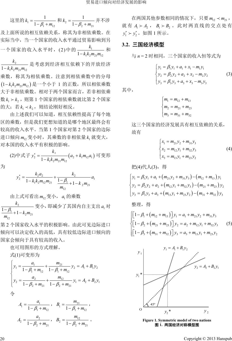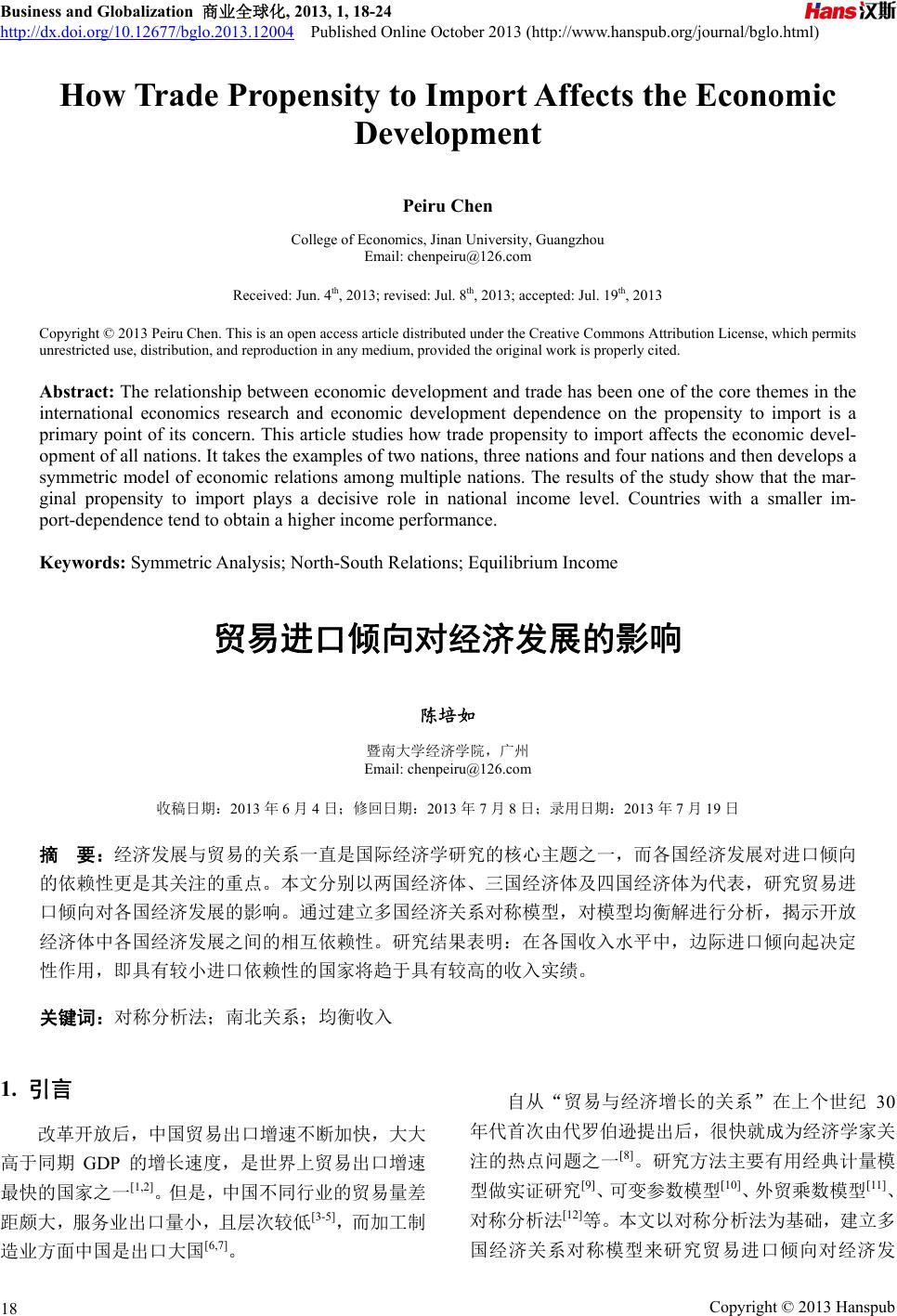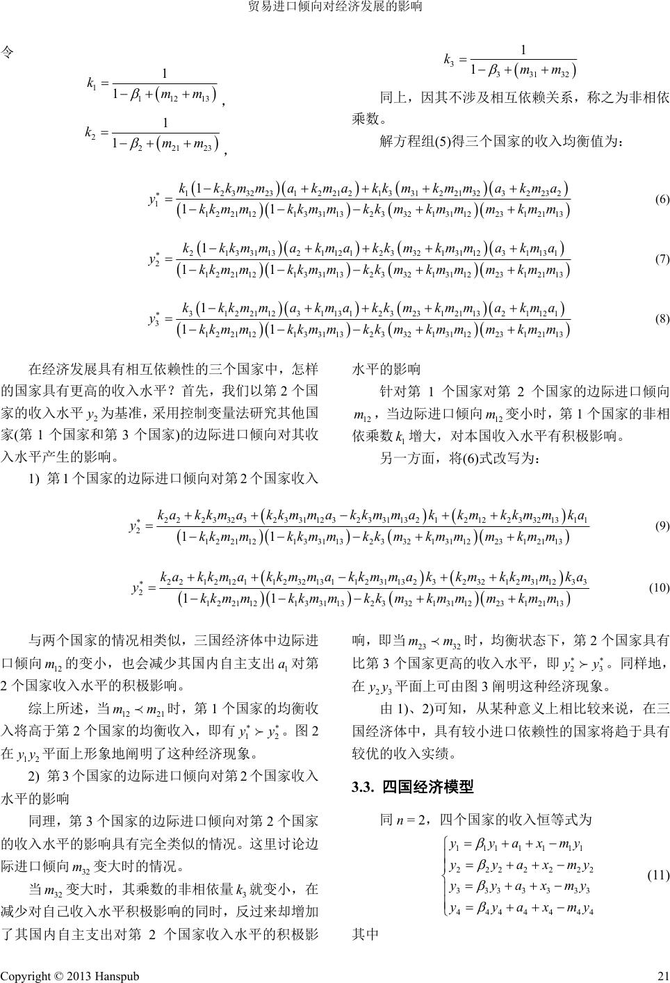 ![]() Business and Globalization 商业全球化, 2013, 1, 18-24 http://dx.doi.org/10.12677/bglo.2013.12004 Published Online October 2013 (http://www.hanspub.org/journal/bglo.html) How Trade Propensity to Import Affects the Economic Development Peiru Chen College of Economics, Jinan University, Guangzhou Email: chenpeiru@126.com Received: Jun. 4th, 2013; revised: Jul. 8th, 2013; accepted: Jul. 19th, 2013 Copyright © 2013 Peiru Chen. This is an open access article distributed under the Creative Commons Attribution License, which permits unrestricted use, distribution, and reproduction in any medium, provided the original work is properly cited. Abstract: Th e relationship between economic develop ment and trade has been one of the co re themes in the international economics research and economic development dependence on the propensity to import is a primary point of its concern. This article studies how trade propensity to import affects the economic devel- opment of all nations. It takes the examples of two nations, three nations and four nations and then develops a symmetric model of economic relations among multiple nations. The results of the study show that the mar- ginal propensity to import plays a decisive role in national income level. Countries with a smaller im- port-dependence tend to obtain a higher income performance. Keywords: Symmetric Analysis; North-South Relations; Equilibrium Income 贸易进口倾向对经济发展的影响 陈培如 暨南大学经济学院,广州 Email: chenpeiru@126.com 收稿日期:2013年6月4日;修回日期:2013年7月8日;录用日期:2013年7月19日 摘 要:经济发展与贸易的关系一直是国际经济学研究的核心主题之一,而各国经济发展对进口倾向 的依赖性更是其关注的重点。本文分别以两国经济体、三国经济体及四国经济体为代表,研究贸易进 口倾向对各国经济发展的影响。通过建立多国经济关系对称模型,对模型均衡解进行分析,揭示开放 经济体中各国经济发展之间的相互依赖性。研究结果表明:在各国收入水平中,边际进口倾向起决定 性作用,即具有较小进口依赖性的国家将趋于具有较高的收入实绩。 关键词:对称分析法;南北关系;均衡收入 1. 引言 改革开放后,中国贸易出口增速不断加快,大大 高于同期 GDP 的增长速度,是世界上贸易出口增速 最快的国家之一[1,2]。但是,中国不同行业的贸易量差 距颇大,服务业出口量小,且层次较低[3-5],而加工制 造业方面中国是出口大国[6,7]。 自从“贸易与经济增长的关系”在上个世纪 30 年代首次由代罗伯逊提出后,很快就成为经济学家关 注的热点问题之一[8]。研究方法主要有用经典计量模 型做实证研究[9]、可变参数模型[ 10]、外贸乘数模型[11]、 对称分析法[12]等。本文以对称分析法为基础,建立多 国经济关系对称模型来研究贸易进口倾向对经济发 Copyright © 2013 Hanspub 18 ![]() 贸易进口倾向对经济发展的影响 展的影响。 发展中国家传统经济与发达国家现代市场经济 是两个发展水平不同的经济系统,前者通常被称为 “南方经济”,而后者被称为“北方经济”,这也是划 分世界经济的一种常用方法[12]。在用经济模型分析南 北方不同经济体系之间关系的过程中,经济学家曾提 出对称方法(或对称模型),即把两个区域视为在同一 个基本结构中按同一个模型运行,但两区域的具体参 数有区别。在对称模型中,将南北方视为简单的凯恩 斯开放经济进行贸易,一般地说,北方较高的初始收 入水平导致较低的进口倾向,进而支持着北方持续的 较高收入水平。保持北方具有较高收入水平的决定性 因素也成为了发展中国家发展本国经济的指导力量。 本文将对“南–北”经济关系问题进行推广,采 用对称模型的分析方法,建立 n国经济关系对称模型, 通过探讨更一般的国与国经济之间的相互作用以考 察贸易进口倾向对各国经济发展的影响。 2. 模型的假设条件和符号说明 2.1. 假设条件 在此简单模型中,我们不考虑货币市场,也不考 虑汇率问题; 这n个国家是在同一个基本结构中按同一个模型 运行,但 n个国家的具体参数有区别,即这 n个 国家的经济是对称的; 这n个国家之间相互进行贸易,每一个国家生产 其他国家需求并可以进口的商品,它们或者作为 消费品,或者作为中间商品; 这n个国家均存在失业,产品的增加是可能的。 2.2. 符号说明 符号说明,如表1。 3. n(n = 2, 3, 4)国经济对称模型的建立 3.1. 两国经济模型 设第 1个国家的收入恒等式为: 111111 yyaxm 1 y 类似地,第 2个国家的收入恒等式为: 222222 yyaxm Table 1. Definition of the research variables 表1. 符号说明 变量 定义 i y 第i个国家的收入 i 第i个国家的边际消费倾向 i a用于第 i个国家产出的实际自主支出 (包括投资、政府购买和自主消费等) i x 第i个国家的实际出口 ij x 第i个国家向第 j个国家的实际出口 i m第i个国家的边际进口倾向 ij m第i个国家向第 j个国家的边际进口倾向 在两个国家的情况下,有 112 22 mm mm 1 这时,有 1111 2222 ykax ykax 其中, 1112 1 1 km ,222 1 1 km 1 2 1 分别是这两 个国家的开放经济乘数。 因为第 1个国家的出口是第2个国家的进口,第 2个国家的出口是第 1个国家的进口,两个国家间具 有明显的依赖性,这时 121 212 x my x my 于是,有 1111212121 222212121 yyamymy yyamym 2 y 整理,得 11212121 12 122122 1 1 mymya mym ya (1) 求得两个国家收入的均衡值为 1 11 1 22112 2 22 1 22112 1 1 k ya kkm m k ya kkm m 2212 1121 kma kma (2) 2 y Copyright © 2013 Hanspub 19 ![]() 贸易进口倾向对经济发展的影响 这里的 1112 1 1 km 和222 1 1 km 1 并不涉 