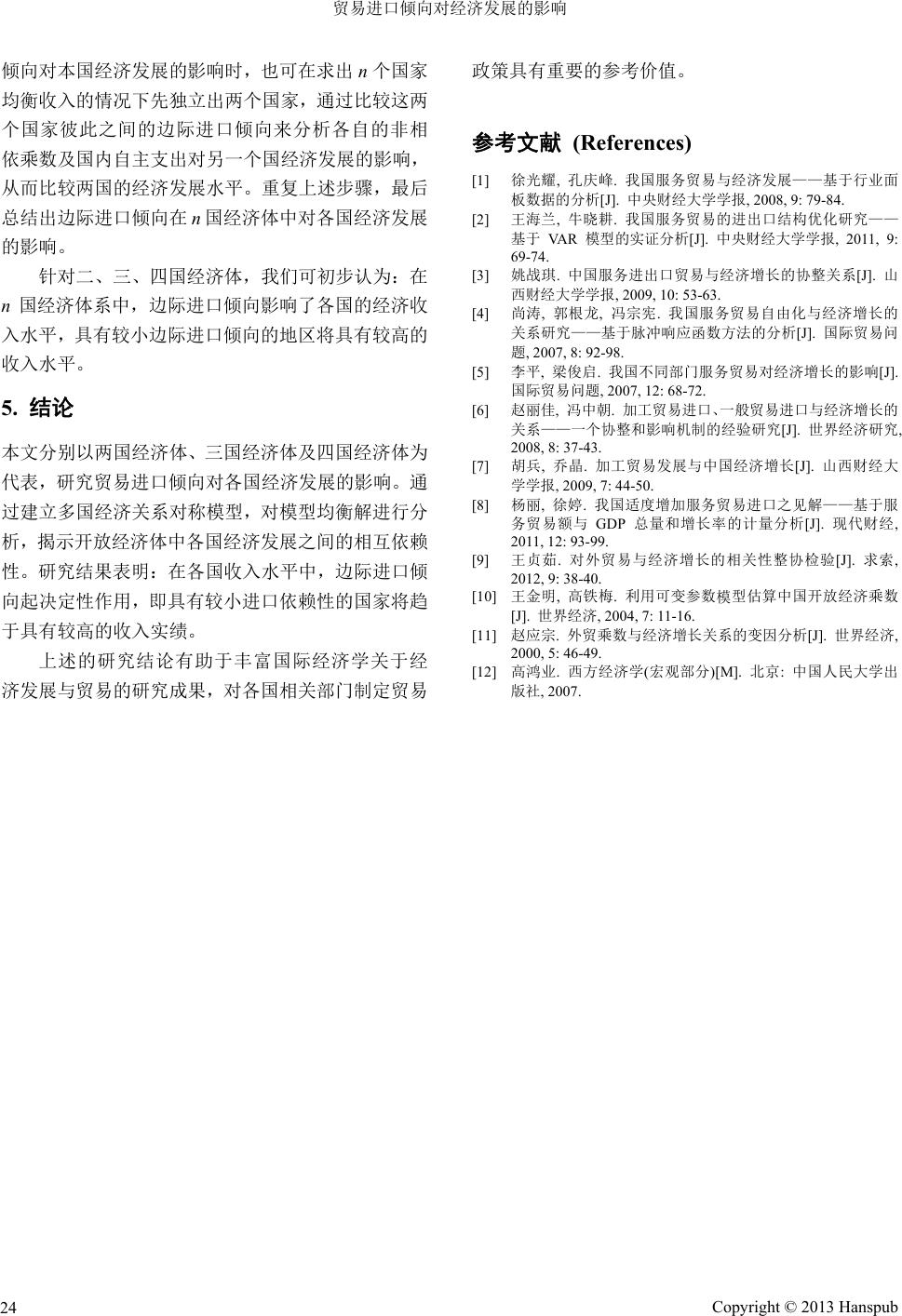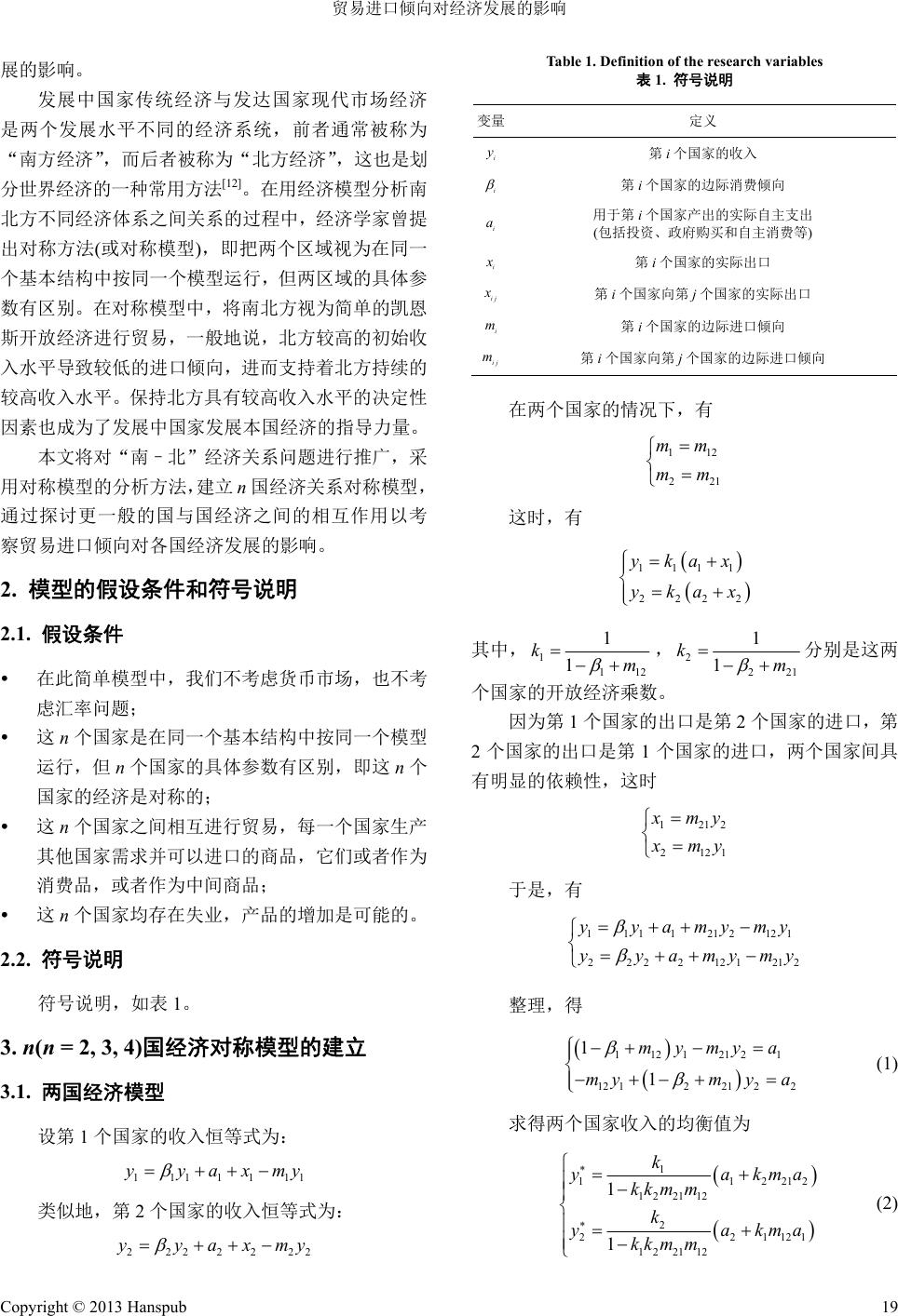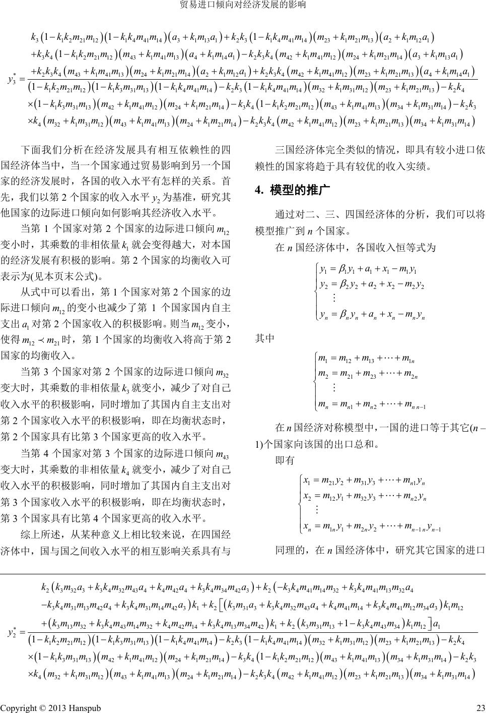 ![]() Business and Globalization 商业全球化, 2013, 1, 18-24 http://dx.doi.org/10.12677/bglo.2013.12004 Published Online October 2013 (http://www.hanspub.org/journal/bglo.html) How Trade Propensity to Import Affects the Economic Development Peiru Chen College of Economics, Jinan University, Guangzhou Email: chenpeiru@126.com Received: Jun. 4th, 2013; revised: Jul. 8th, 2013; accepted: Jul. 19th, 2013 Copyright © 2013 Peiru Chen. This is an open access article distributed under the Creative Commons Attribution License, which permits unrestricted use, distribution, and reproduction in any medium, provided the original work is properly cited. Abstract: Th e relationship between economic develop ment and trade has been one of the co re themes in the international economics research and economic development dependence on the propensity to import is a primary point of its concern. This article studies how trade propensity to import affects the economic devel- opment of all nations. It takes the examples of two nations, three nations and four nations and then develops a symmetric model of economic relations among multiple nations. The results of the study show that the mar- ginal propensity to import plays a decisive role in national income level. Countries with a smaller im- port-dependence tend to obtain a higher income performance. Keywords: Symmetric Analysis; North-South Relations; Equilibrium Income 贸易进口倾向对经济发展的影响 陈培如 暨南大学经济学院,广州 Email: chenpeiru@126.com 收稿日期:2013年6月4日;修回日期:2013年7月8日;录用日期:2013年7月19日 摘 要:经济发展与贸易的关系一直是国际经济学研究的核心主题之一,而各国经济发展对进口倾向 的依赖性更是其关注的重点。本文分别以两国经济体、三国经济体及四国经济体为代表,研究贸易进 口倾向对各国经济发展的影响。通过建立多国经济关系对称模型,对模型均衡解进行分析,揭示开放 经济体中各国经济发展之间的相互依赖性。研究结果表明:在各国收入水平中,边际进口倾向起决定 性作用,即具有较小进口依赖性的国家将趋于具有较高的收入实绩。 关键词:对称分析法;南北关系;均衡收入 1. 引言 改革开放后,中国贸易出口增速不断加快,大大 高于同期 GDP 的增长速度,是世界上贸易出口增速 最快的国家之一[1,2]。但是,中国不同行业的贸易量差 距颇大,服务业出口量小,且层次较低[3-5],而加工制 造业方面中国是出口大国[6,7]。 自从“贸易与经济增长的关系”在上个世纪 30 年代首次由代罗伯逊提出后,很快就成为经济学家关 注的热点问题之一[8]。研究方法主要有用经典计量模 型做实证研究[9]、可变参数模型[ 10]、外贸乘数模型[11]、 对称分析法[12]等。本文以对称分析法为基础,建立多 国经济关系对称模型来研究贸易进口倾向对经济发 Copyright © 2013 Hanspub 18 ![]() 贸易进口倾向对经济发展的影响 展的影响。 发展中国家传统经济与发达国家现代市场经济 是两个发展水平不同的经济系统,前者通常被称为 “南方经济”,而后者被称为“北方经济”,这也是划 分世界经济的一种常用方法[12]。在用经济模型分析南 北方不同经济体系之间关系的过程中,经济学家曾提 出对称方法(或对称模型),即把两个区域视为在同一 个基本结构中按同一个模型运行,但两区域的具体参 数有区别。在对称模型中,将南北方视为简单的凯恩 斯开放经济进行贸易,一般地说,北方较高的初始收 入水平导致较低的进口倾向,进而支持着北方持续的 较高收入水平。保持北方具有较高收入水平的决定性 因素也成为了发展中国家发展本国经济的指导力量。 本文将对“南–北”经济关系问题进行推广,采 用对称模型的分析方法,建立 n国经济关系对称模型, 通过探讨更一般的国与国经济之间的相互作用以考 察贸易进口倾向对各国经济发展的影响。 2. 模型的假设条件和符号说明 2.1. 假设条件 在此简单模型中,我们不考虑货币市场,也不考 虑汇率问题; 这n个国家是在同一个基本结构中按同一个模型 运行,但 n个国家的具体参数有区别,即这 n个 国家的经济是对称的; 这n个国家之间相互进行贸易,每一个国家生产 其他国家需求并可以进口的商品,它们或者作为 消费品,或者作为中间商品; 这n个国家均存在失业,产品的增加是可能的。 2.2. 符号说明 符号说明,如表1。 3. n(n = 2, 3, 4)国经济对称模型的建立 3.1. 两国经济模型 设第 1个国家的收入恒等式为: 111111 yyaxm 1 y 类似地,第 2个国家的收入恒等式为: 222222 yyaxm Table 1. Definition of the research variables 表1. 符号说明 变量 定义 i y 第i个国家的收入 i 第i个国家的边际消费倾向 i a用于第 i个国家产出的实际自主支出 (包括投资、政府购买和自主消费等) i x 第i个国家的实际出口 ij x 第i个国家向第 j个国家的实际出口 i m第i个国家的边际进口倾向 ij m第i个国家向第 j个国家的边际进口倾向 在两个国家的情况下,有 112 22 mm mm 1 这时,有 1111 2222 ykax ykax 其中, 1112 1 1 km ,222 1 1 km 1 2 1 分别是这两 个国家的开放经济乘数。 因为第 1个国家的出口是第2个国家的进口,第 2个国家的出口是第 1个国家的进口,两个国家间具 有明显的依赖性,这时 121 212 x my x my 于是,有 1111212121 222212121 yyamymy yyamym 2 y 整理,得 11212121 12 122122 1 1 mymya mym ya (1) 求得两个国家收入的均衡值为 1 11 1 22112 2 22 1 22112 1 1 k ya kkm m k ya kkm m 2212 1121 kma kma (2) 2 y Copyright © 2013 Hanspub 19 ![]() 贸易进口倾向对经济发展的影响 这里的 1112 1 1 km 和222 1 1 km 1 并不涉 