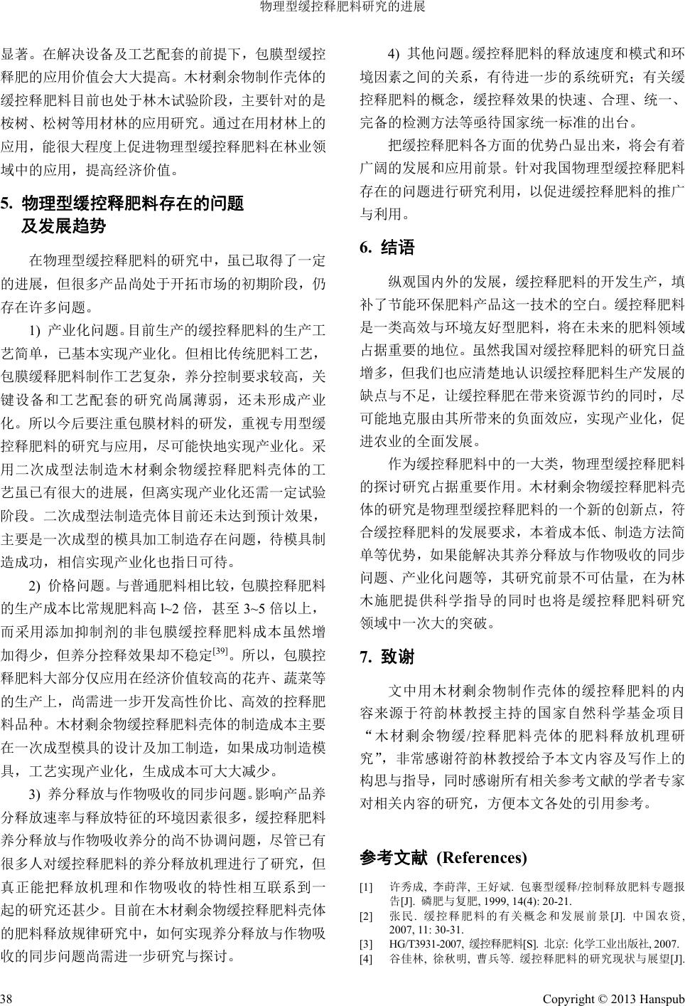 ![]() World Journal of Forestry 林业世界, 2013, 2, 35-39 http://dx.doi.org/10.12677/wjf.2013.24007 Published Online October 2013 (http://www.hanspub.org/journal/wjf.html) Prospect for Physical Type Slow/Controlled Release Fertilizers Jinying Jia n g , Yunlin Fu* Forestry College of Guang x i U n i v e rsity, Nanning Email: fylin@126.com Received: Aug. 26th, 2013; revised: Sep. 9th, 2013; accepted: Sep. 13th, 2013 Copyright © 2013 Jinying Jiang, Yunlin Fu. This is an open access article distributed under the Creative Commons Attribution License, which permits unrestricted use, distribution, and reproduction in any medium, provided the original w ork is properly cited. Abstract: Physical type slow/controlled release fertilizers described in the article mainly consisted of coated slow/controlled release fertilizers and slow/controlled release fertilizers which were made by wood residue. This article introdu ced research status of coated slow/controlled release fertilizers. Research contents and basis of wood residue slow/controlled release fertilizers were stated and social meaning of this study was also dis- cussed. Application in forestry area, presence problems and developing trend in recent years of physical type slow/controlled release fertilizers were summarized. This offered reference for further study on slow/controlled release fertilizers, and it provided scientific guidance for this study to achieve industrialization development. Keywords: Physical Type Slow/Controlled Release Fertilizers; Coated Slow/Controlled Release Fertilizers; Slow/Controlled Release Fertilizers Shell 物理型缓控释肥料研究的进展 姜金英,符韵林* 广西大学林学院,南宁 Email: fylin@126.com 收稿日期:2013 年8月26 日;修回日期:2013 年9月9日;录用日期:2013 年9月13 日 摘 要:文中所述的物理型缓控释肥料主要包括包膜缓控释肥料及用木材剩余物制作壳体的缓控释肥 料两种。主要介绍了包膜缓控释肥料的研究现状,阐述了木材剩余物缓控释肥料壳体的研究内容、依 据及该研究的社会意义。概述了物理型缓控释肥料在林业领域上的应用,近年来物理型缓控释肥料存 在的问题及发展趋势,以期为缓控释肥料的进一步研究提供参考,为该研究实现产业化发展提供科学 指导。 关键词:物理型缓控释肥料;包膜缓控释肥料;缓控释肥料壳体 1. 引言 缓控释肥料养分利用率高、施肥次数少、环境污 染小等优点,符合环境友好型社会的需求,是我国及 世界肥料发展的重要方向。2005 年,世界缓控释肥料 的生产、销量已达到 120 万吨[1]。近年来,我国政府 鼓励并支持缓控释肥料的开发和应用。2006 年2月, 国务院颁布的《国家中长期科学和技术发展规划纲要 (2006~2020)》中明确提出“重点研究开发环保型肥料, 专用复型缓控释肥料及施肥技术”[2]。因此,研究并 推广高效环保的缓控释肥料的任务刻不容缓。 *通讯作者。 Copyright © 2013 Hanspub 35 ![]() 物理型缓控释肥料研究的进展 缓控释肥料是以各种调控机制使养分最初释放 延缓,延长植物对其有效养分吸收利用的有效期,使 其养分按照设定的释放率和释放期缓慢或控制释放 的肥料[3],其分类方法很多,其中一种是将其分为物 理型、化学型及物理化学型三类,物理型缓控释肥料 是通过简单的物理过程处理使肥料具有缓控性,大多 为包膜肥料,一般通过加热、喷涂、干燥等手段在肥 料颗粒表面喷涂一层或几层惰性物质,形成致密的低 渗透性膜,以控制水进入肥料核心及养分溶液从膜内 向外扩散的速度,进而延缓肥料中养分的释放速度[4]。 本文主要介绍包膜型缓控释肥料及用木材剩余物制 作壳体的缓控释肥料两种物理型缓控释肥料。 2. 包膜缓控释肥料 2.1. 制备工艺与技术探索研究现状 自1924 年脲醛肥料取得专利以来,缓释肥料已 有很大进步,近年来又发展到可控释肥料,而且有一 部分已实际应用于农业生产中。70年代以后,国内外 对缓控释肥料的研究日益增多。包膜缓控释肥料在生 产制造技术方面发展迅速,当前主要研究工作集中在 包膜材料的选用、养分释放机理和肥料评价方法三方 面的研究[5]。我国最早的缓释肥料是中科院南京土壤 研究所于 1973 年成功研制的钙镁磷肥包膜的长效碳 酸氢铵[6]。近年来,有关可降解的环保型的缓释肥料 的研究日益增多。我国研发缓控释肥料的历史已将近 有40 年,在包膜材料的选择、包膜工艺的开发上已 取得可喜的进展,已有小批量的产品打入市场[7],但 发展速度和研发水平同发达国家相比还是相差甚远。 1961 年,美国 TVA 公司首先成功研制出硫磺包 膜尿素(SCU),随后,美国ADM 公司于 1964 年开发 了以热固性树脂为包膜的聚合物包膜肥料,并实现了 工业化生产[8]。张玉龙等[9]在添加无机矿物材料下, 用天然高分子化合物溶液为粘结剂,制成涂膜材料, 用该涂膜材料包裹尿素制成缓释肥料。王碧等[10]以甲 醛为交联剂,甘油作增塑剂,采用溶液共混法制成明 胶/葡甘聚糖/聚乙烯醇缓释尿素包膜。 尽管以上所述的包膜肥料达到了缓控释效果,但 包膜材料的难降解可能会给环境造成负面的影响。为 减少对环境的污染,Hanafi M. M., et al.[11]提出利用可 降解的材料来制造缓控释肥料的包膜。随后,可降解 包膜缓控释肥料成了发展方向。王晓君[12]制成能自然 降解的聚合物包膜材料。Modabber Ahmed Khan et al.[13]利用尿素和废旧报纸制成缓释肥料。 2.2. 养分的释放机理研究现状 包膜肥料释放机理受包膜材料类型及水分、温度 等环境因素的影响。 在包膜材料的特性方面,1993年1995年Goer